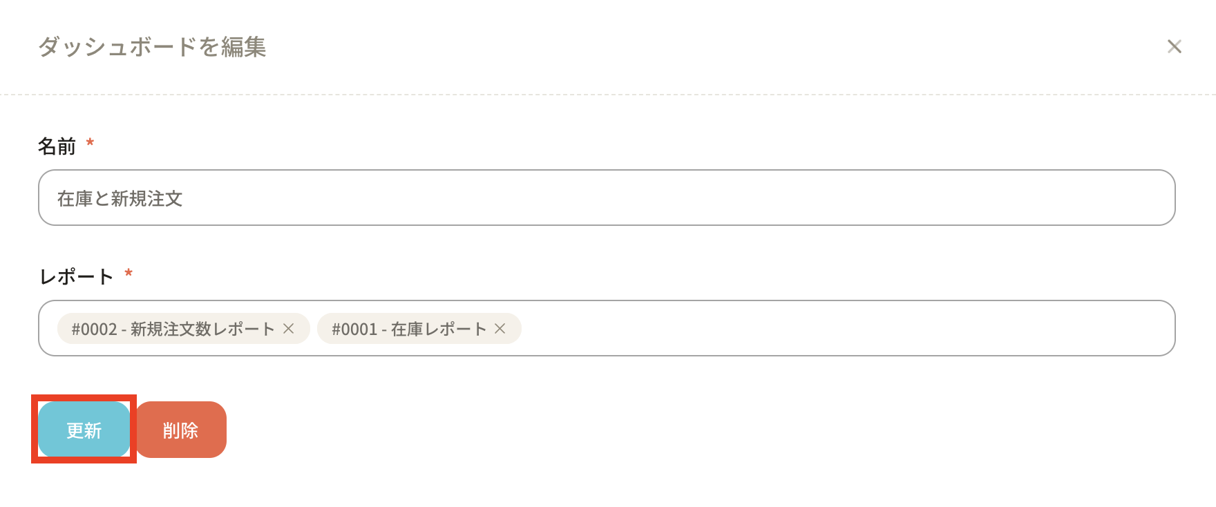 ④Next, the "Edit Dashboard" screen will be displayed, so modify the contents and press the "Update" button to update. At this time, press the "Delete" button to delete it.
