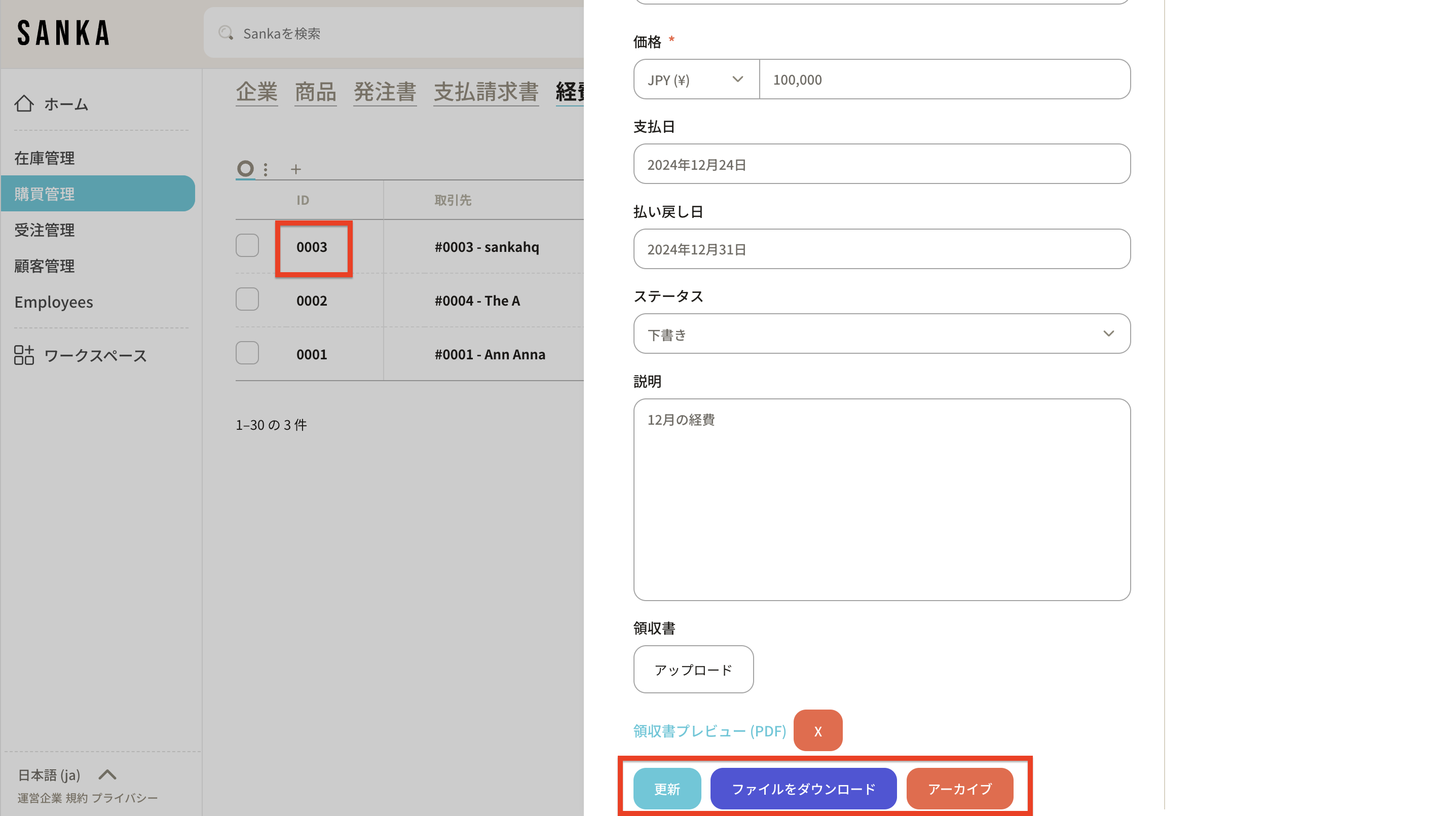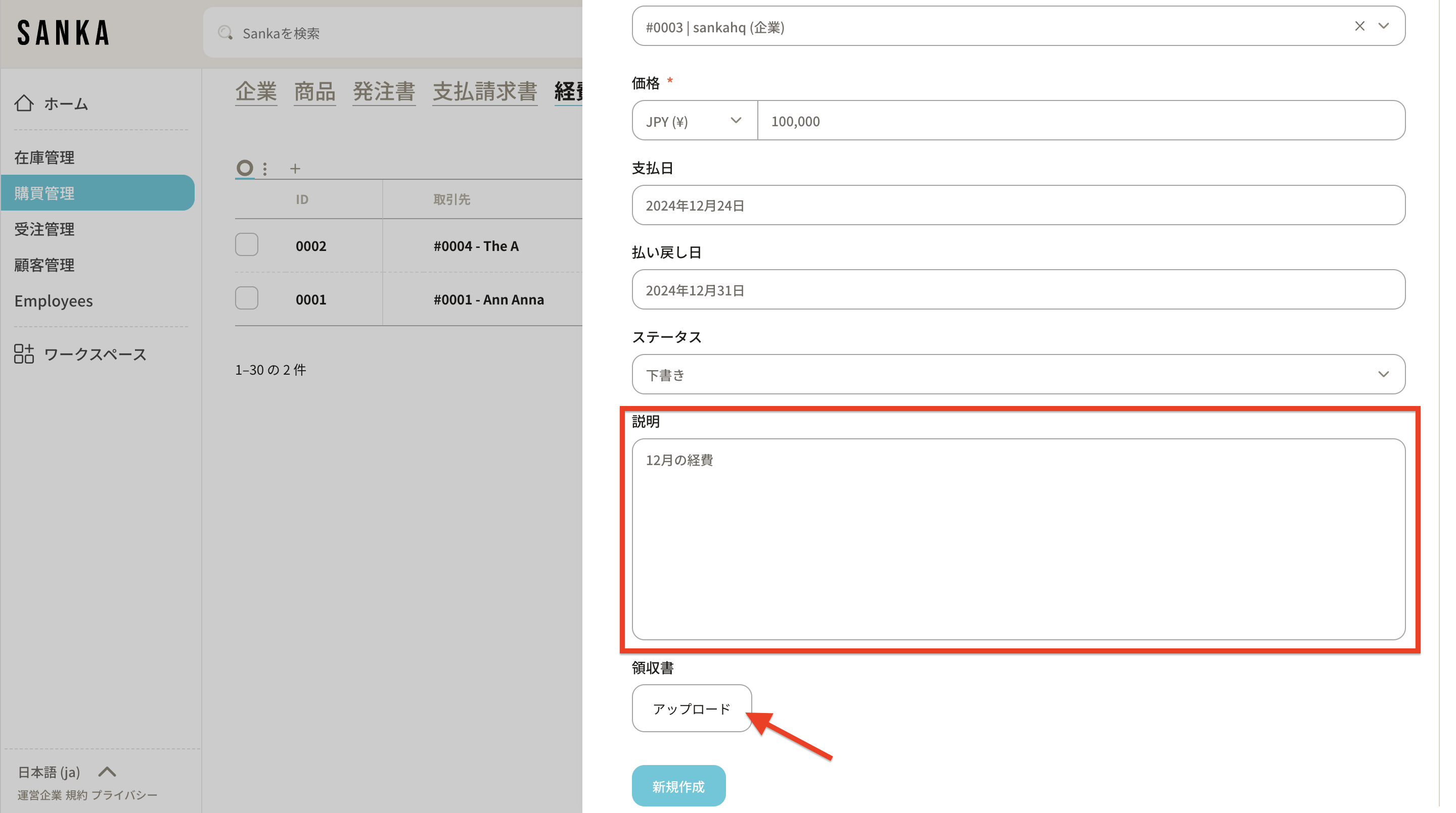 8: You can add an expense file by entering an expense description and optionally clicking the upload button and selecting a file from your local disk.