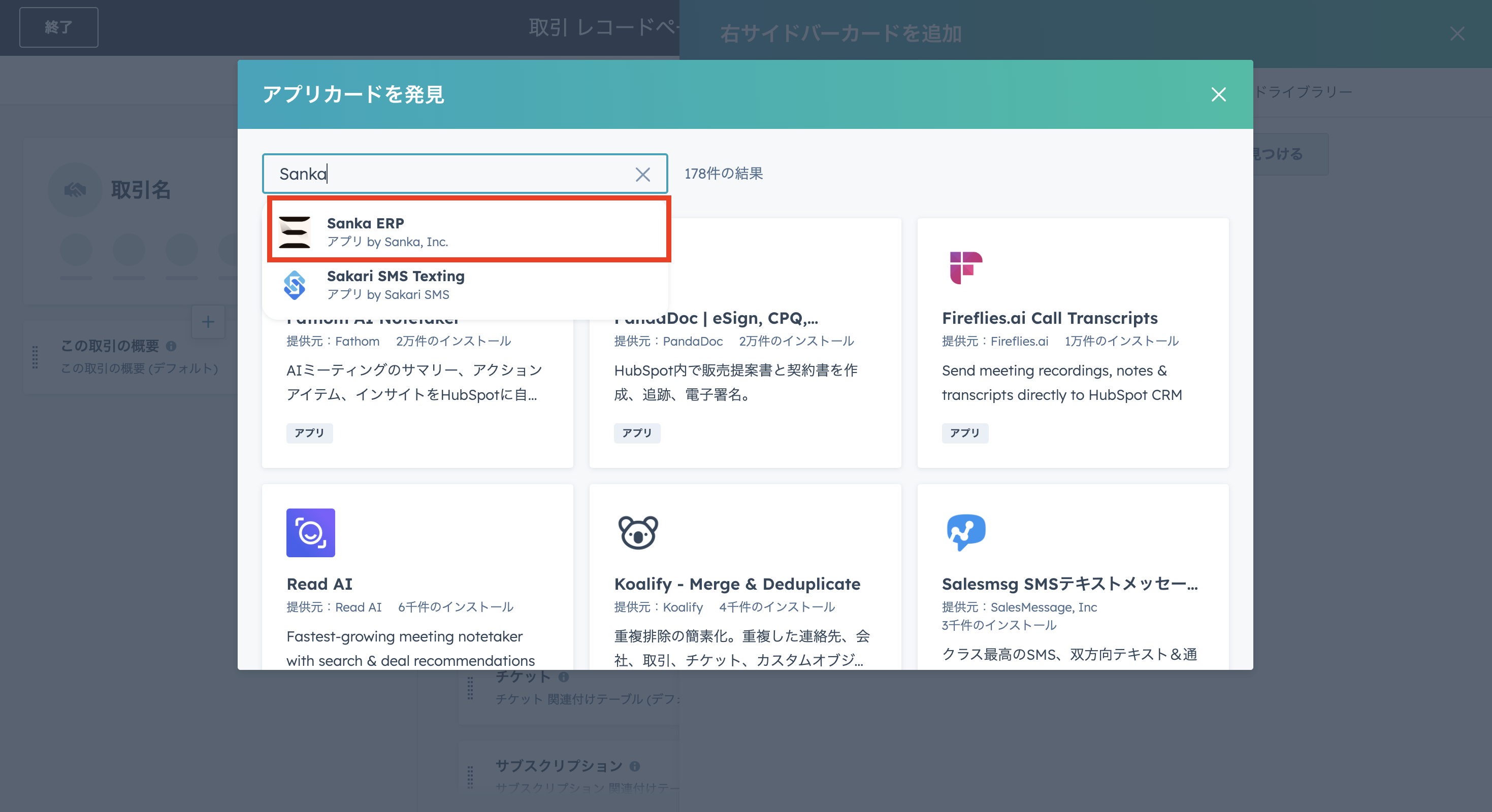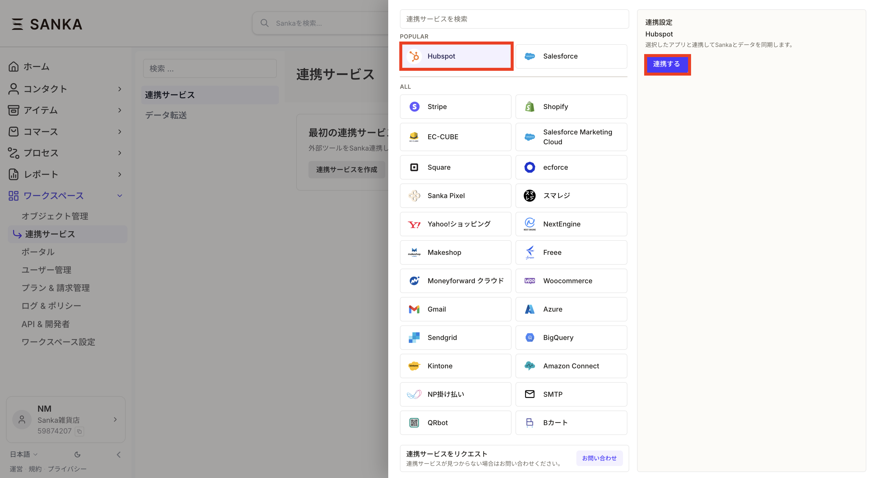 ③ A list of all applications you can connect to Sanka is shown. Select HubSpot and click the Connect button.