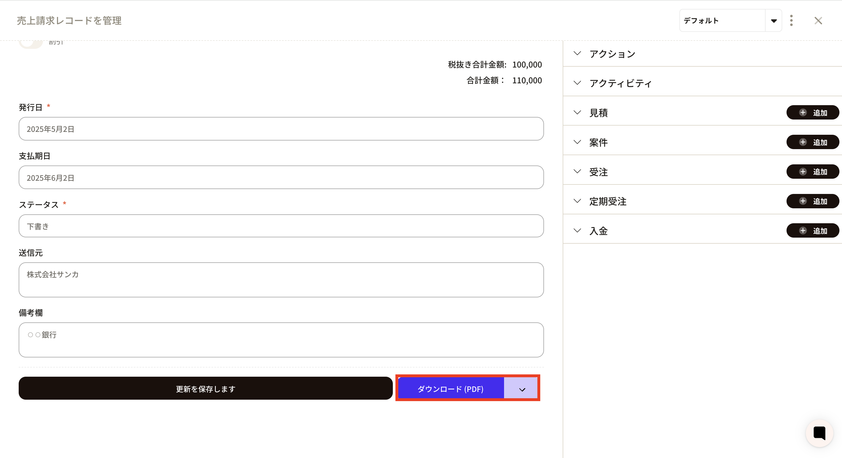 ⑯The Manage Sales Invoice Records screen will appear, so you can download the sales invoice by clicking Download PDF at the bottom.