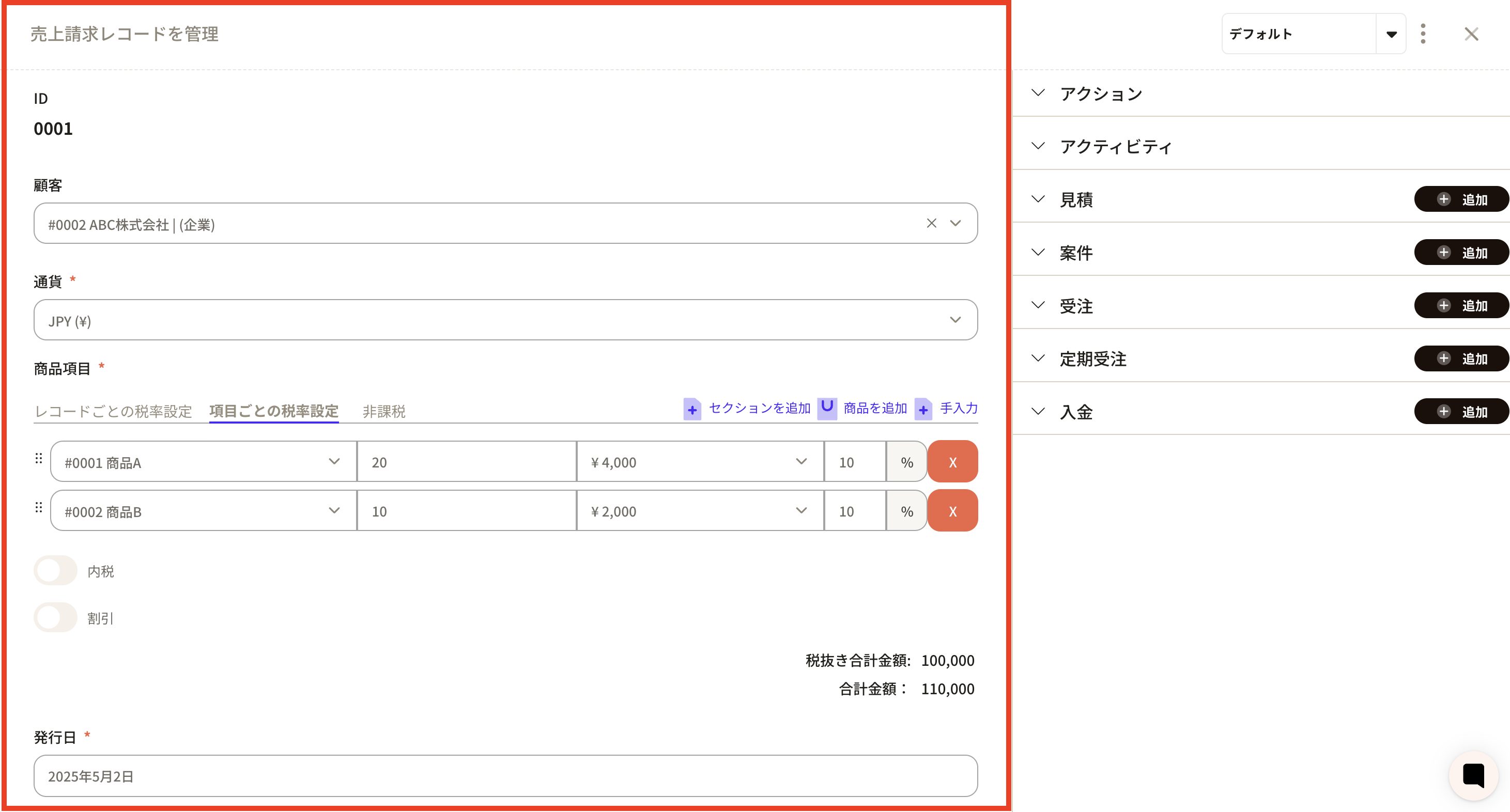 ⑩ "Issuance date" and "Payment date" will default to the date when the record was created and the date one month after that, but if you click on the frame, a calendar will appear, so you can set it freely.