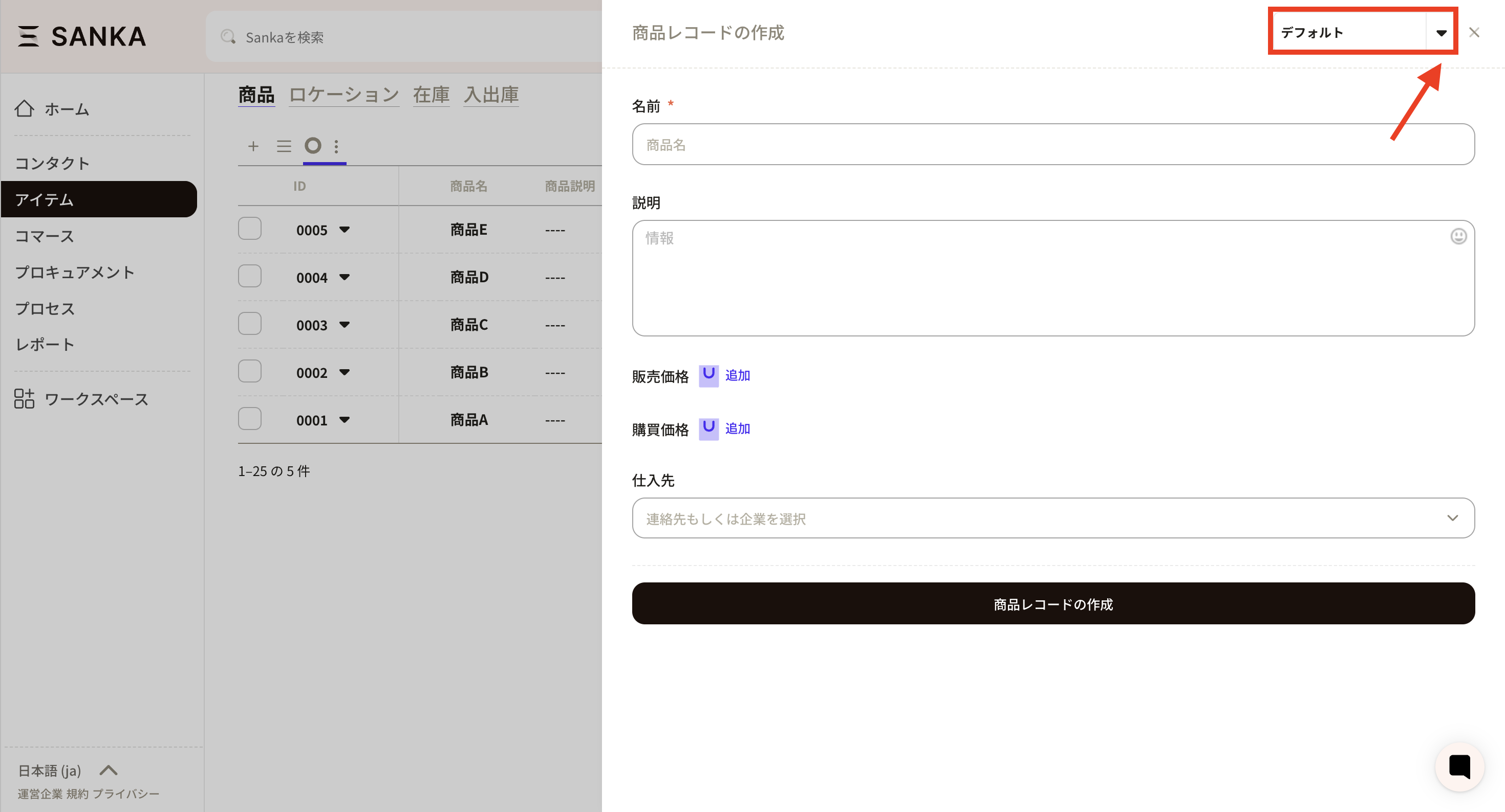 ⑦Press the triangle button next to Default at the top right of the "Create Product Record Screen". Initially, the default settings are set.