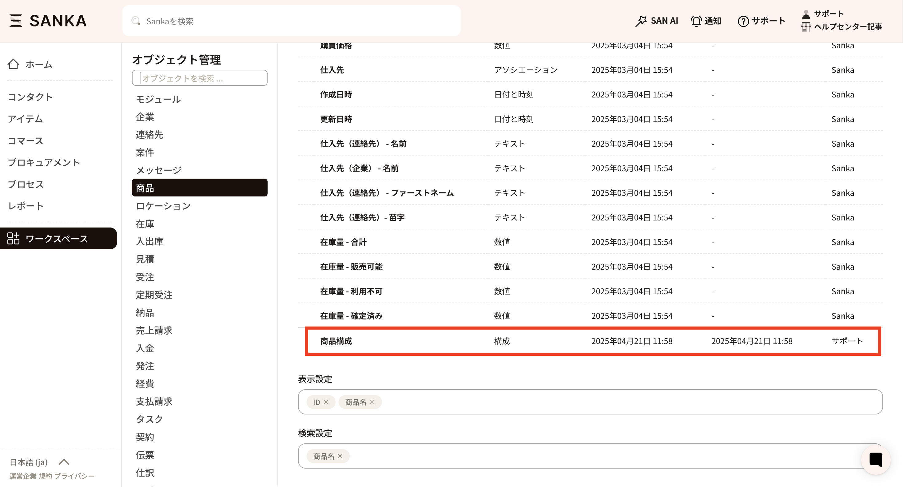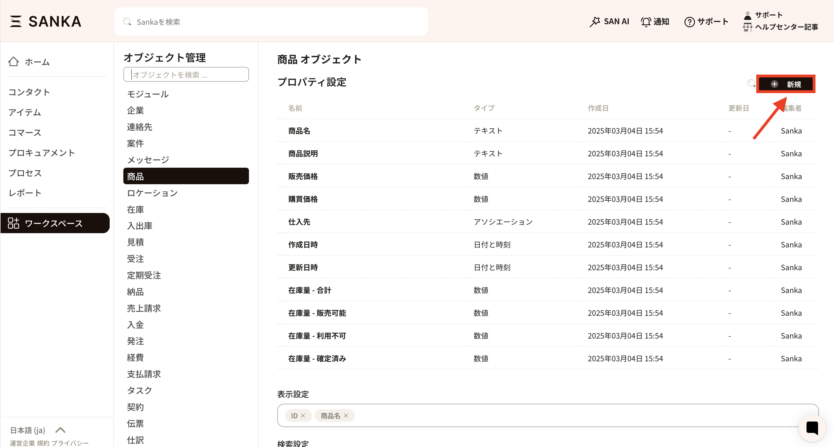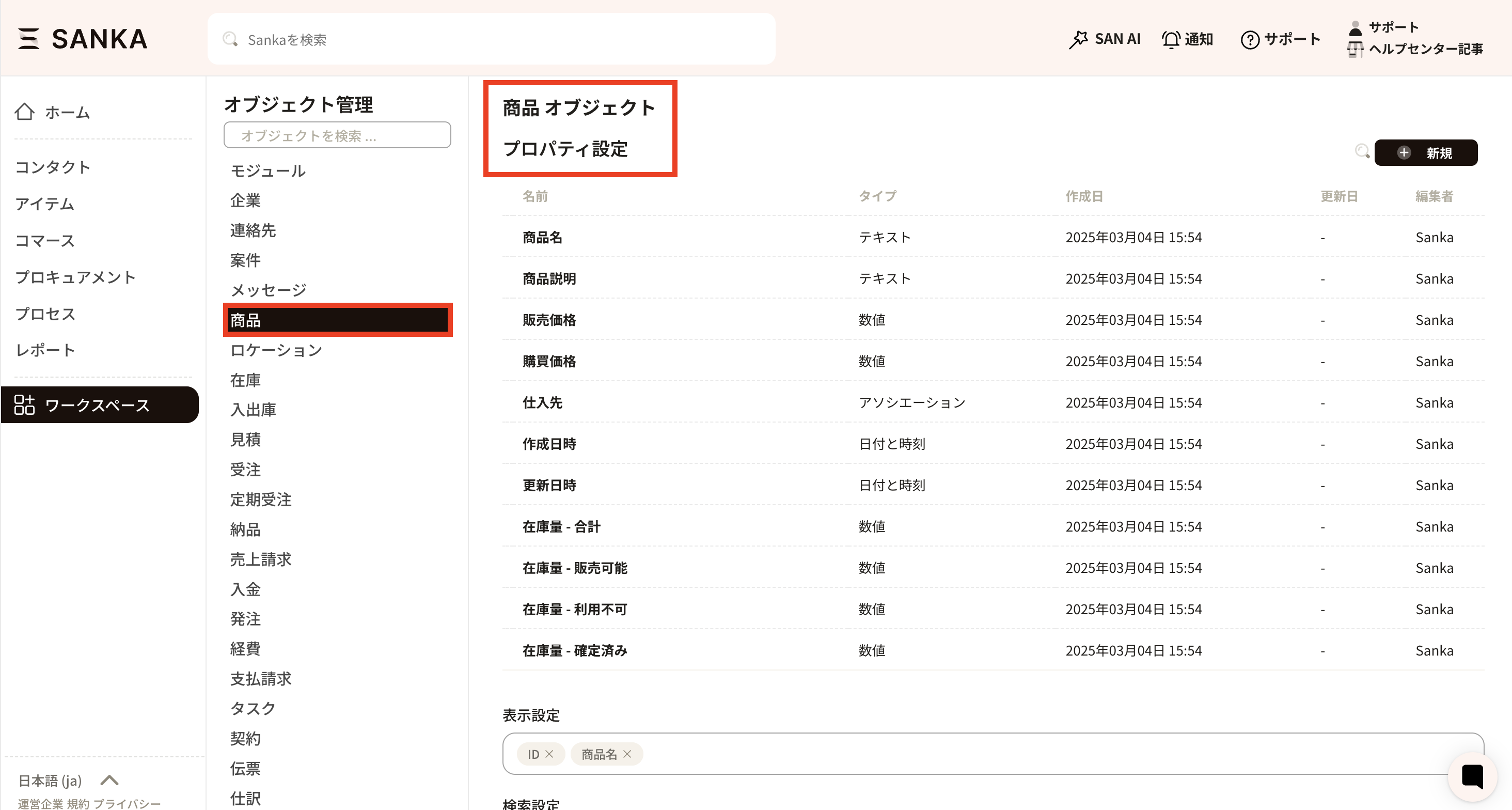 ② Select "Product" from the "Object Management" menu to display the properties (management items) currently set for the product object.
