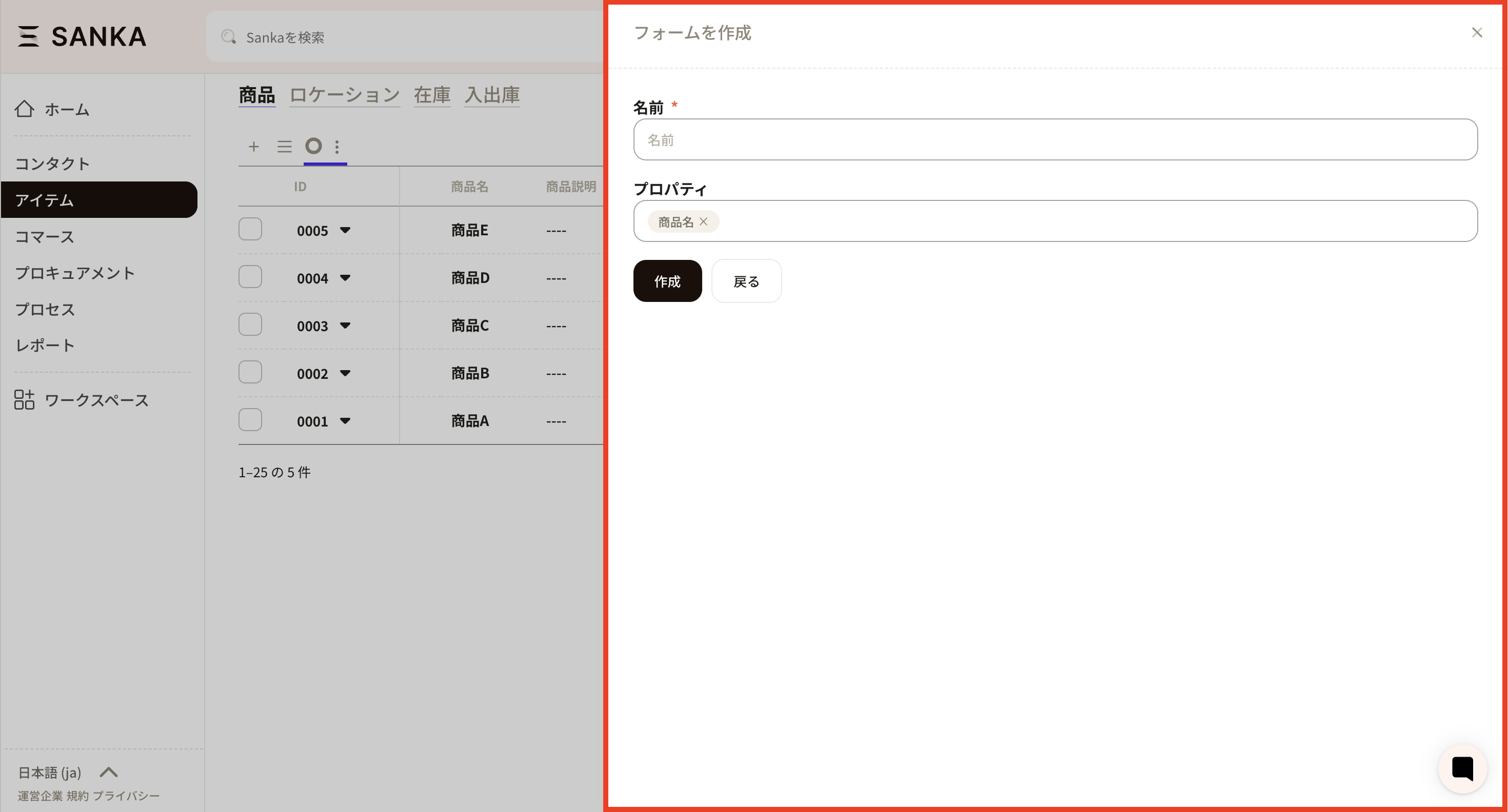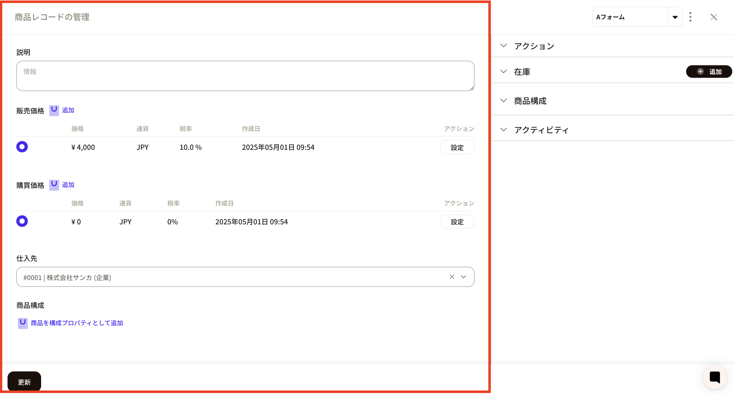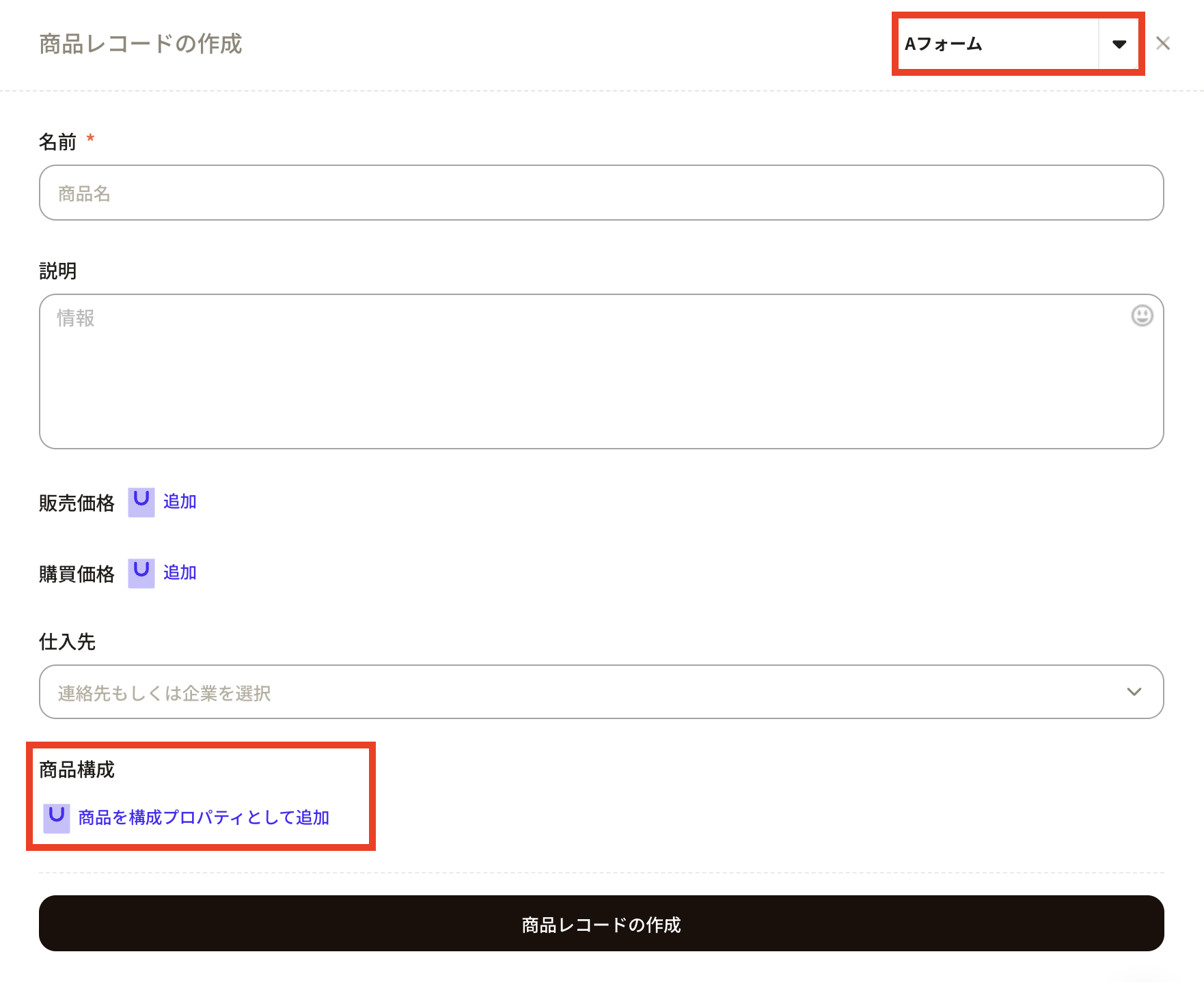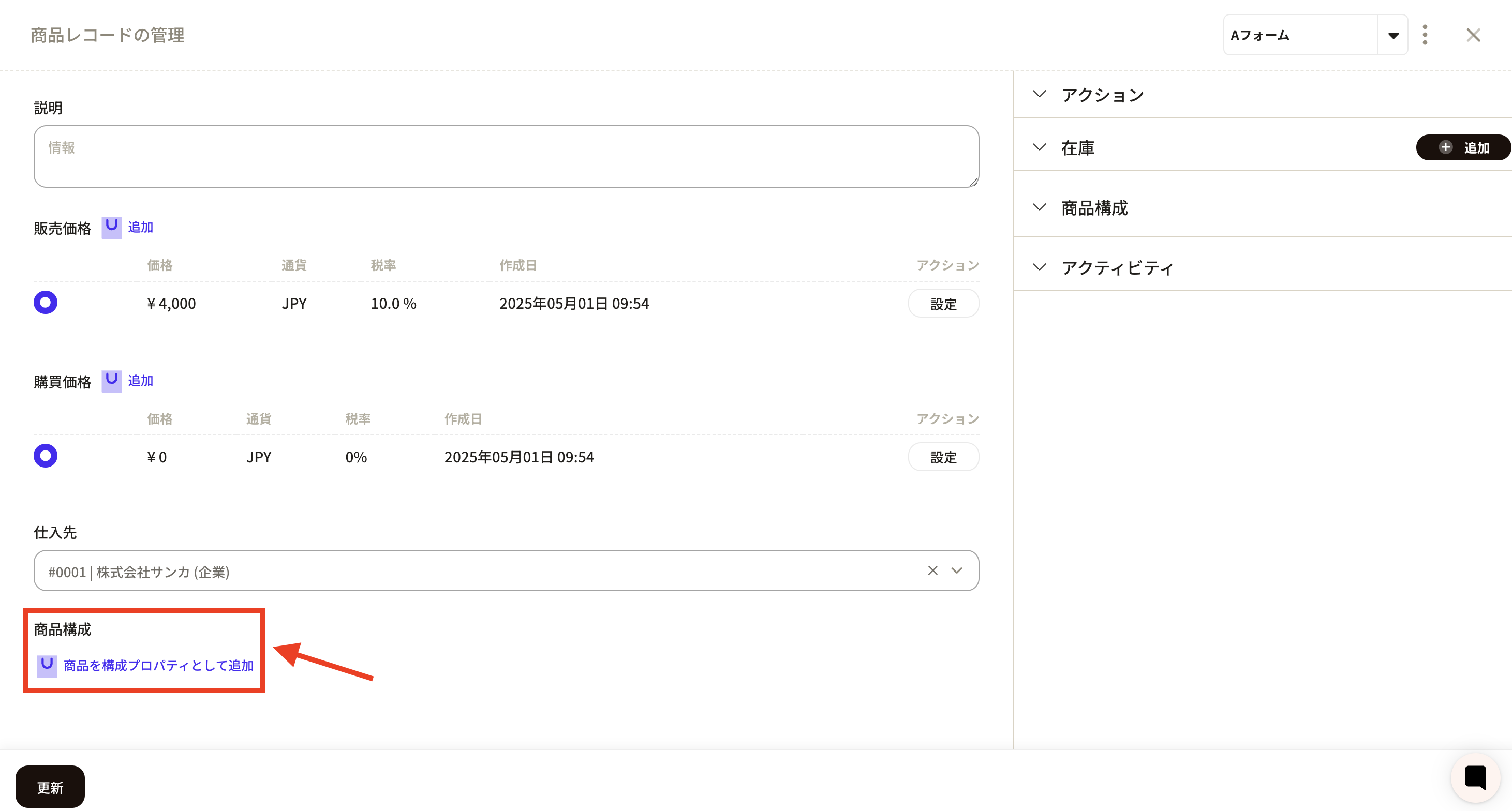 ⑫ Click the new registration button from the product object and click the form name you just created to confirm that the product configuration property has been added.