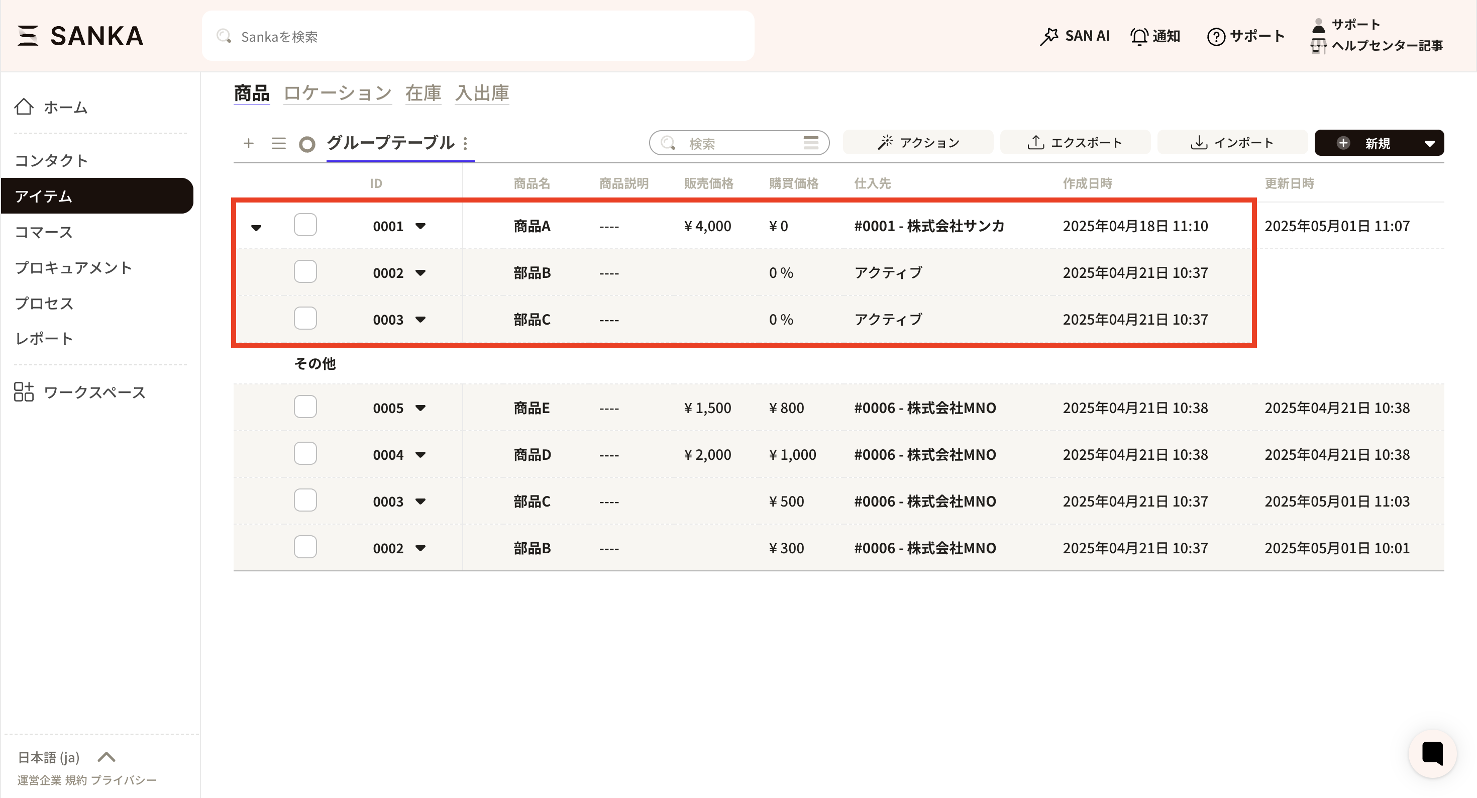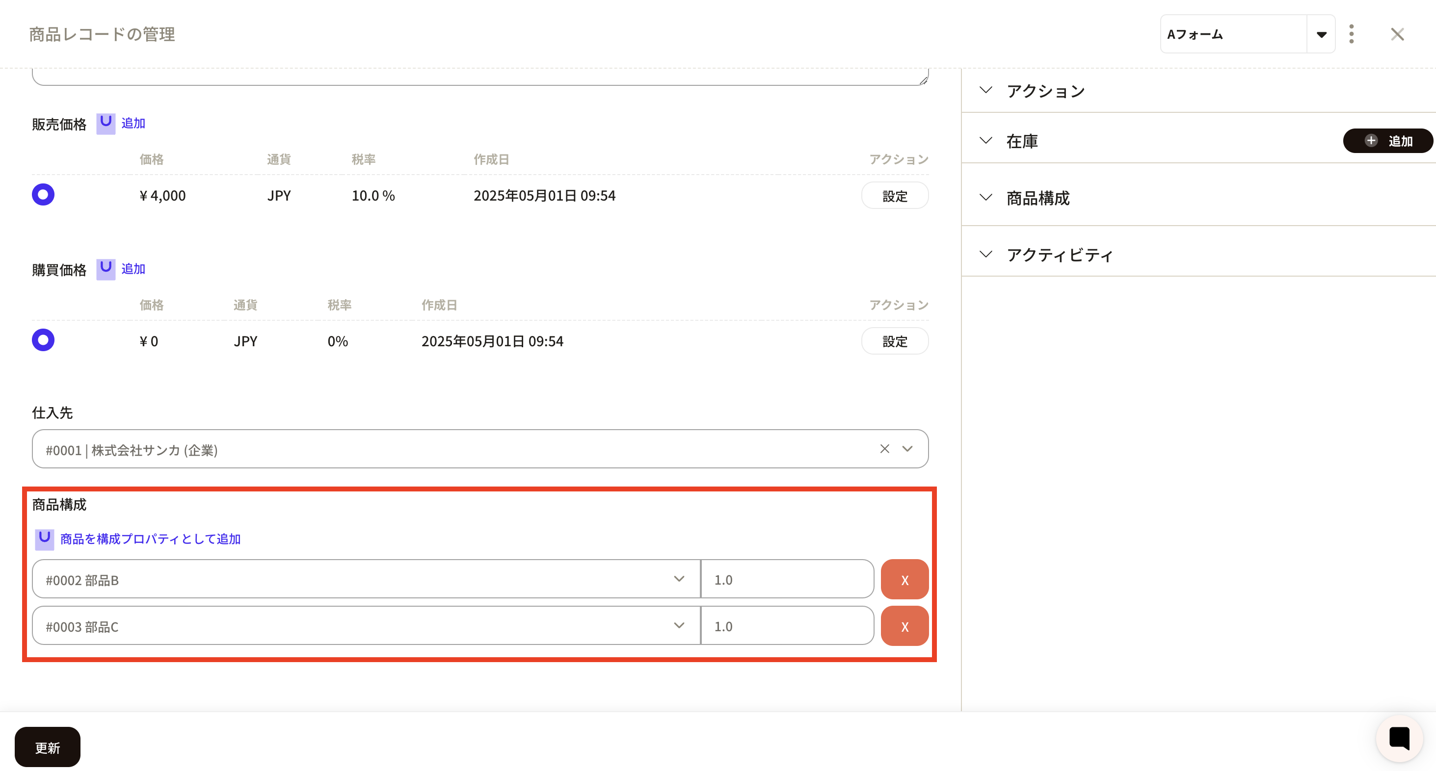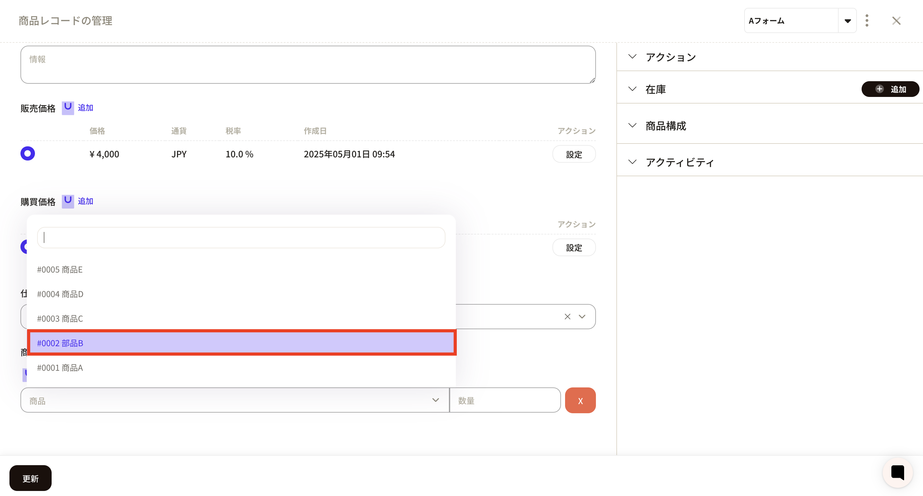 ④ A frame for linking product configurations will appear, so enter the product and quantity to be linked. When you click on the product frame, already registered product records will be displayed and you can select the appropriate product. Here we selected part B.