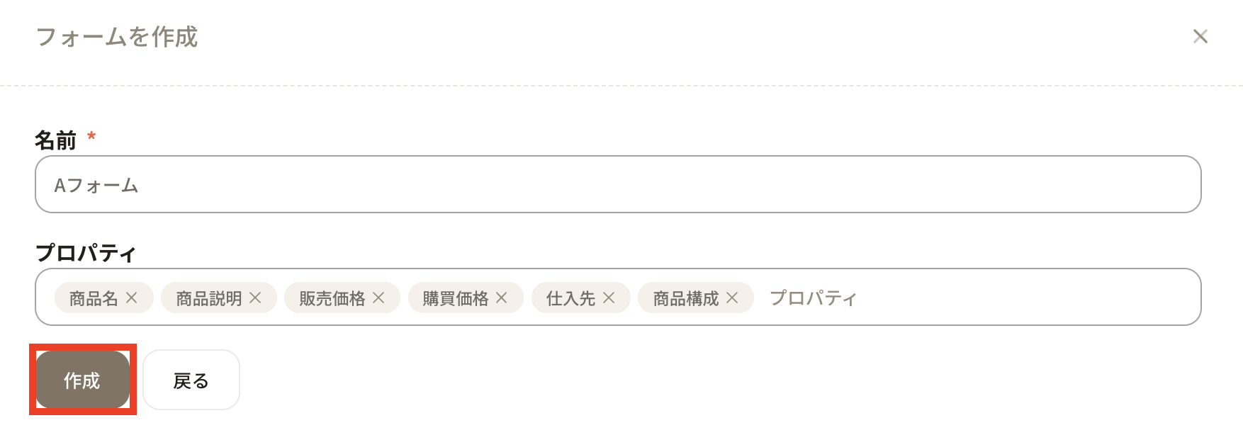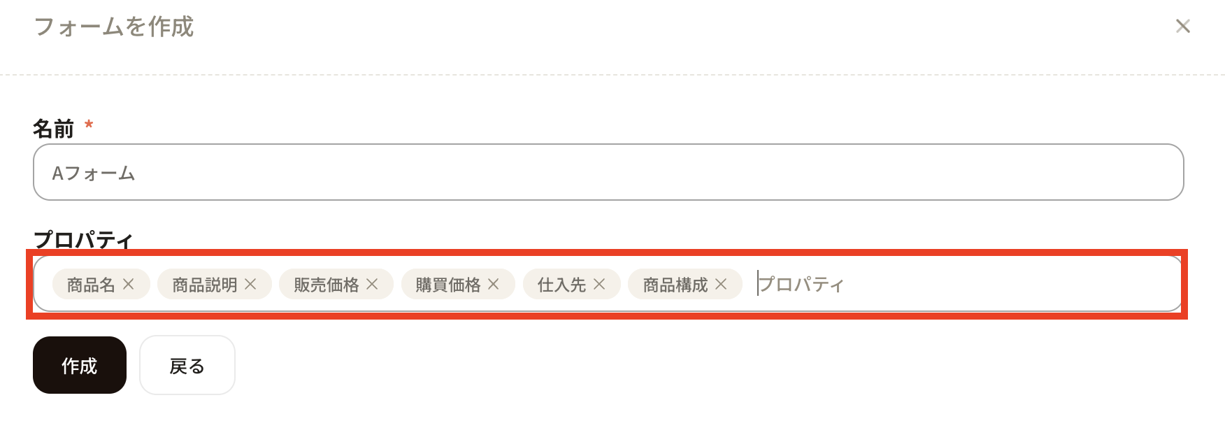 ⑩Enter the name of the form. Properties that have been added so far are displayed. Let's select the appropriate one.