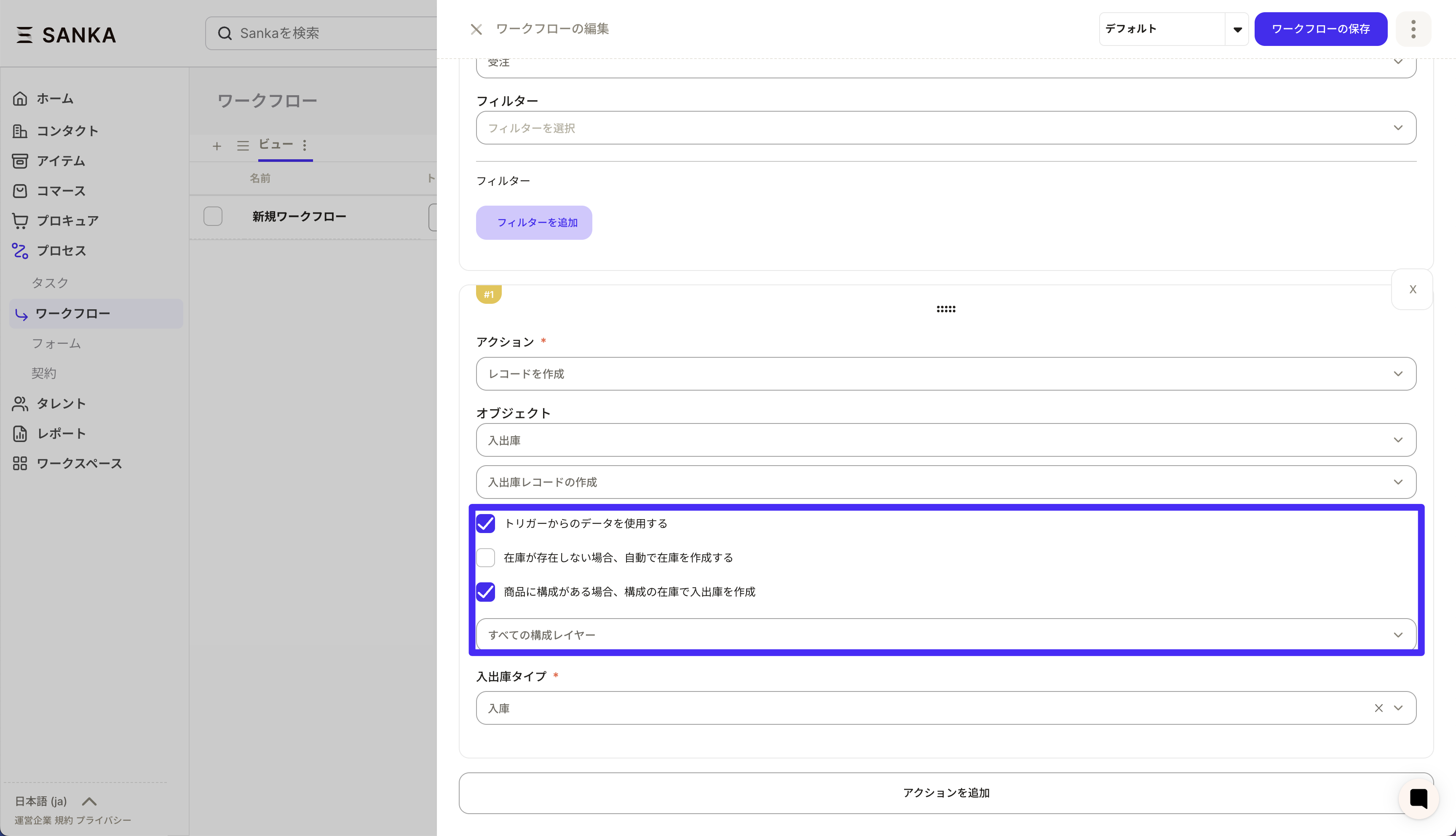 ⑥Click the save button for the workflow and it will be registered in the workflow record list. Next, press the Run Workflow button to start the workflow. Inventory will now be reserved every time a sales order is imported.