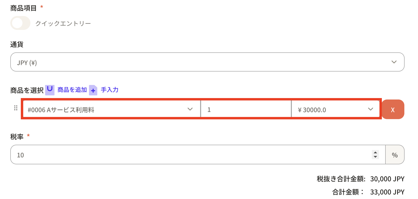 A frame for the product item will be added, so set the necessary information. Select the product, enter the quantity and tax rate, and the total amount will be automatically calculated. When you click the "Currency" frame, a list of currencies will be displayed, so select the appropriate one.