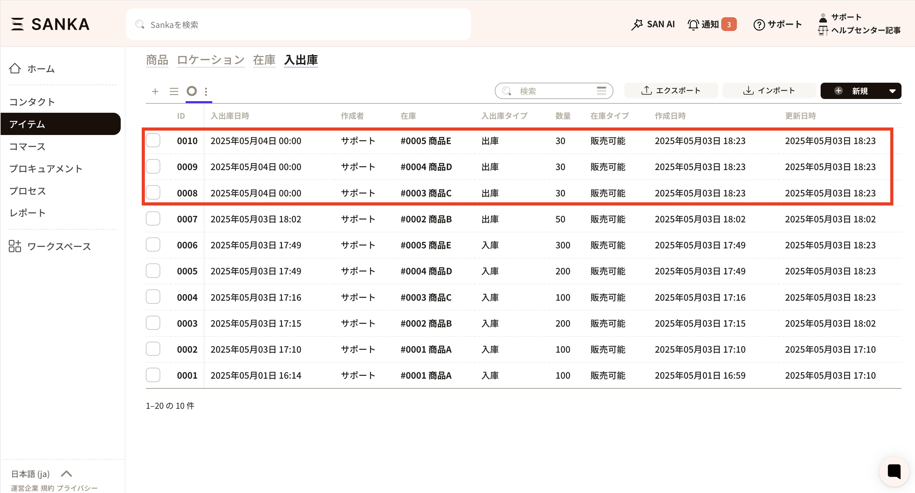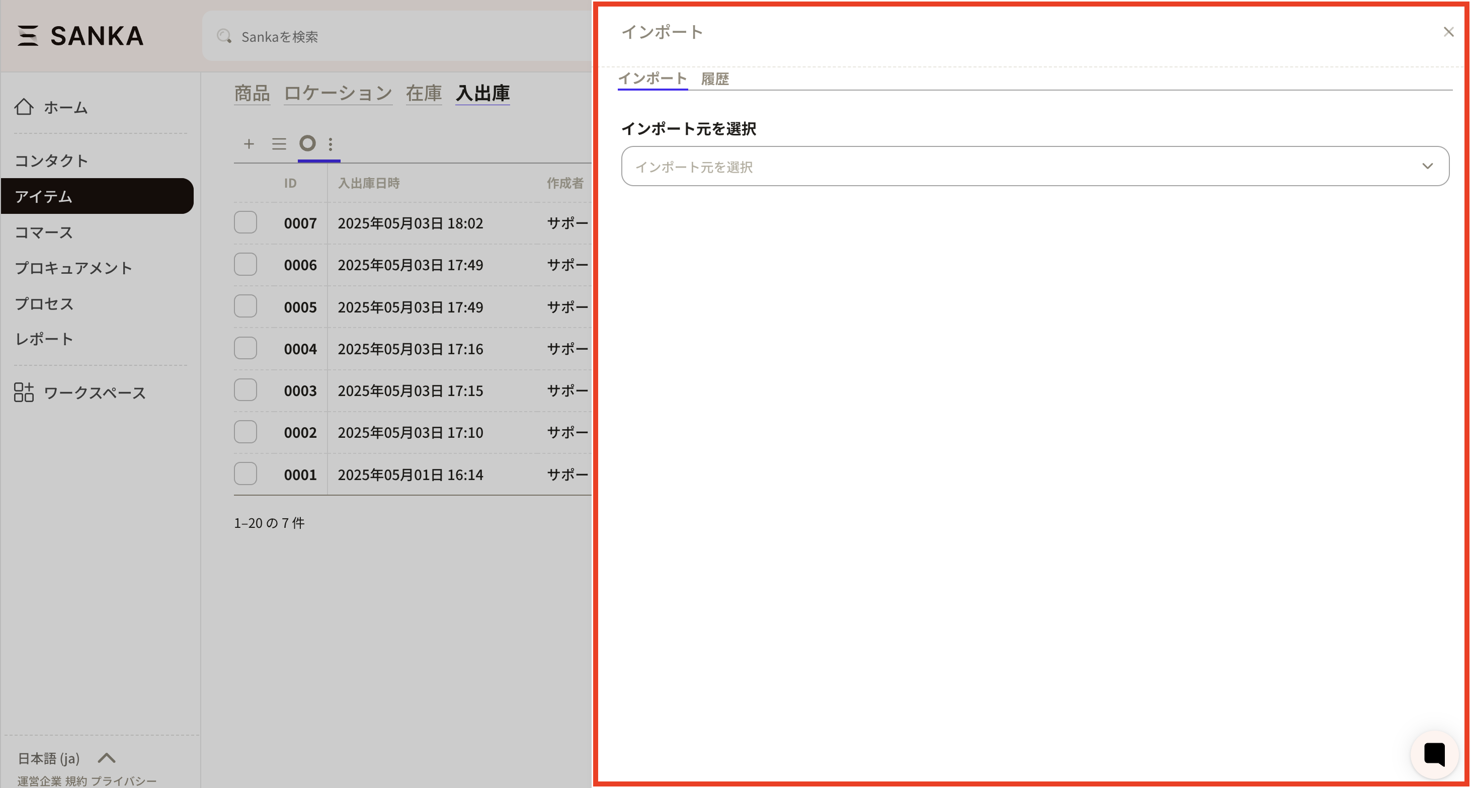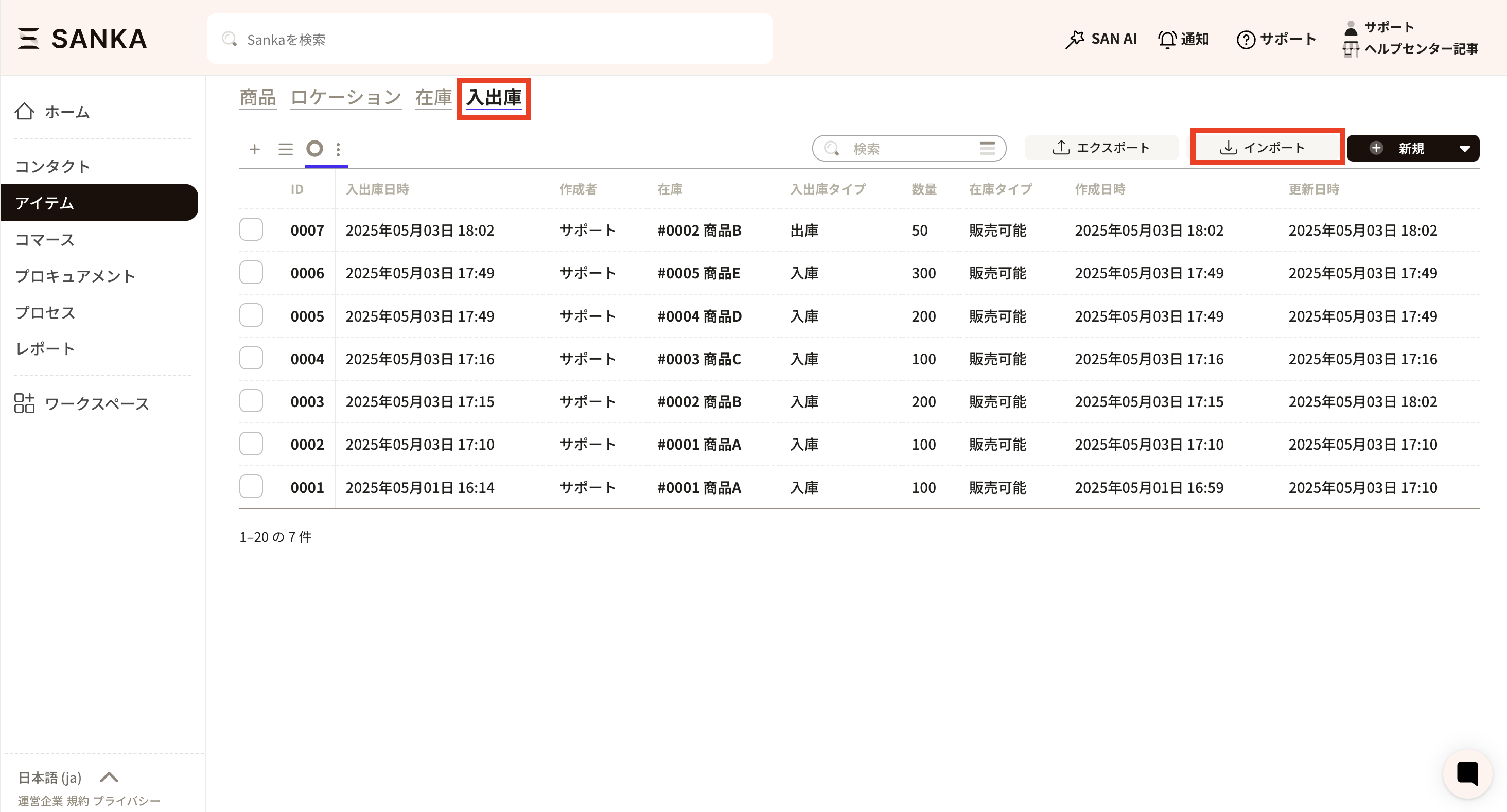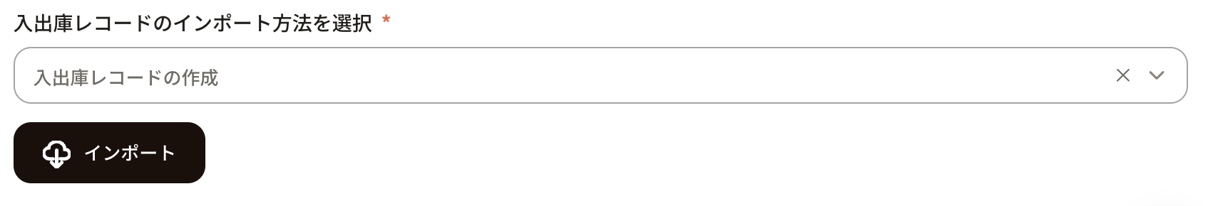 ⑧つづいて「入出庫のインポート方法」では、今回は新規レコード作成のため「入出庫レコードの作成」を選択します。下部にあるインポートボタンを押すと登録されます。
