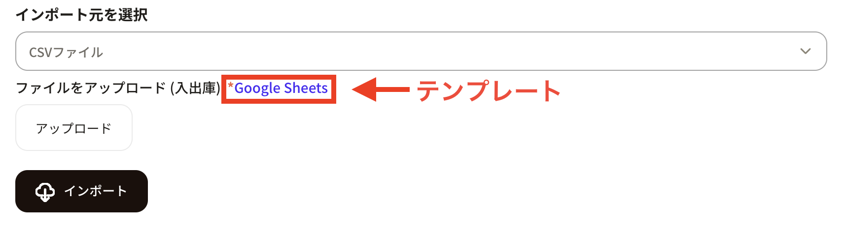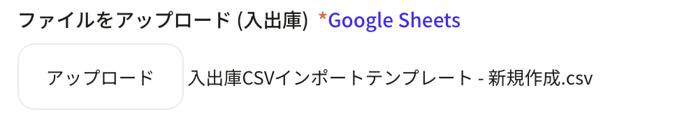 ③「インポート元を選択」でCSVファイルを選択すると「ファイルをアップロード」の項目が現れて、同時にSankaが用意した「入出庫CSVインポートテンプレート」が表示されます。
