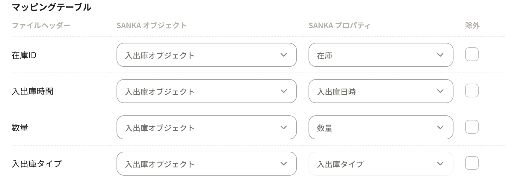 ⑦CSVファイルをアップロードするとマッピングテーブルが表示されるので、情報を調整します。CSVファイルヘッダーがSANKAプロパティのどれにあたるかを設定します。SANKAオブジェクトは「入出庫オブジェクト」のままにしておきます。
