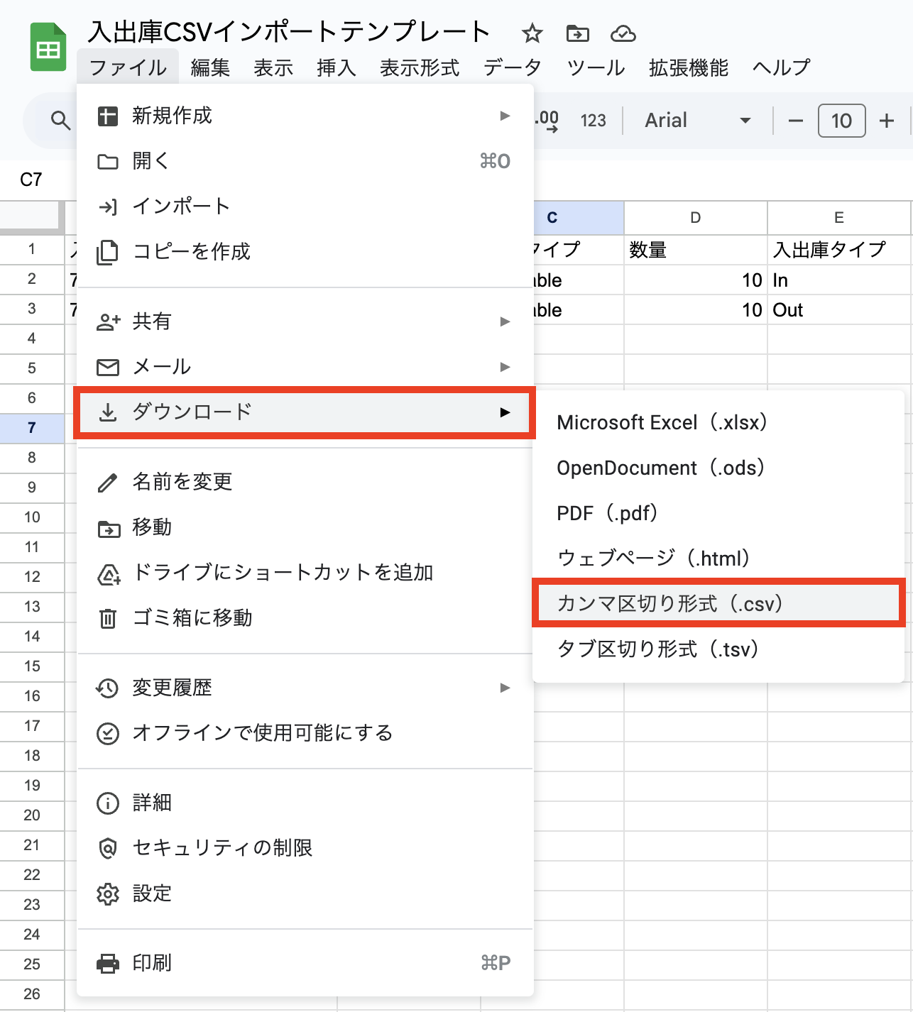 ④まずは「入出庫CSVインポートテンプレート」をダウンロードします。
