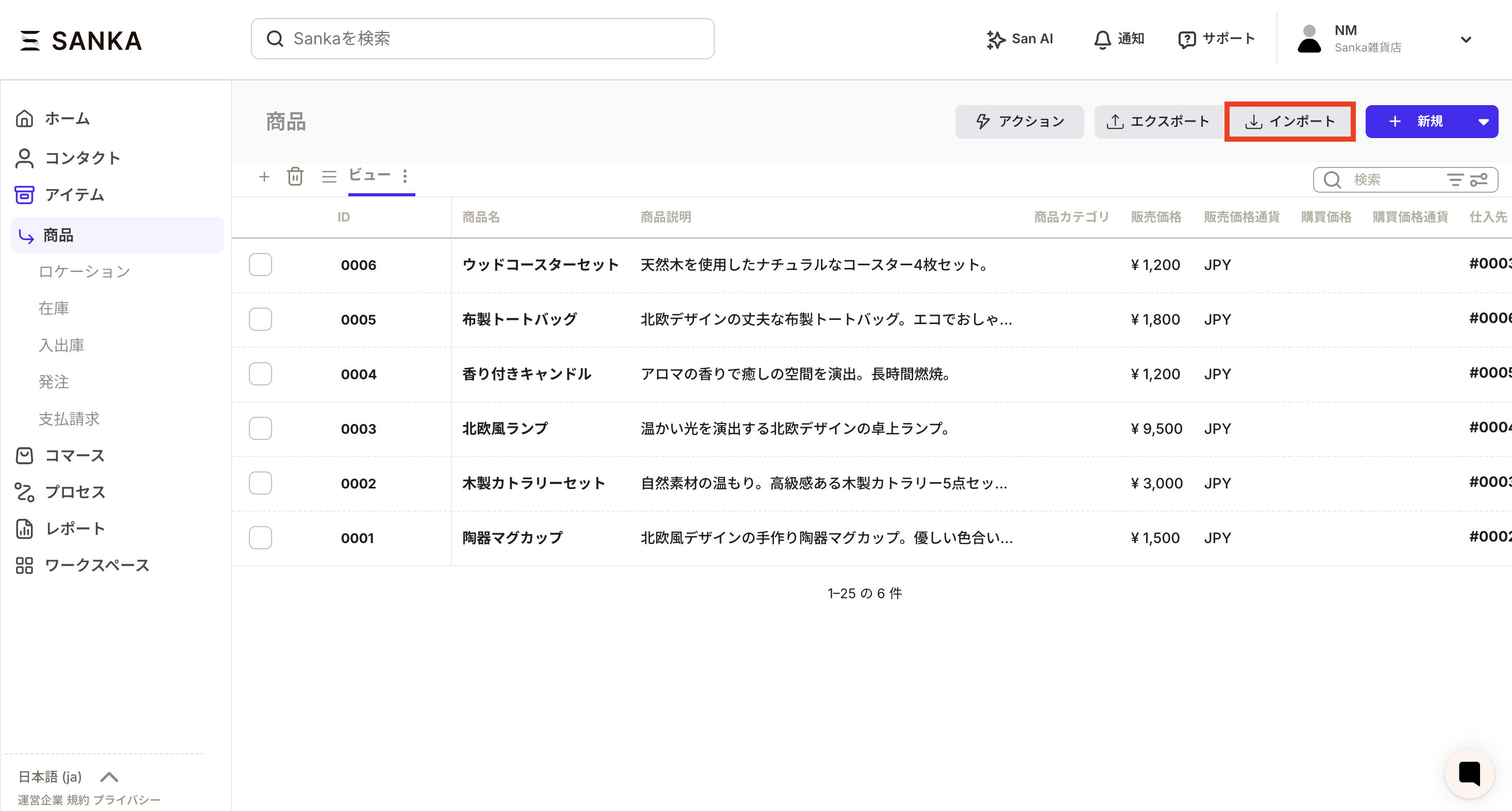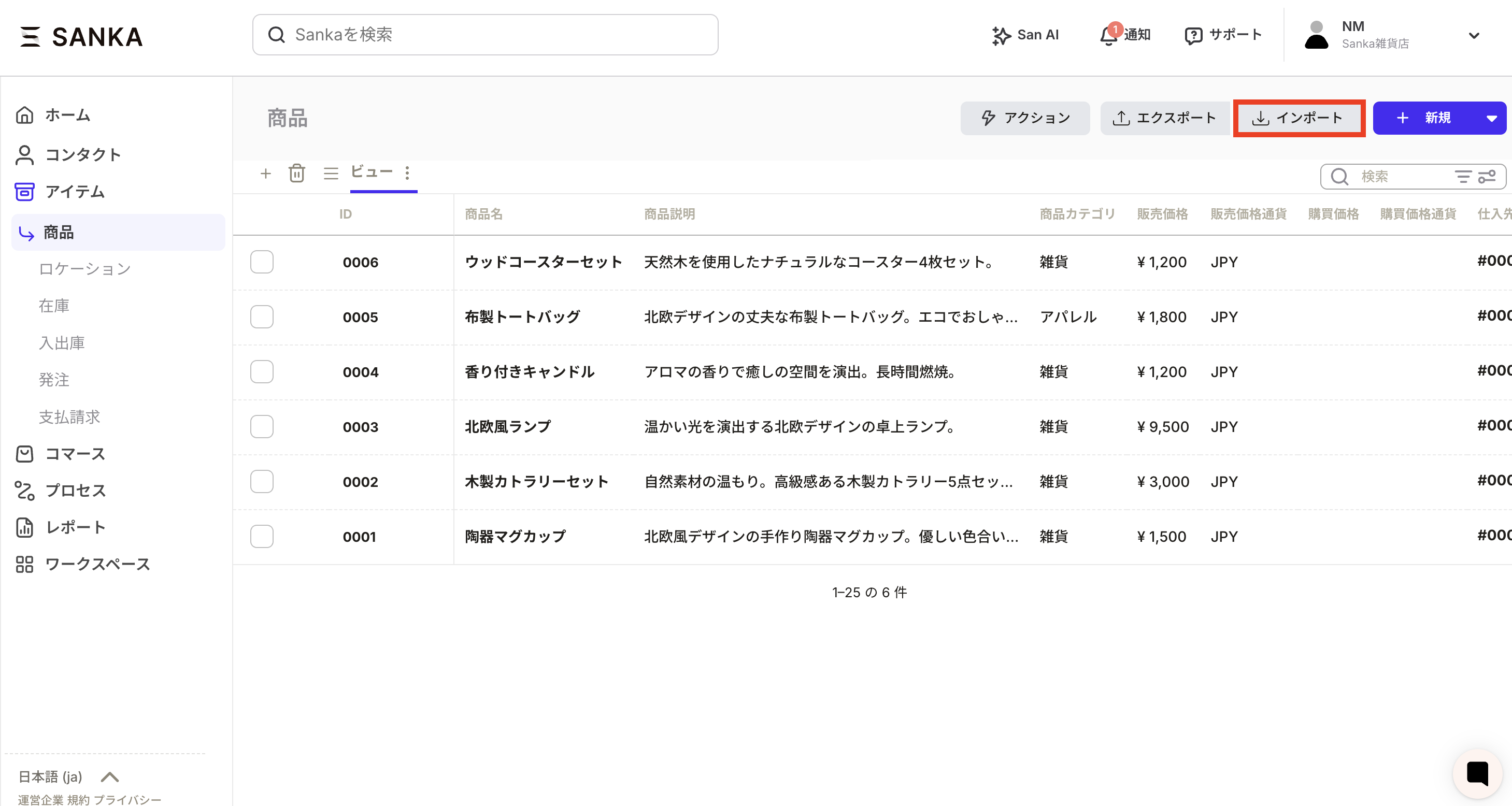 ①商品オブジェクトのインポートボタン押します。