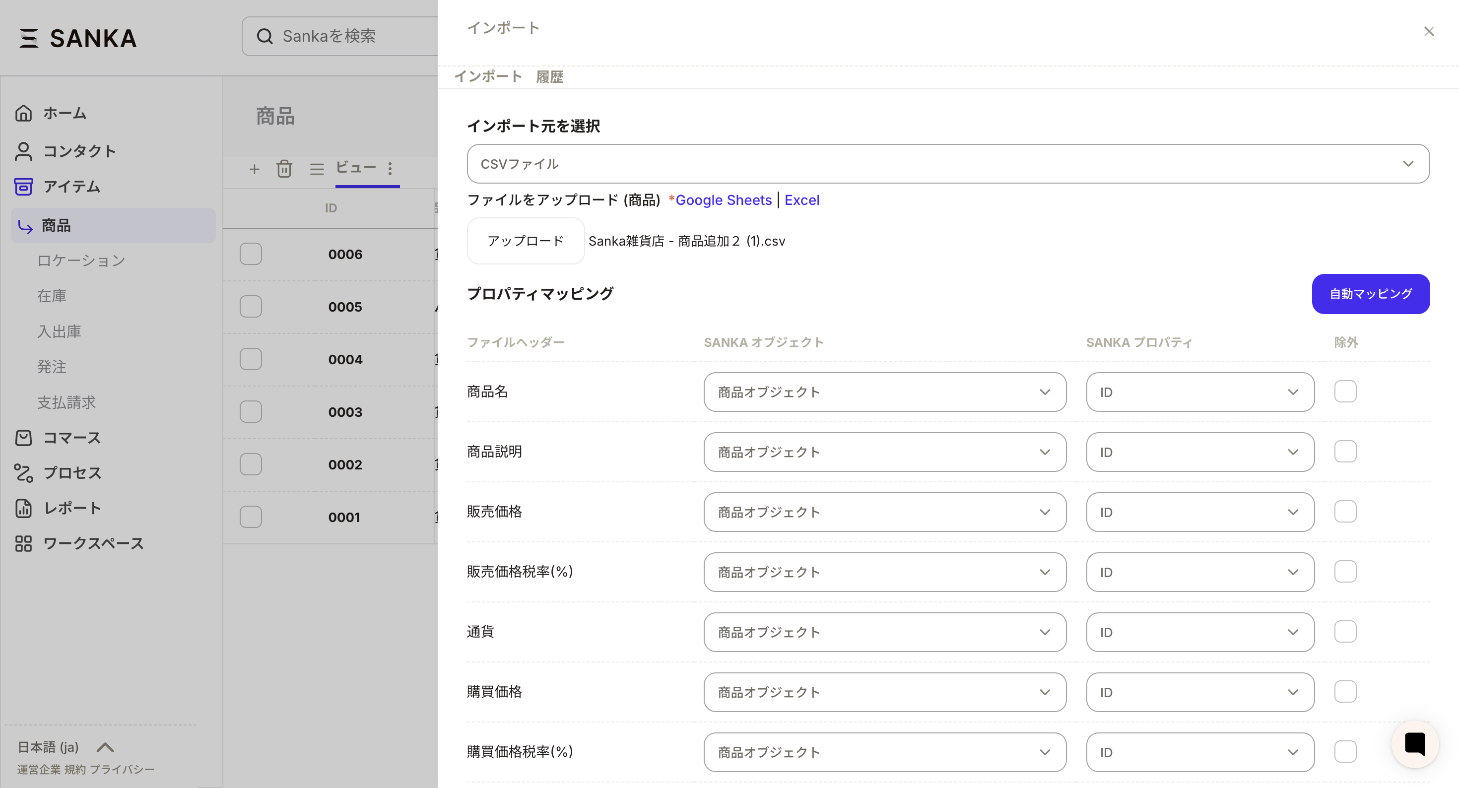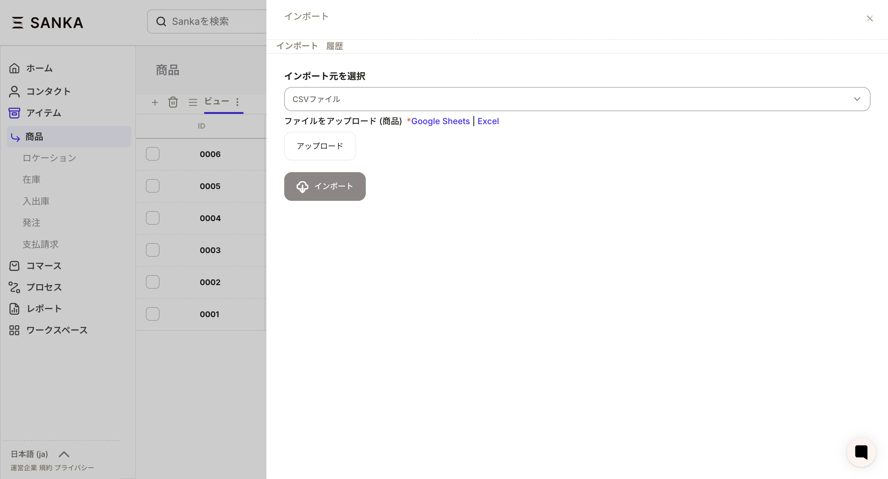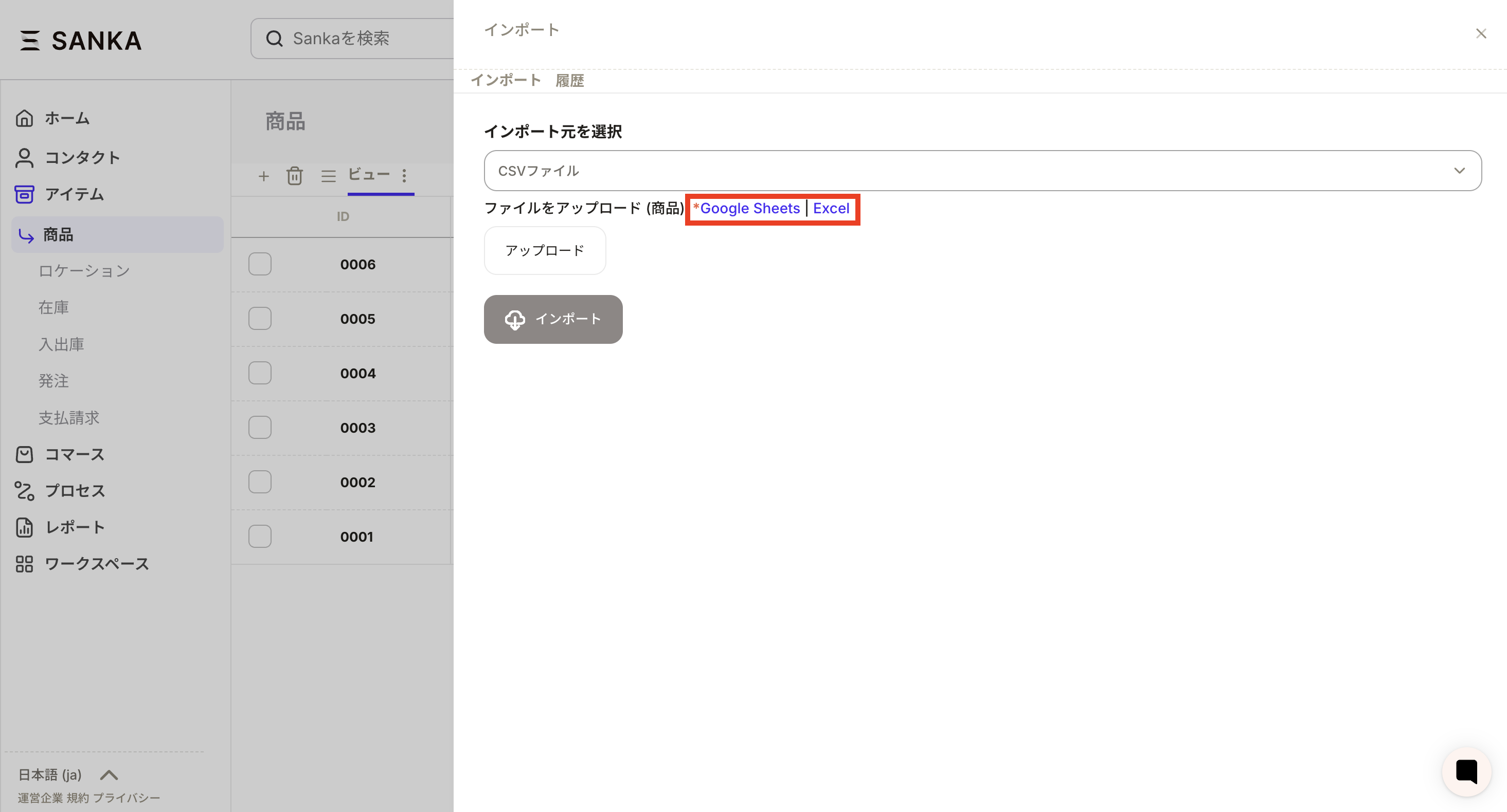 CSVファイルを選択すると、ファイルをアップロードの項目と一緒にSANKAが用意した「商品CSVインポートテンプレート」が表示されます。グーグルシートかエクセルを選ぶことが可能です。