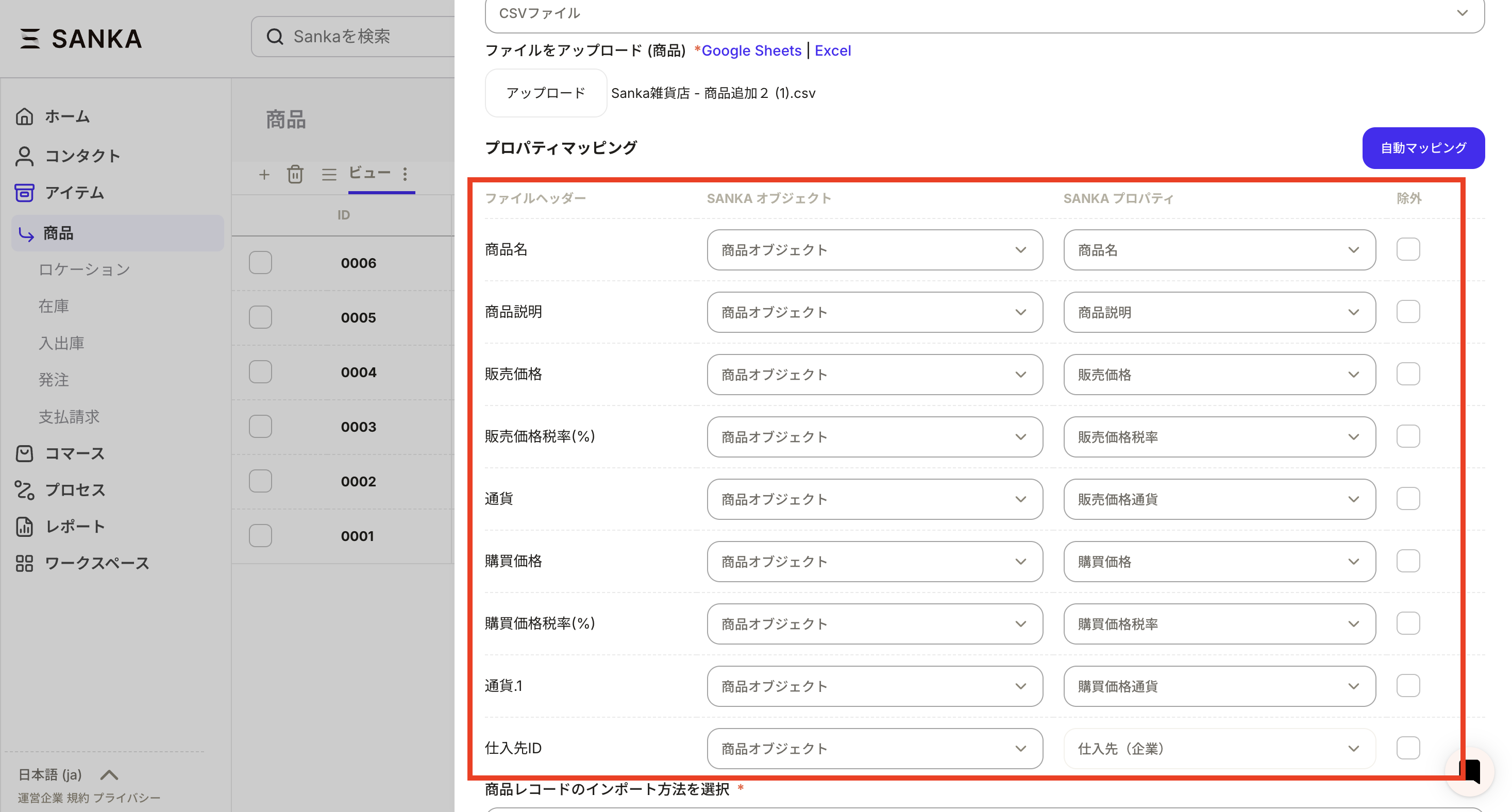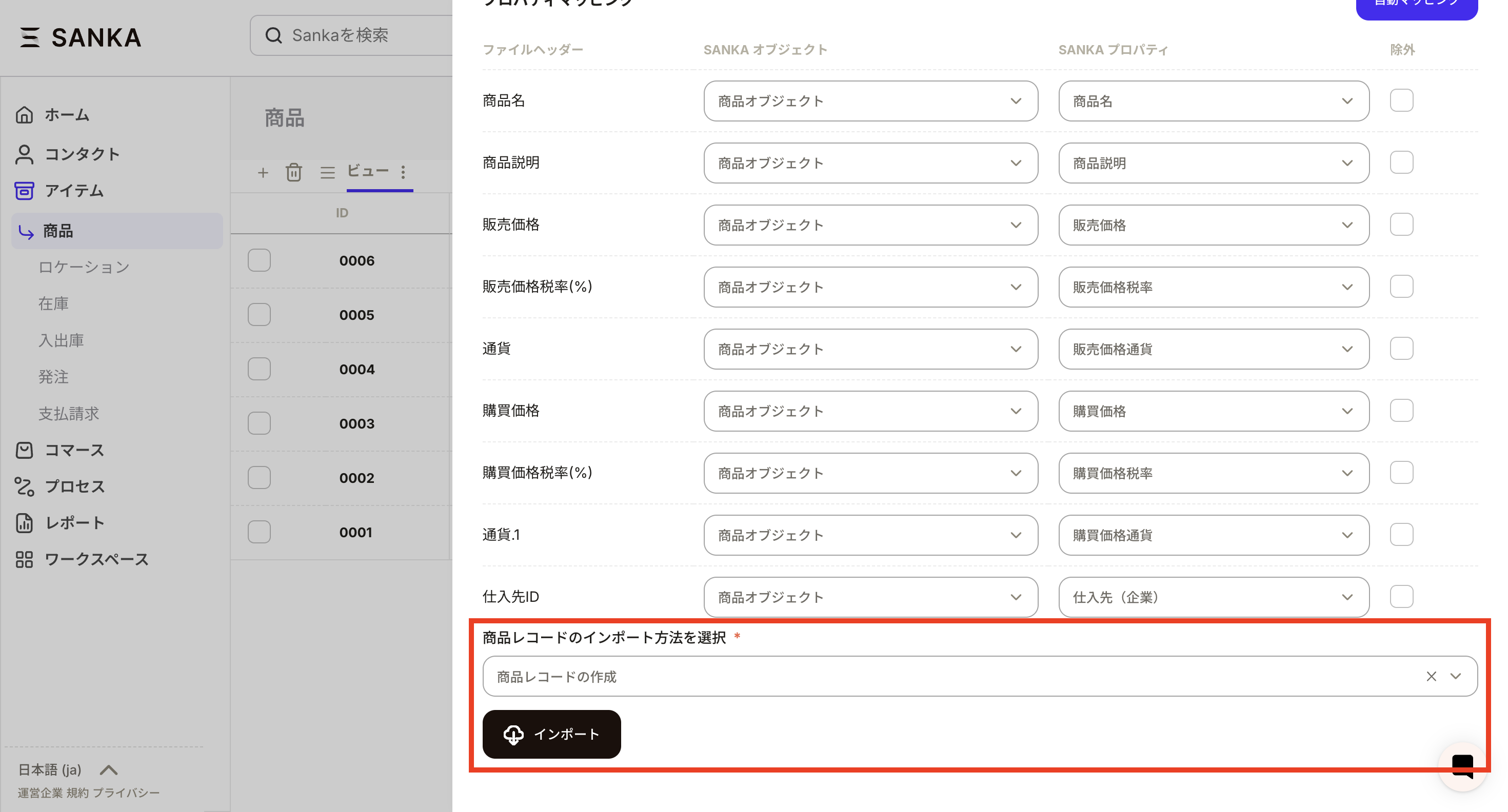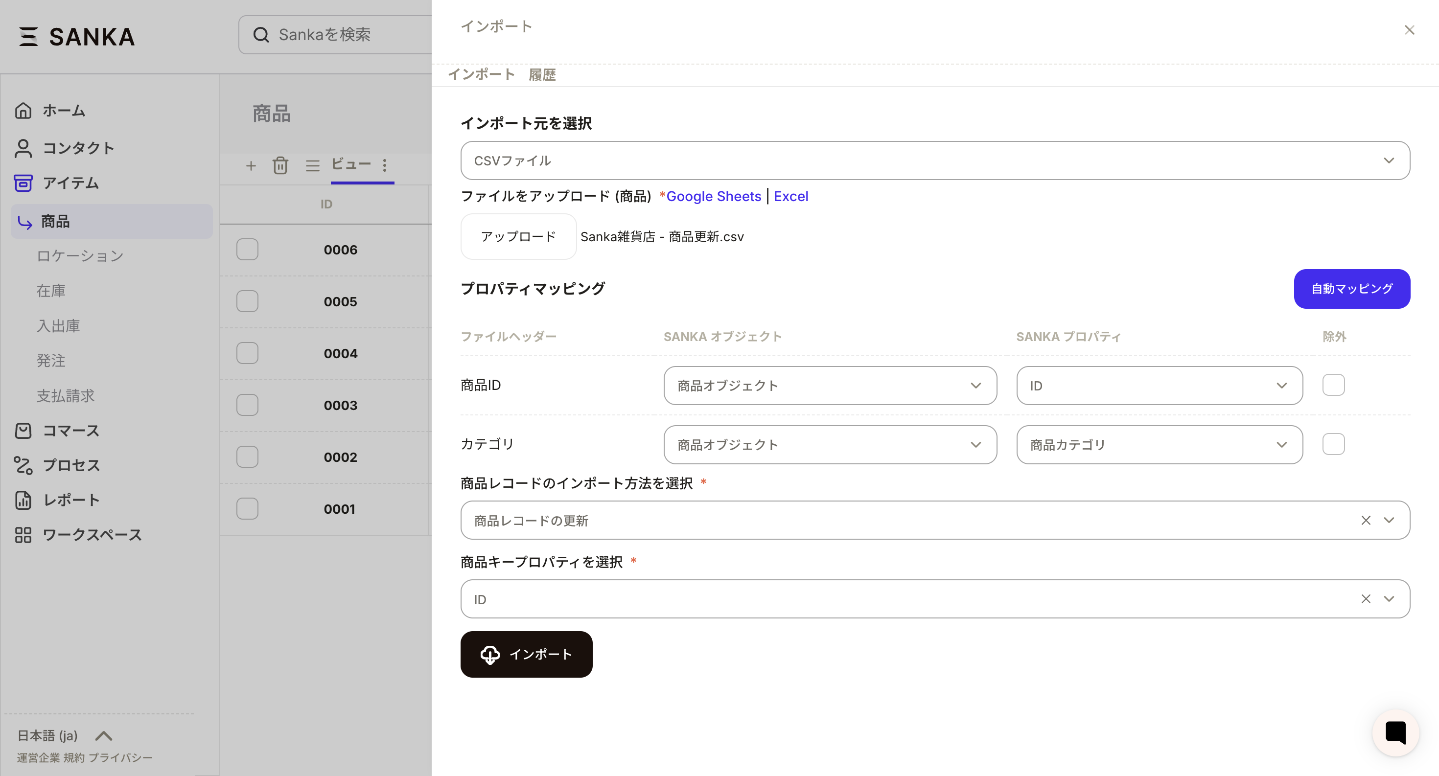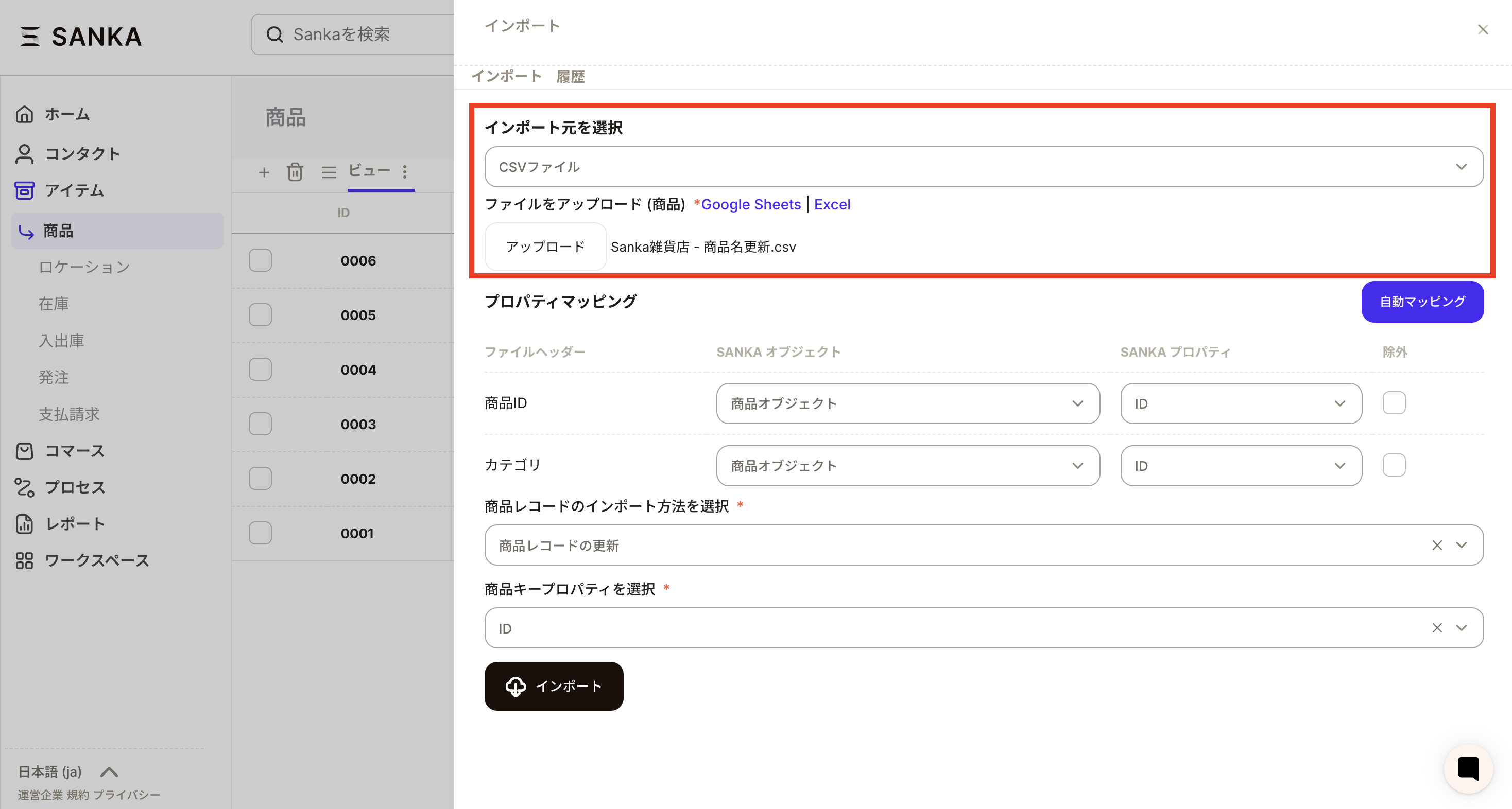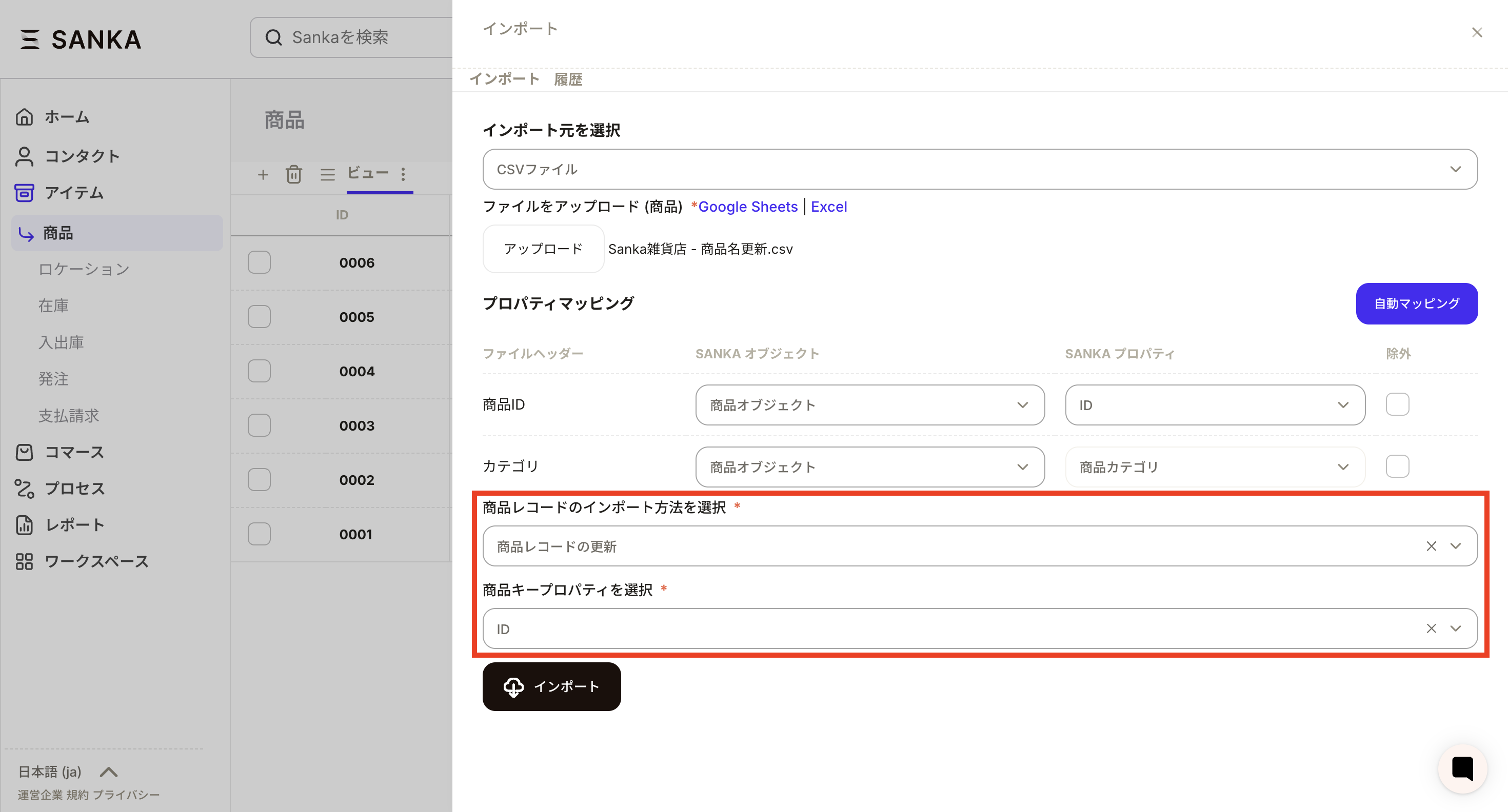 ⑥今回は例として、商品カテゴリというプロパティを新たに作成し、既存のレコードに追加するいう更新方法をやってみます。すべての設定が終わったらインポートボタンを押します。