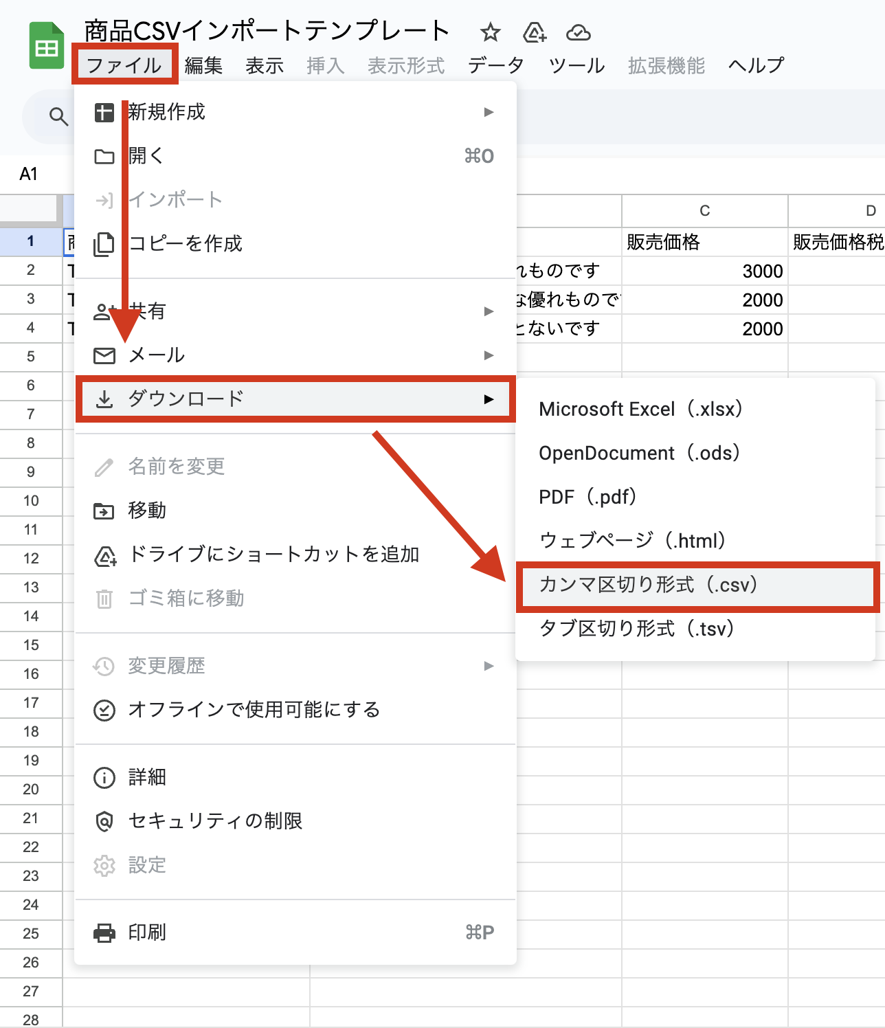 つづいてCSVファイルを作成していきます。「商品CSVインポートテンプレート」をデスクトップにダウンロードします。