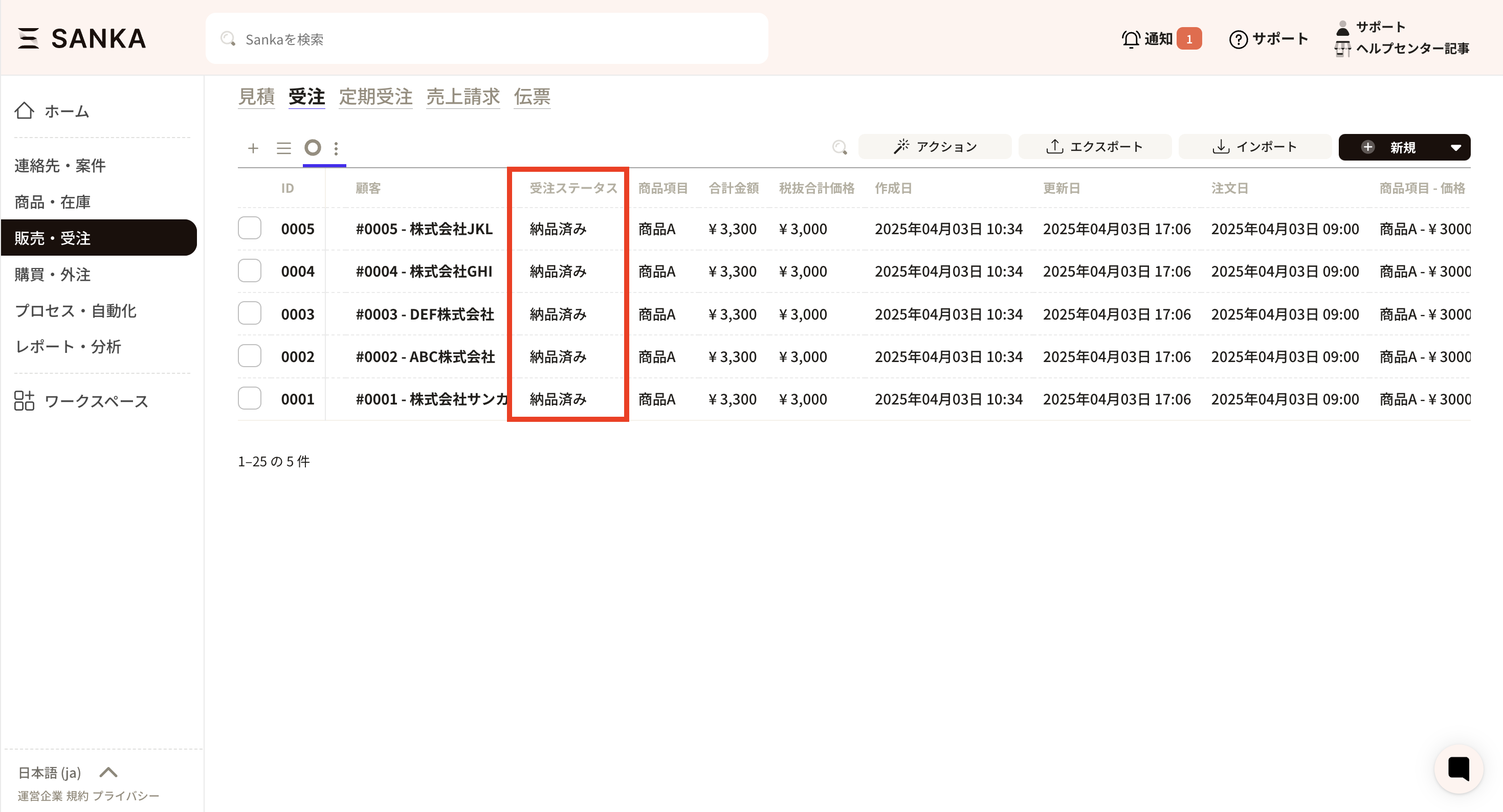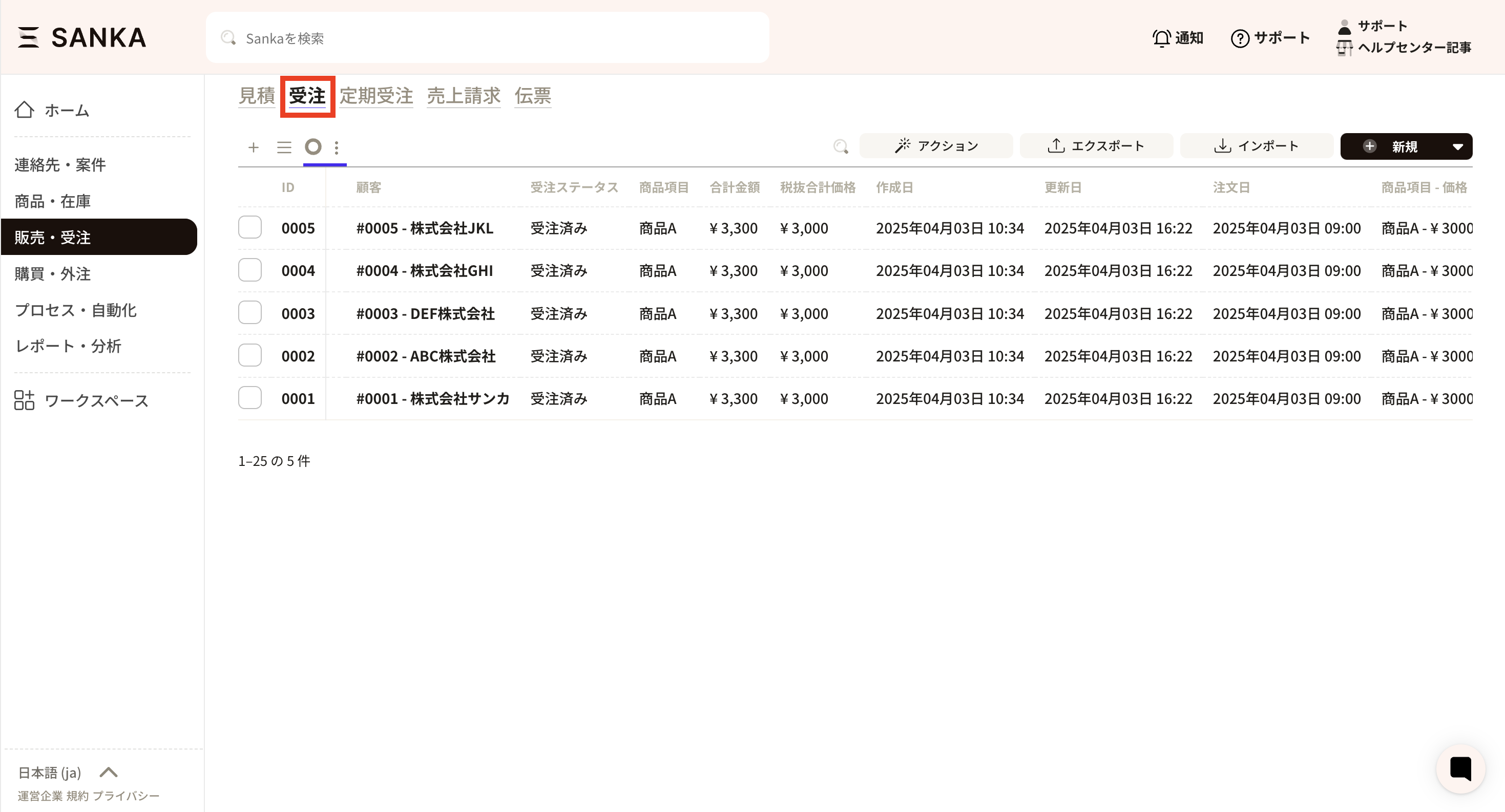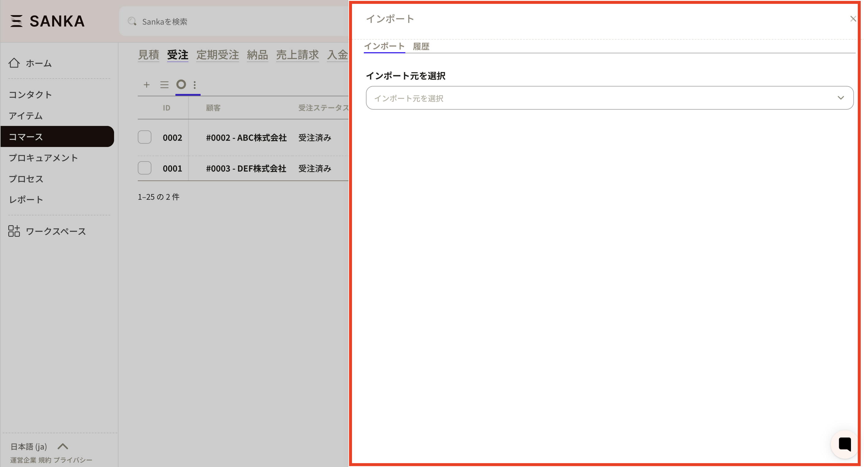 ②次にSankaに移動し、受注オブジェクトを開きます。