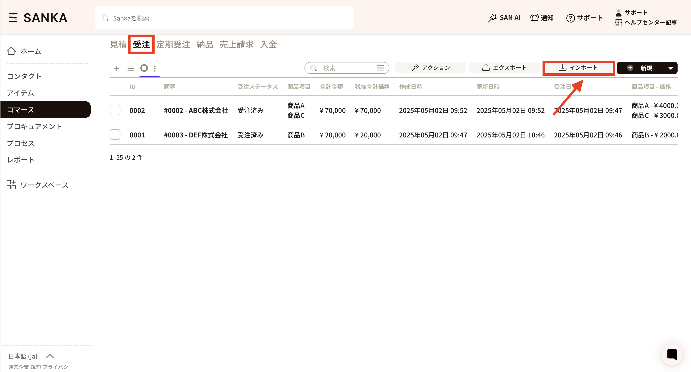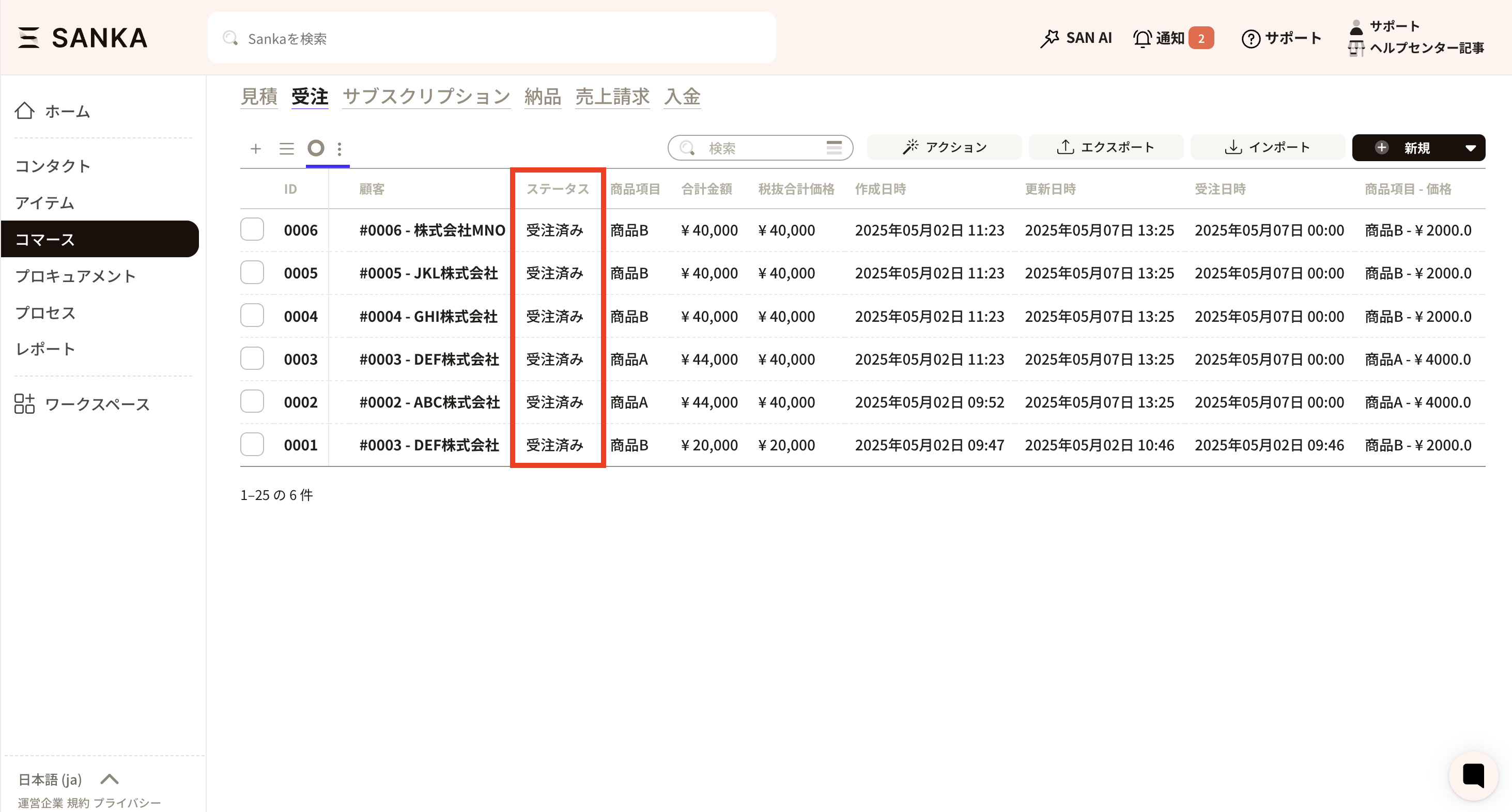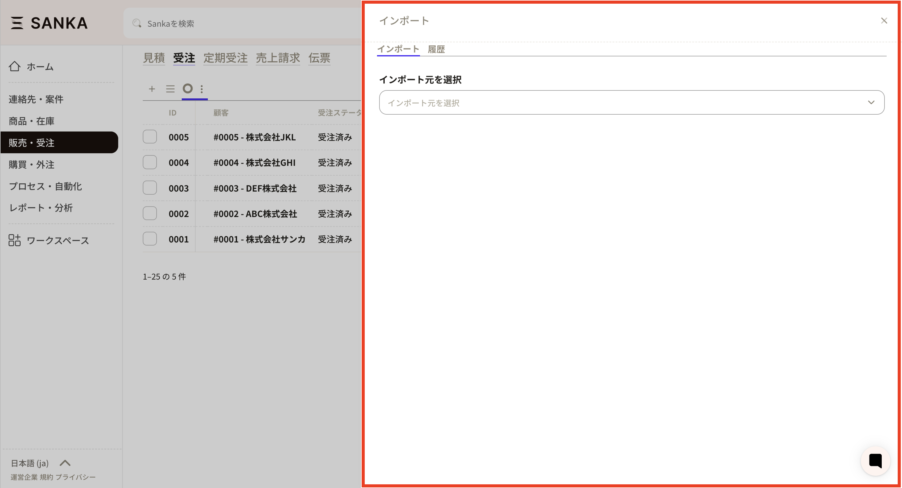 ②次にSankaに移動し、受注オブジェクトを開きます。