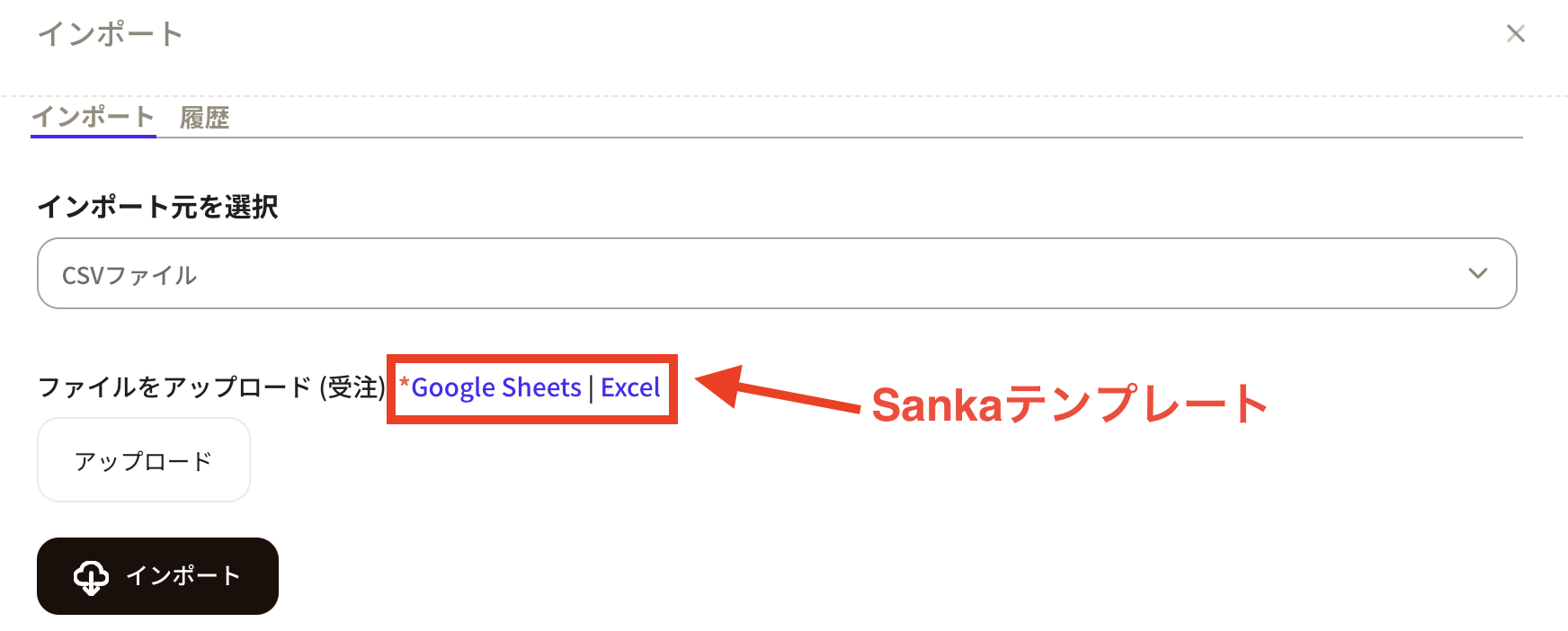 ③「インポート元を選択」では、CSVファイルを選びます。CSVファイルを選択すると「ファイルをアップロード」の項目が表示され、同時にSankaが用意した「CSVインポートテンプレート」が表示されます。