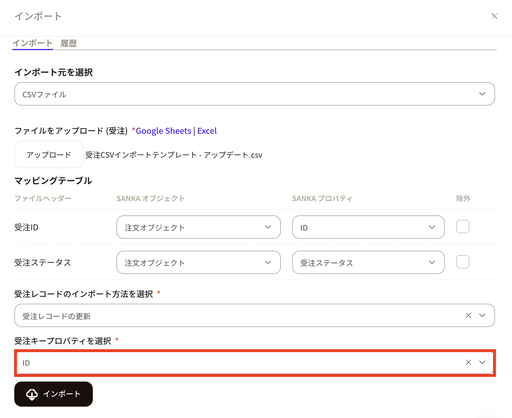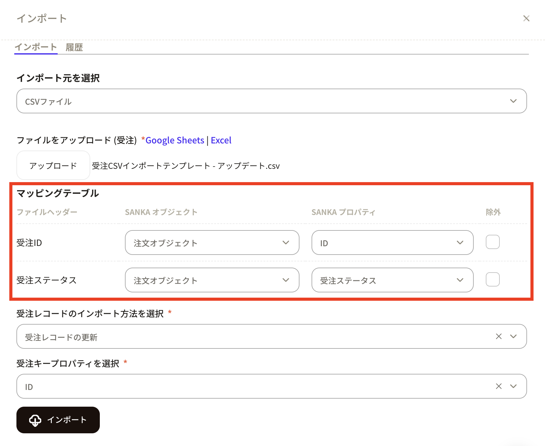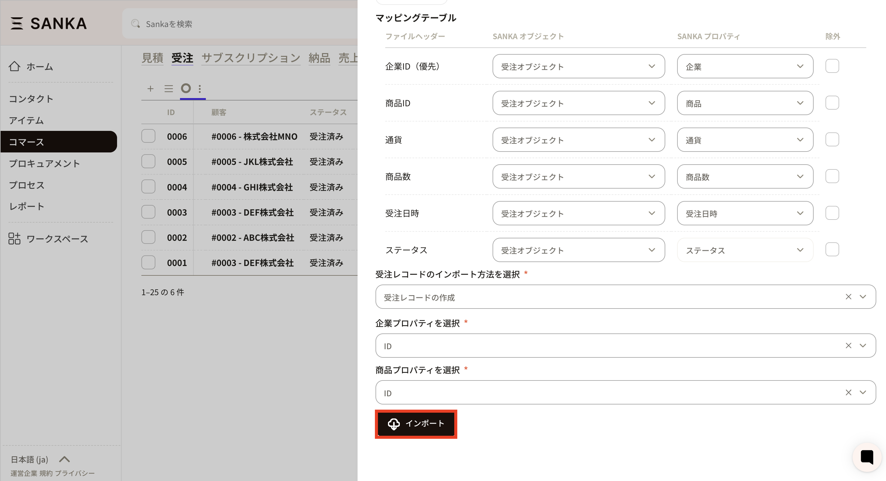 ⑦CSVファイルをアップロードするとマッピングテーブルが表示されるので、情報を調整します。CSVファイルヘッダーがSANKAプロパティのどれにあたるかを設定します。SANKAオブジェクトは「受注オブジェクト」のままにしておきます。