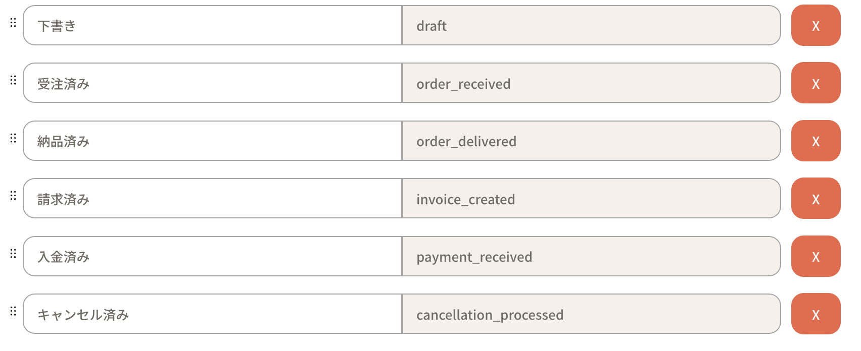 受注ステータスは、ラベル(表示されている名前)ではなく値をいれます。