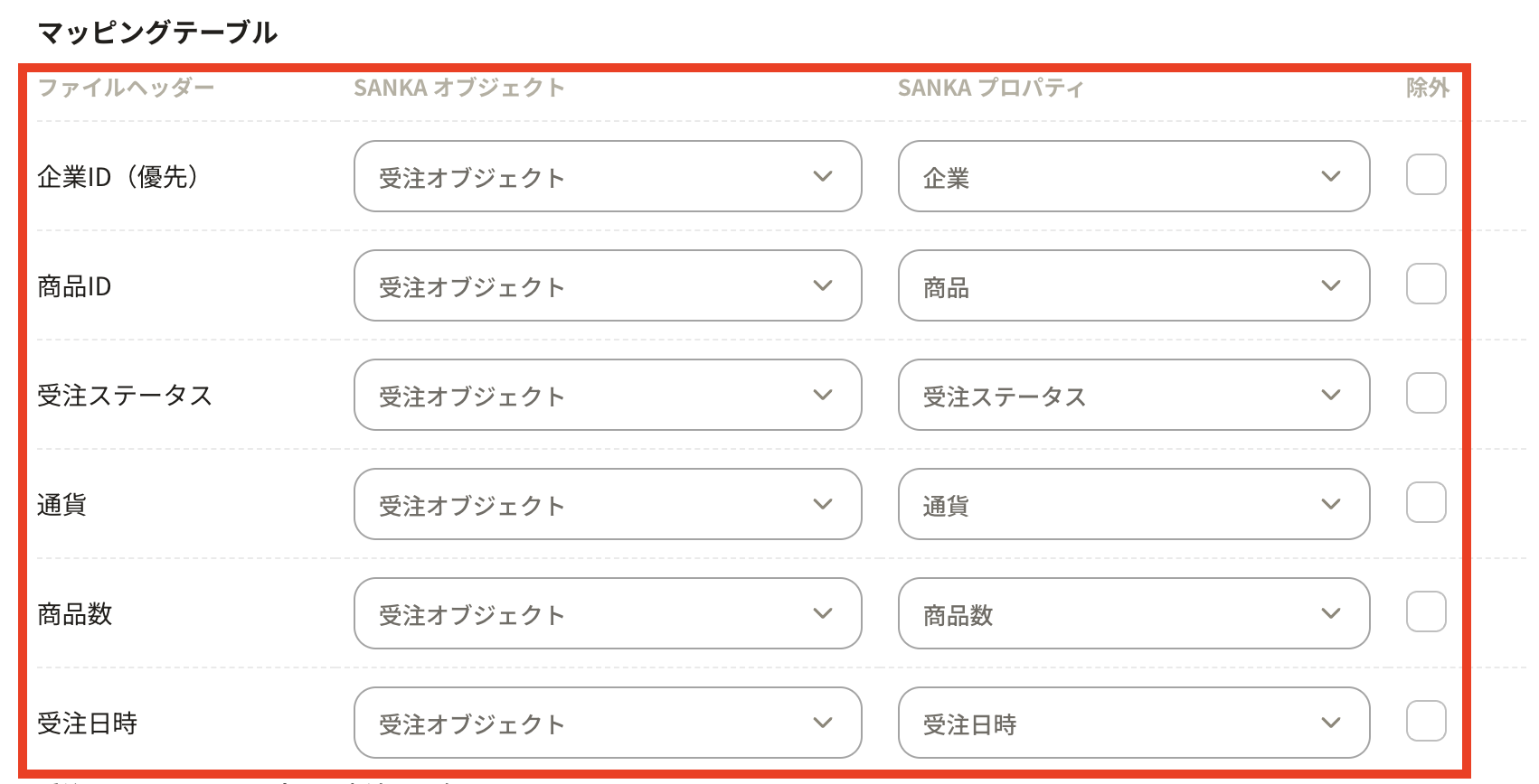 ⑦CSVファイルをアップロードすると、マッピングテーブルが表示されます。ここでは、CSVファイルのファイルヘッダー(項目)と受注オブジェクトのプロパティを合わせます。ここで「除外」のチェックボックスをクリックするとその項目はインポートされません。
