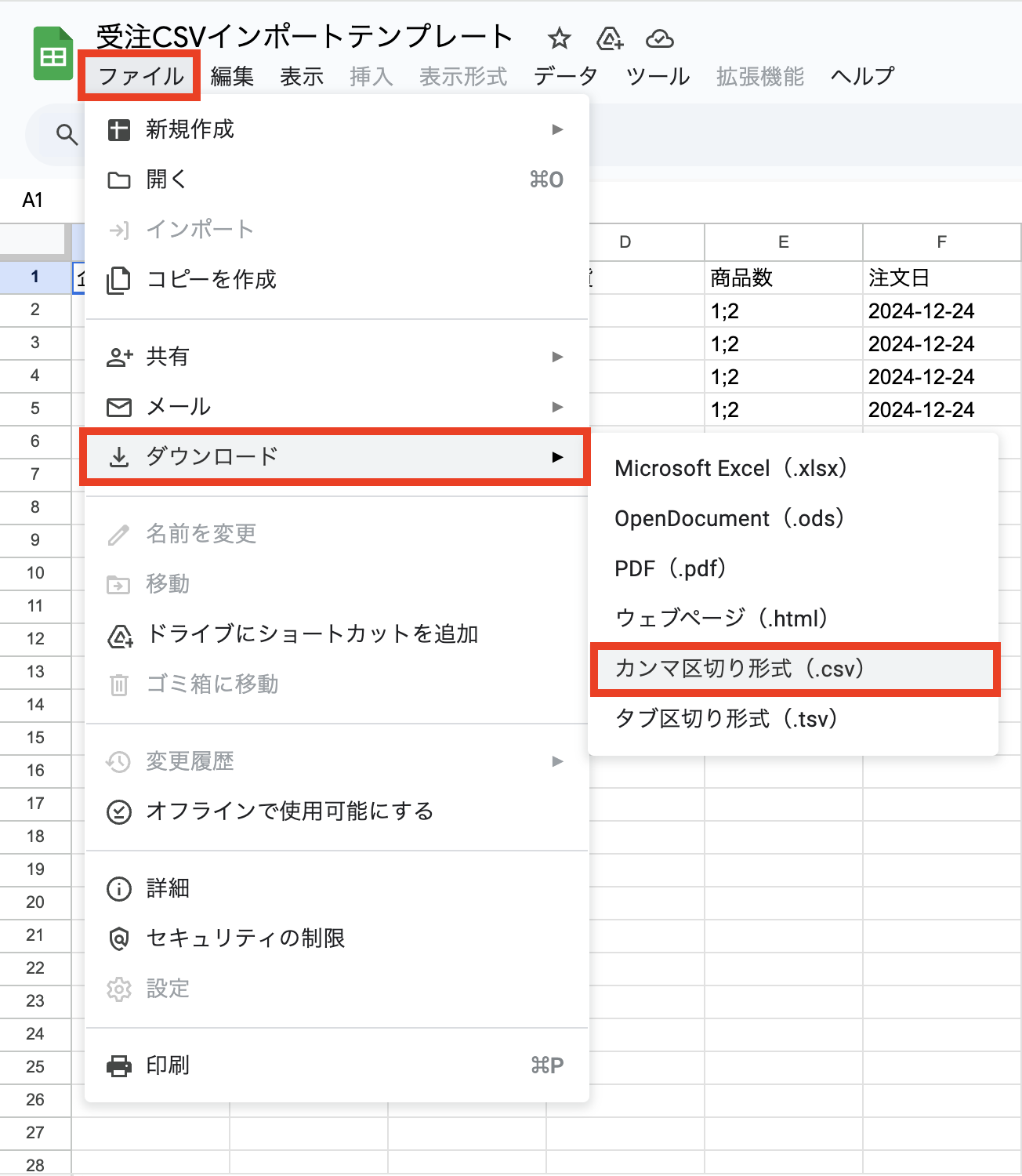 ④まずは「受注CSVインポートテンプレート」をダウンロードします。