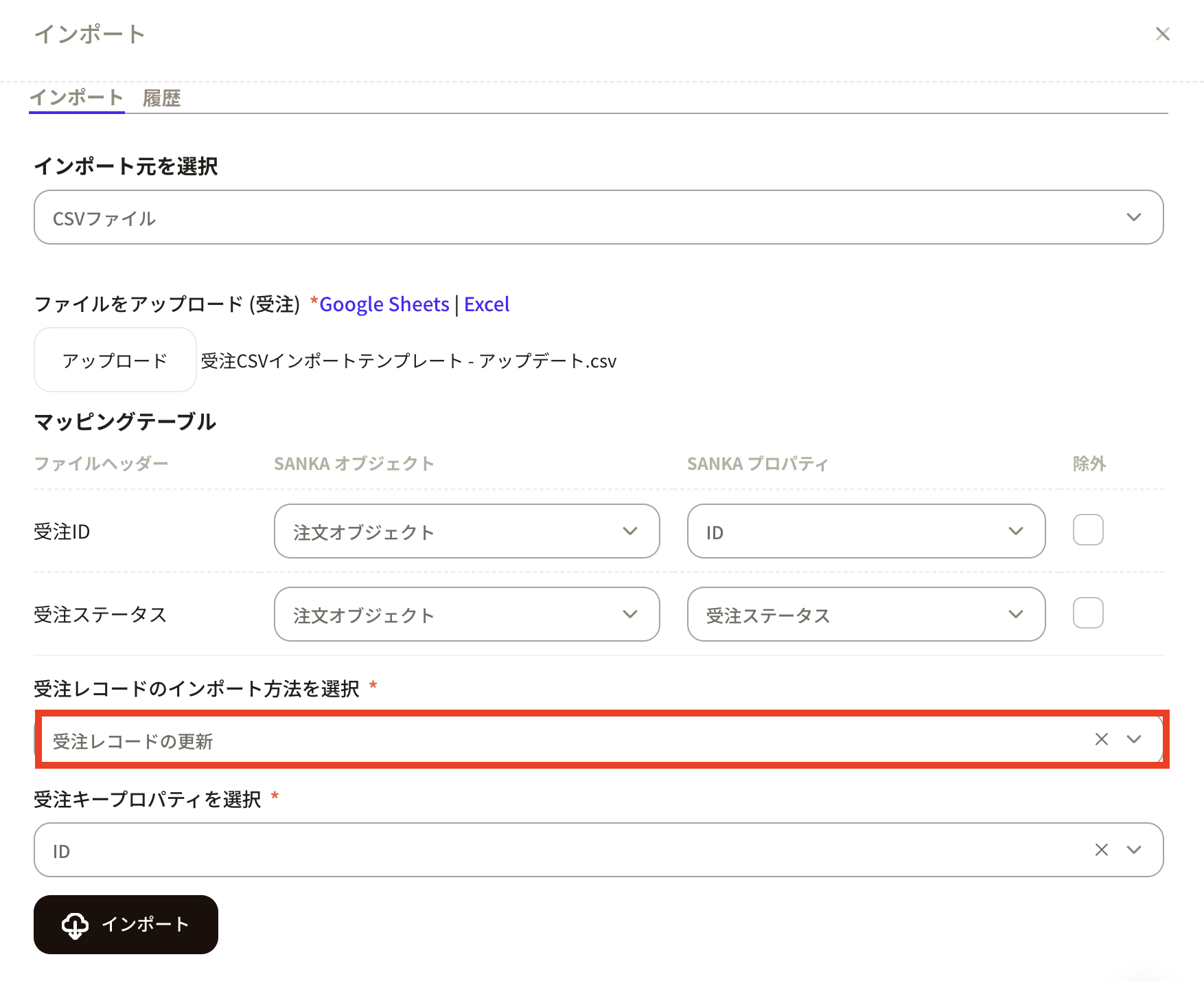 ⑧「受注レコードのインポート方法を選択」は今回は既存の情報を更新するので「受注レコードを更新」を選択します。