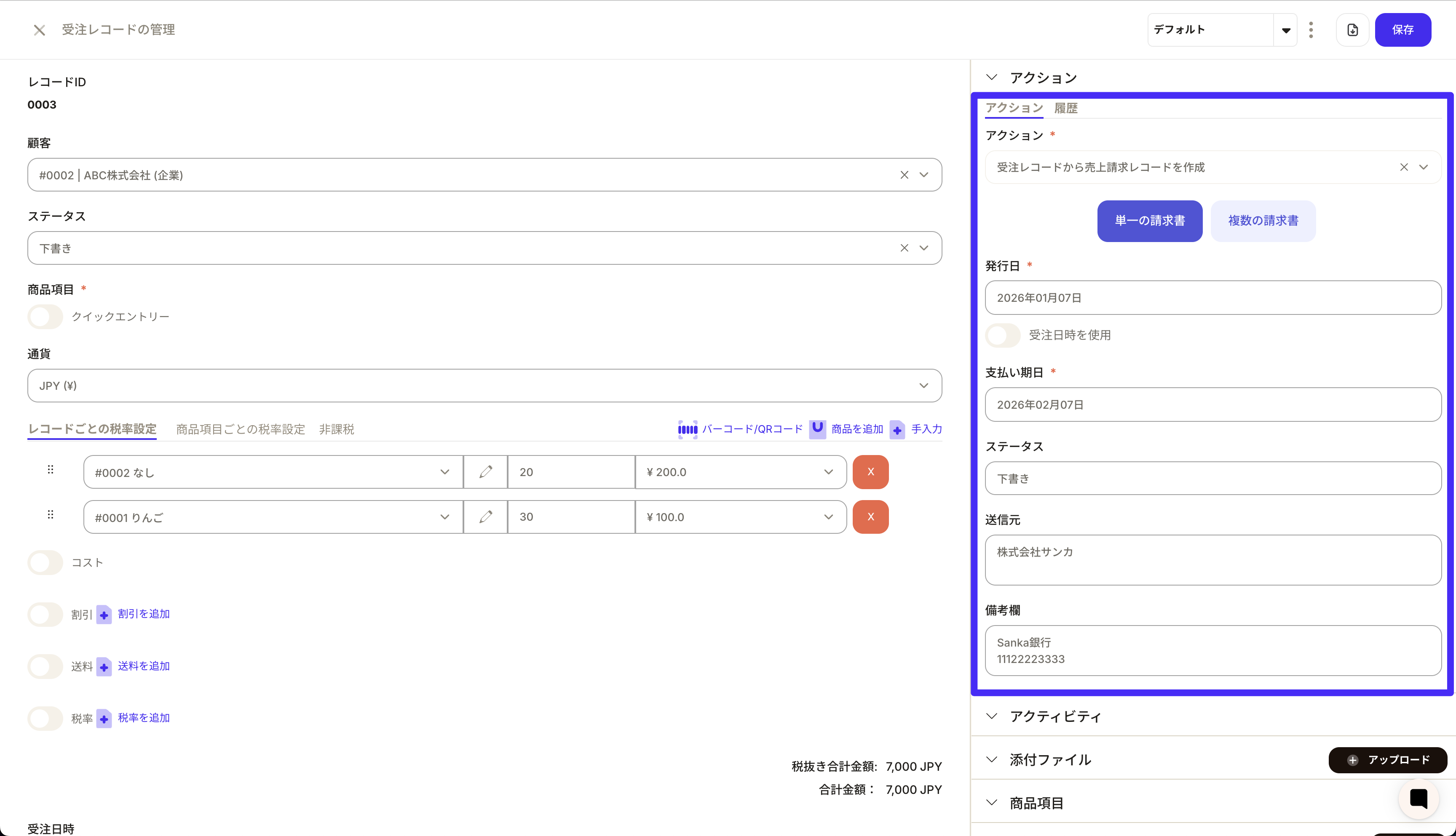 受注作成後、手入力、アクション機能、またはワークフローで売上請求レコードを作成します。