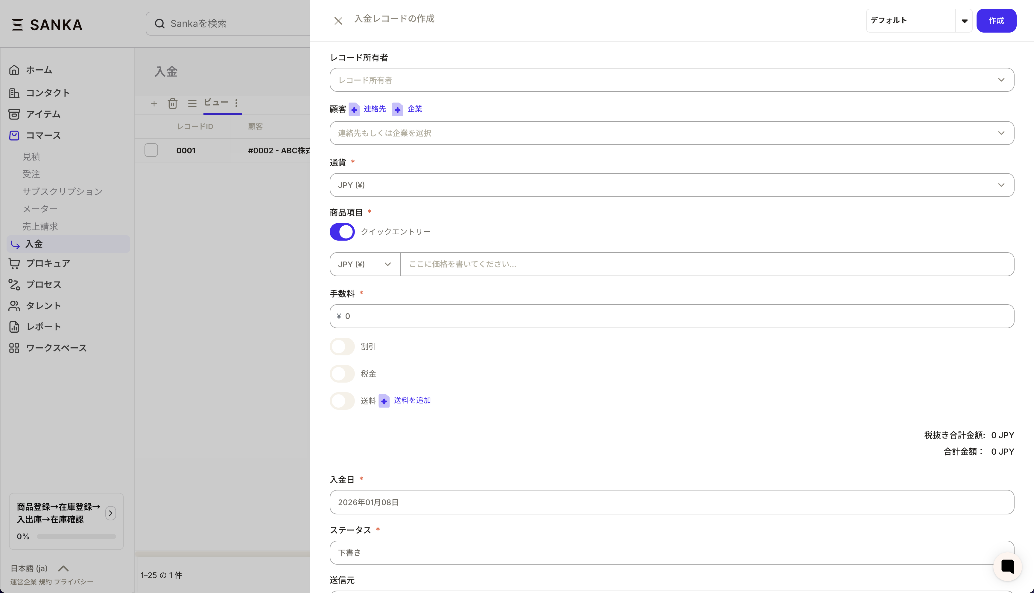 Sankaの入金オブジェクトに、入金日・金額・入金元などを登録