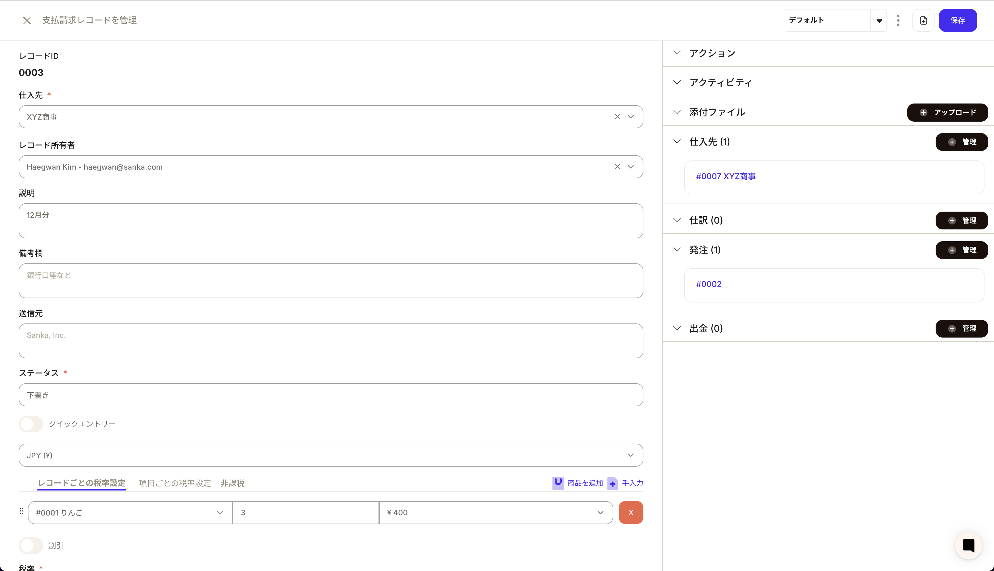 を登録します。発注書と関連付けておくと「発注 → 請求 → 支払」の流れを追いやすくなります。