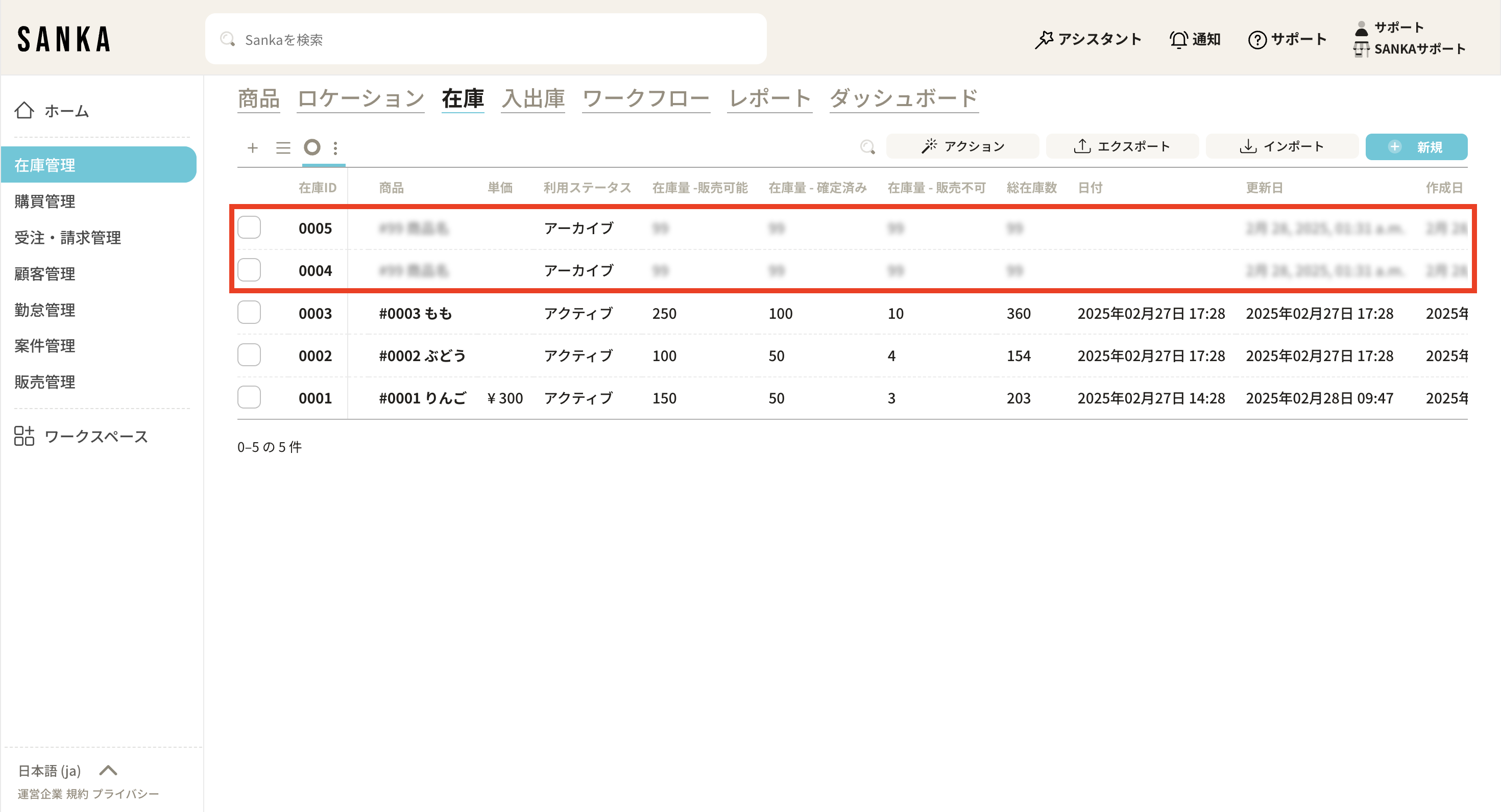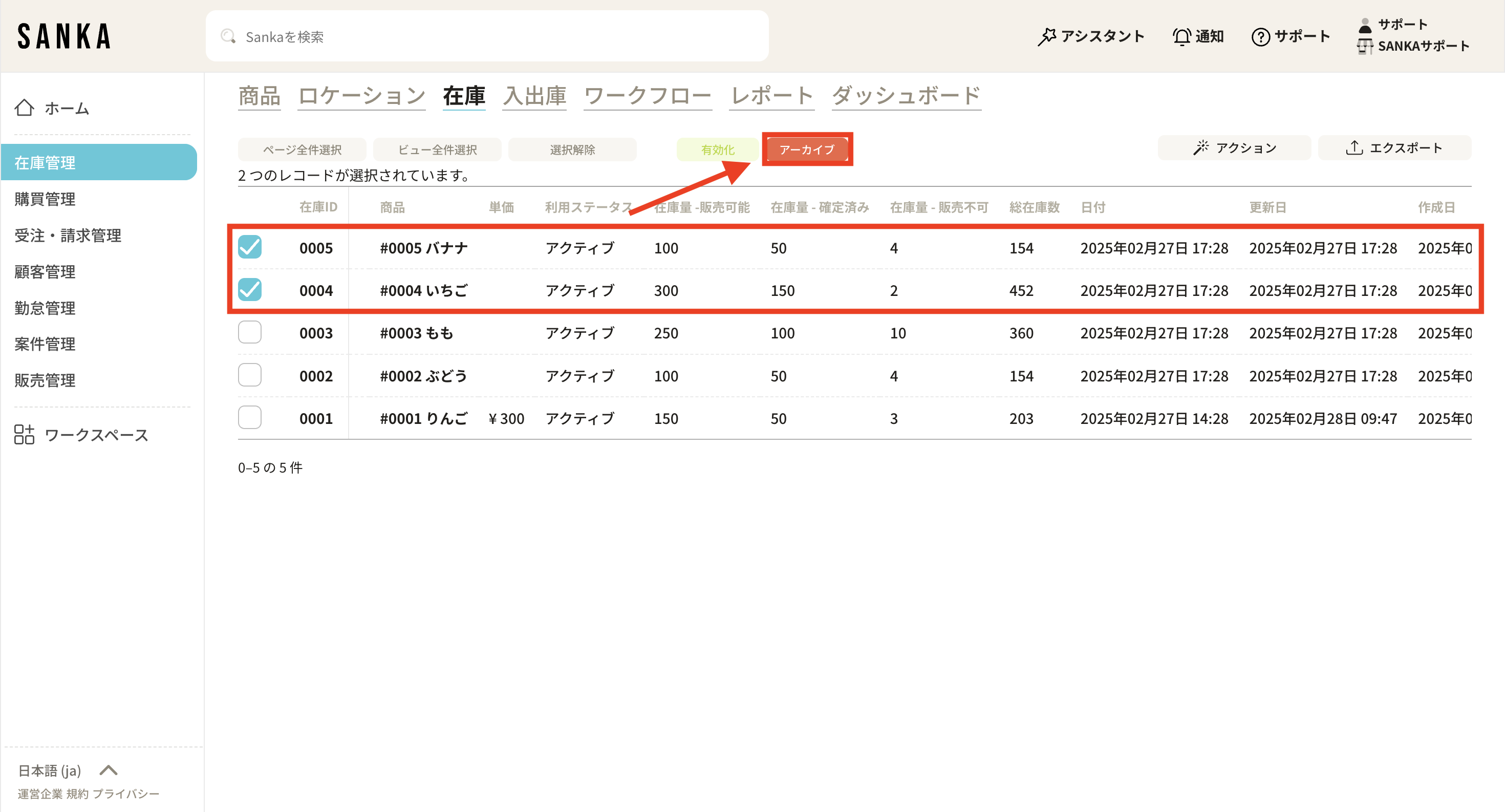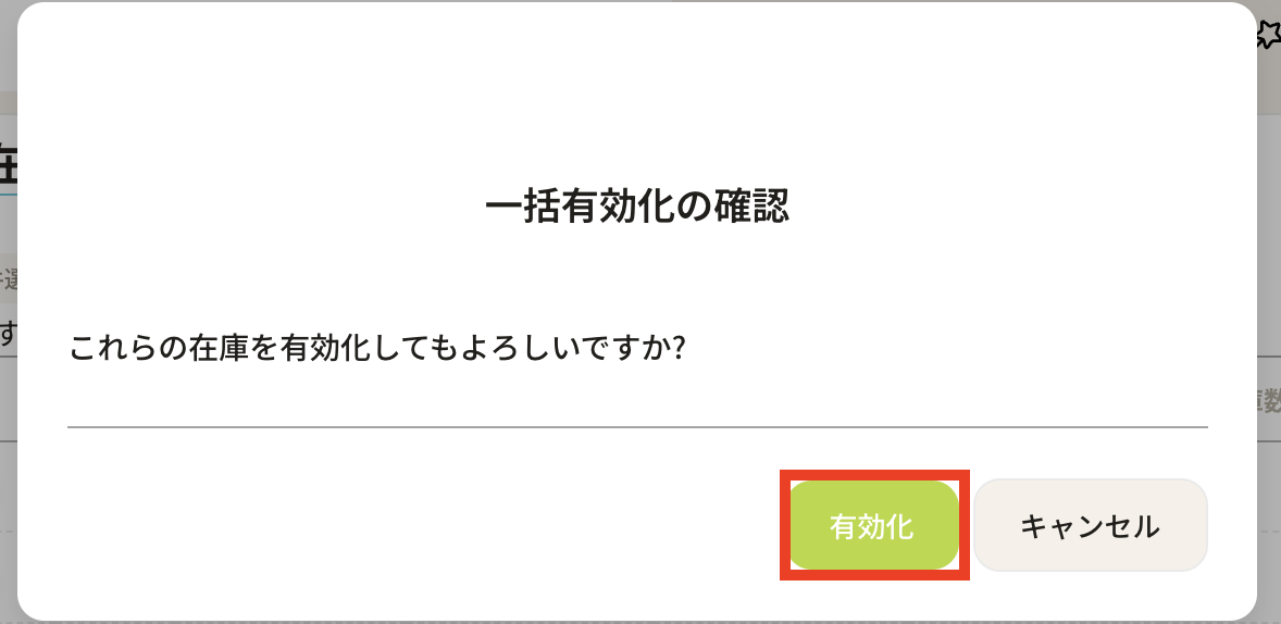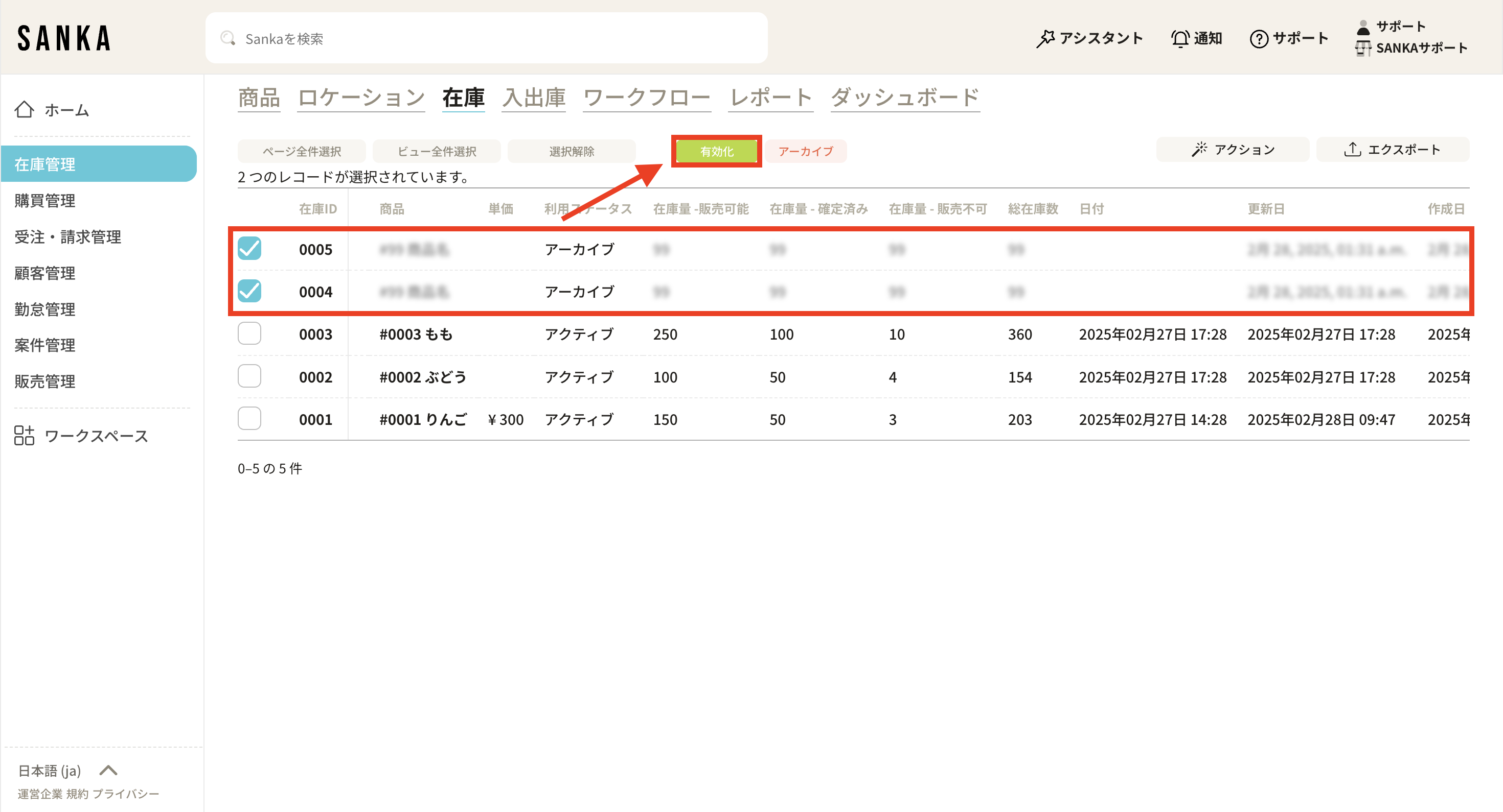 ④アーカイブを解除したい場合は、該当の在庫レコードのチェックボックスをクリックし、「有効化」ボタンを選択します。