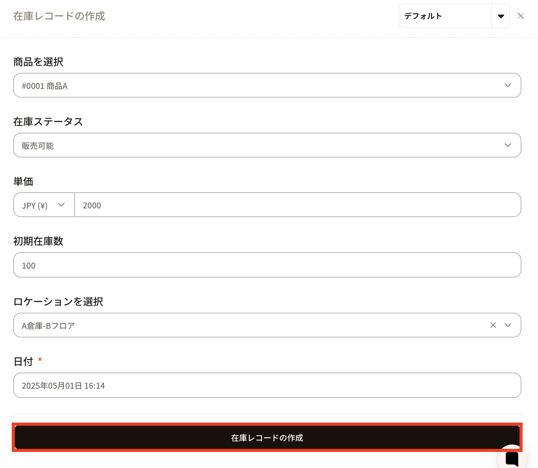 ⑨必要事項をすべて入力したら「在庫の作成」をクリックします。 ここでは、例として下記の情報を登録しました。