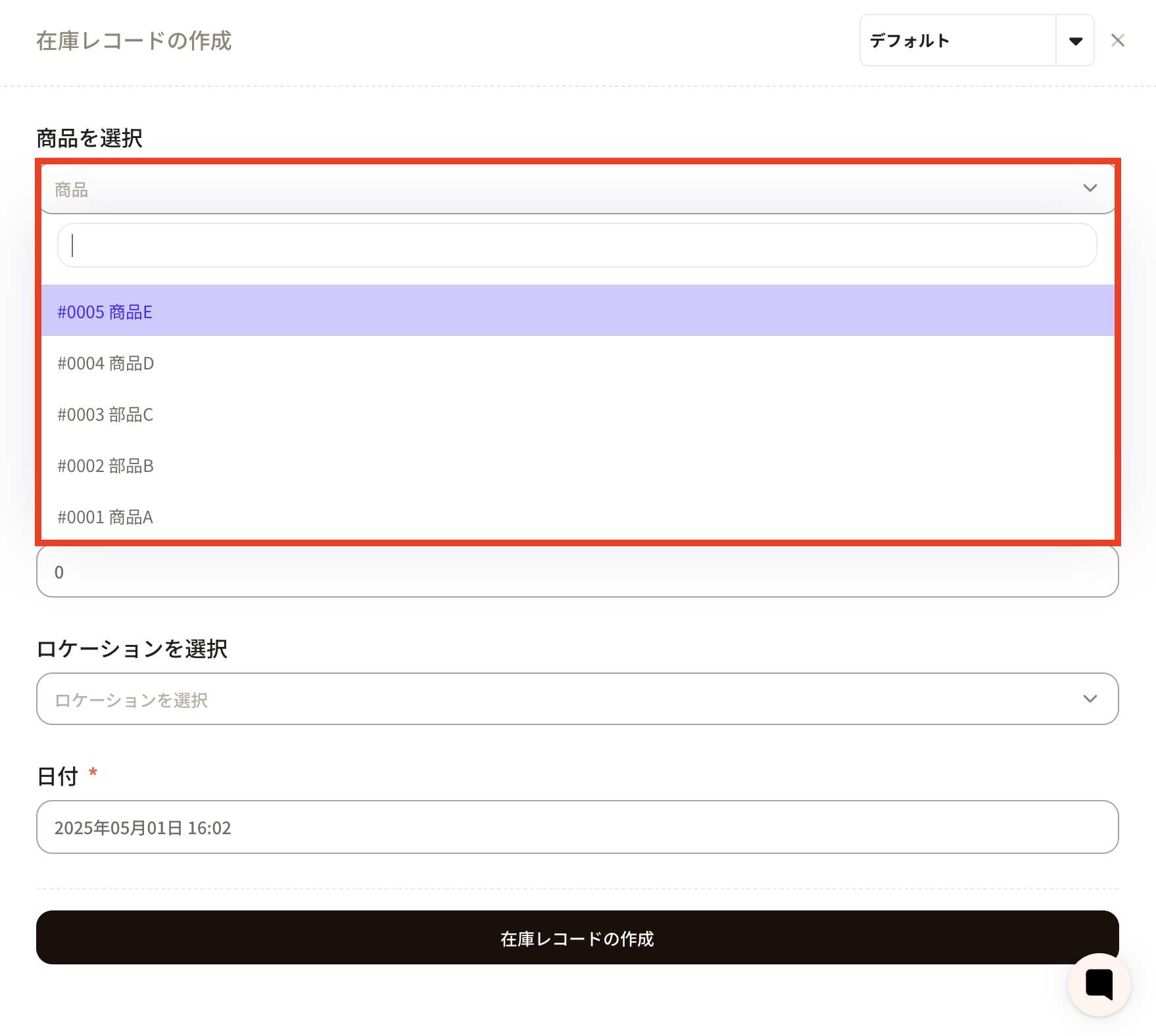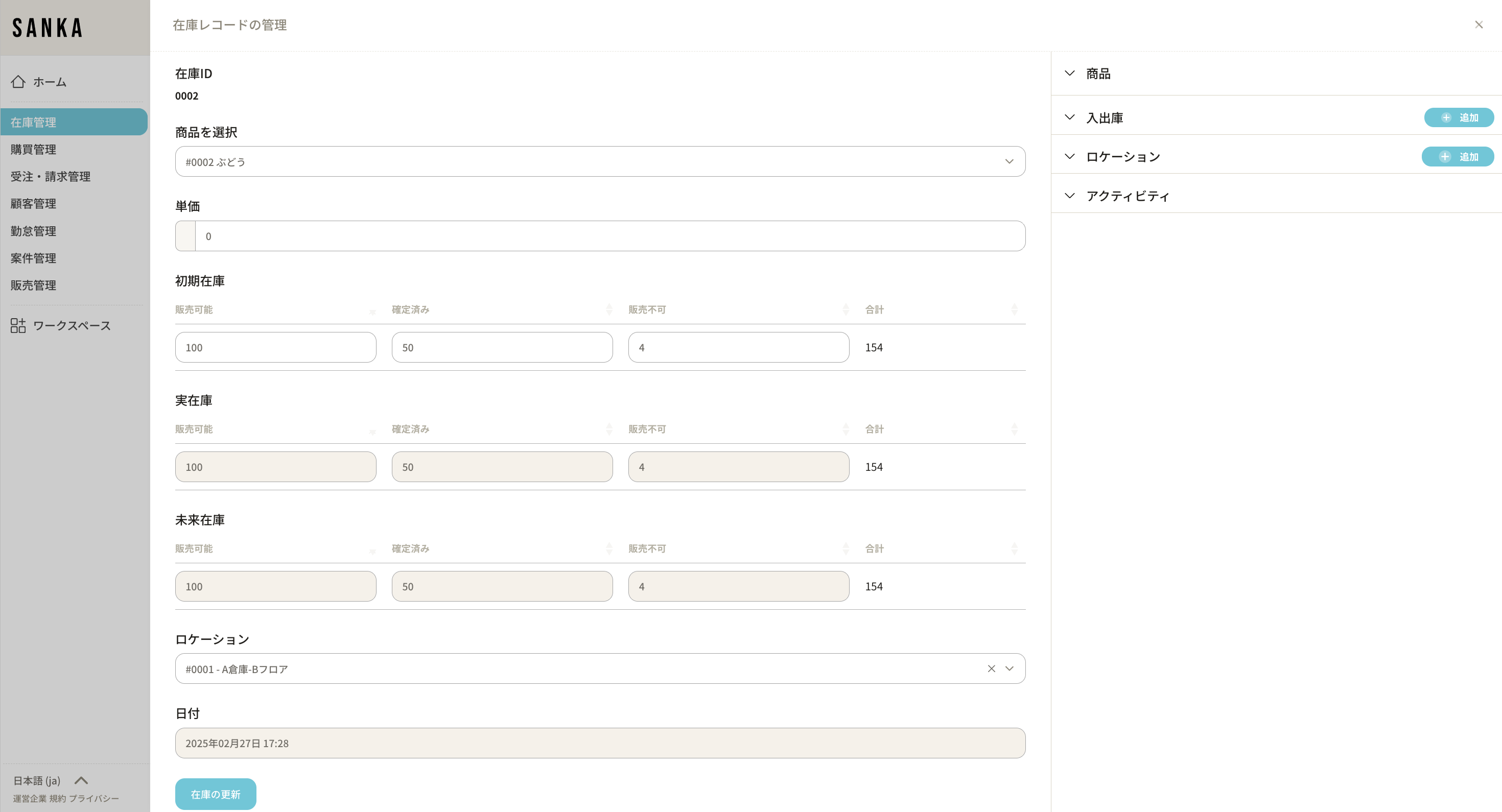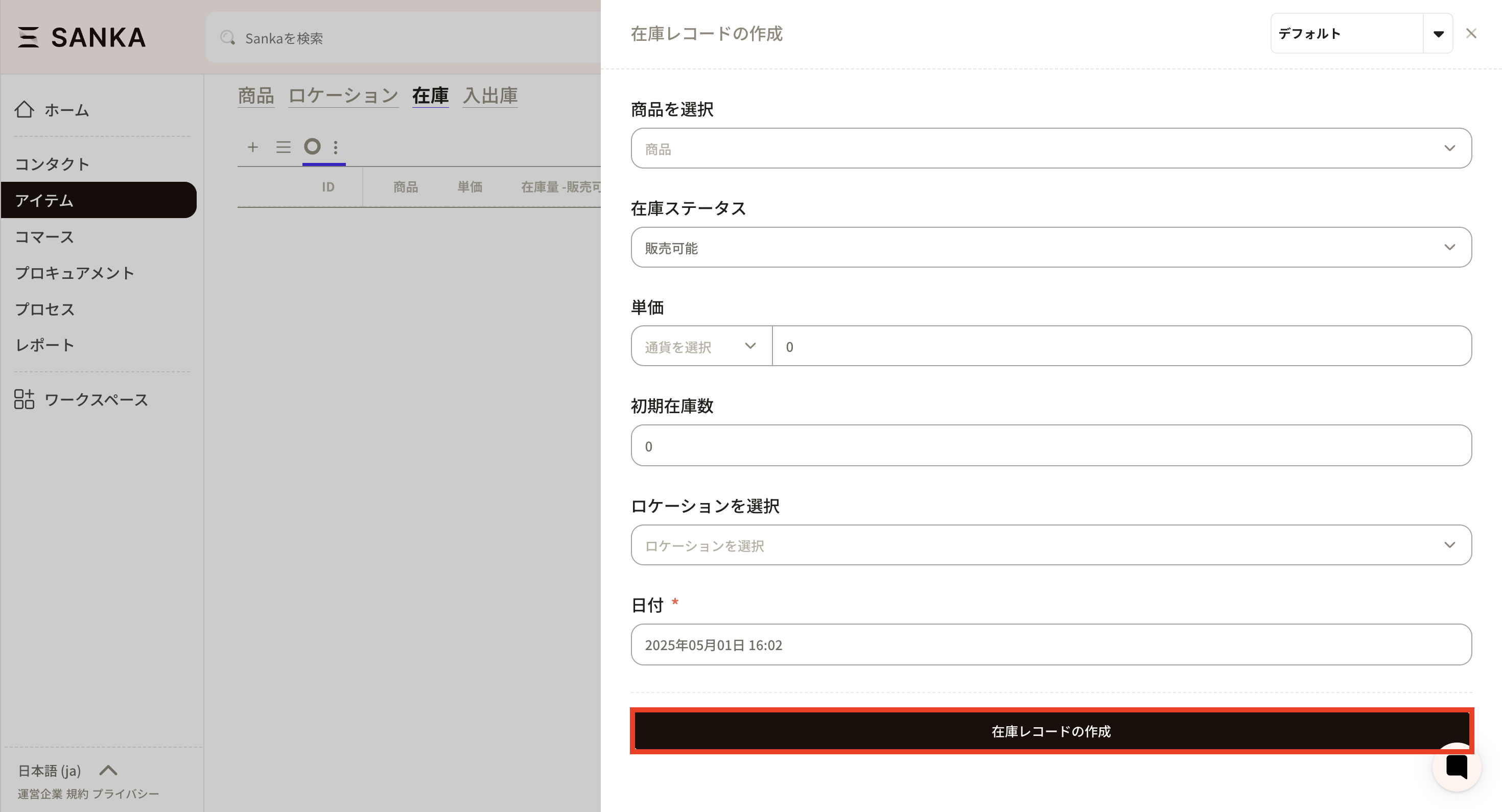 ②「在庫レコードの作成」メニューが表示されます。必要事項を入力していきます。