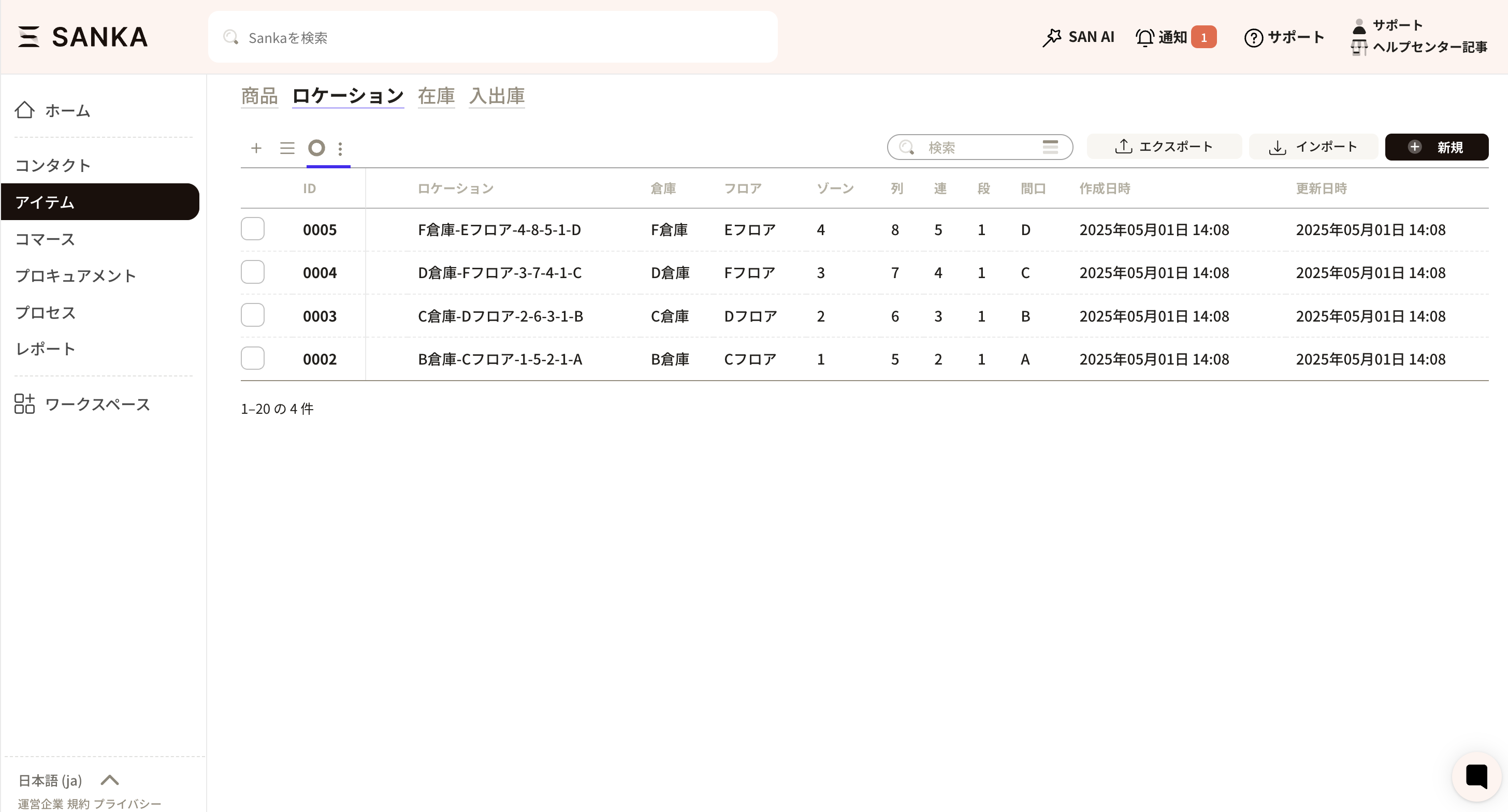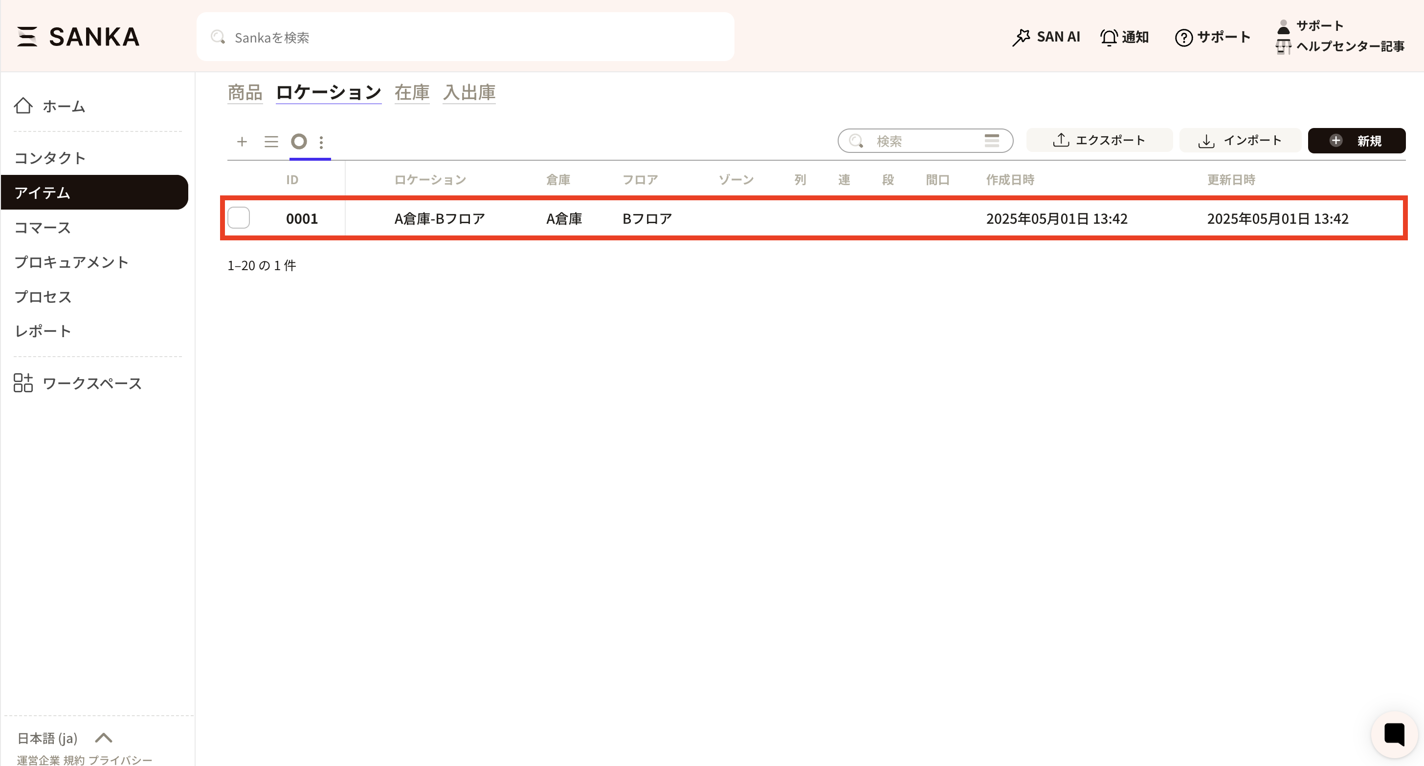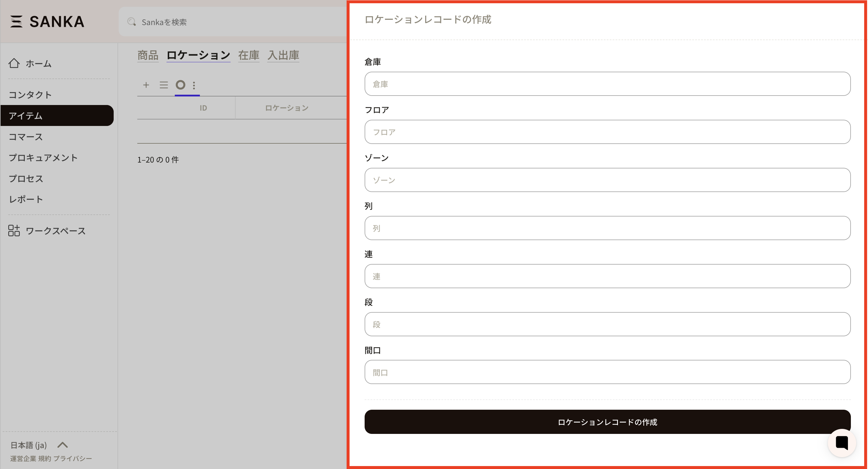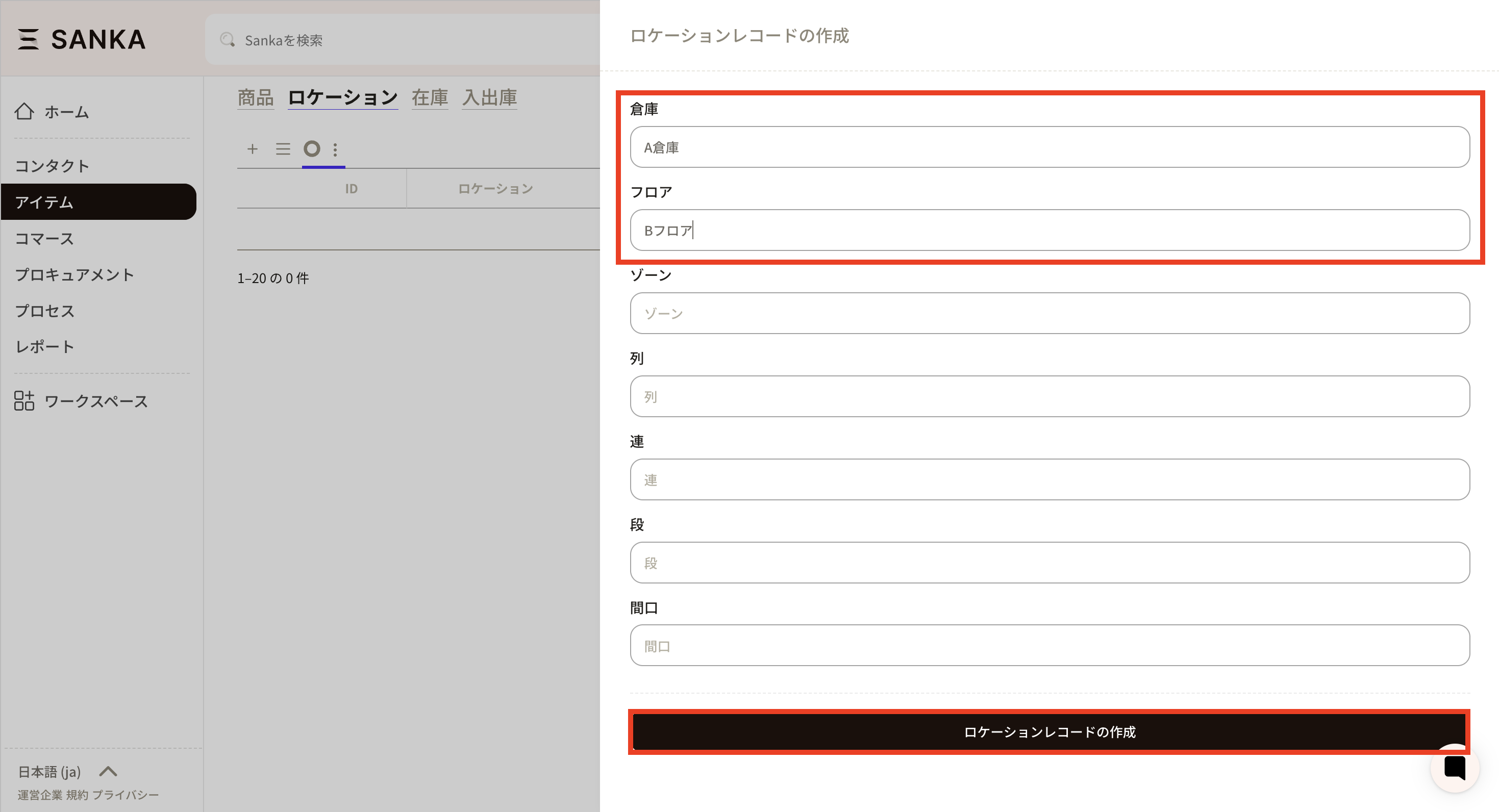 ③倉庫、フロア、ゾーン、列、連、段、間口の登録ができますが、不要な欄は空白で問題ありません。 ここでは、例として「A倉庫、Bフロア」を入力しました。入力が終わったら、「作成」をクリックしてください。