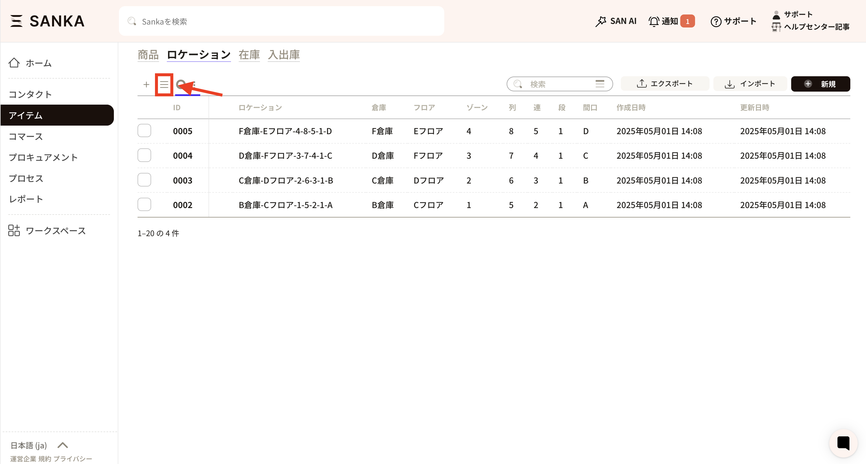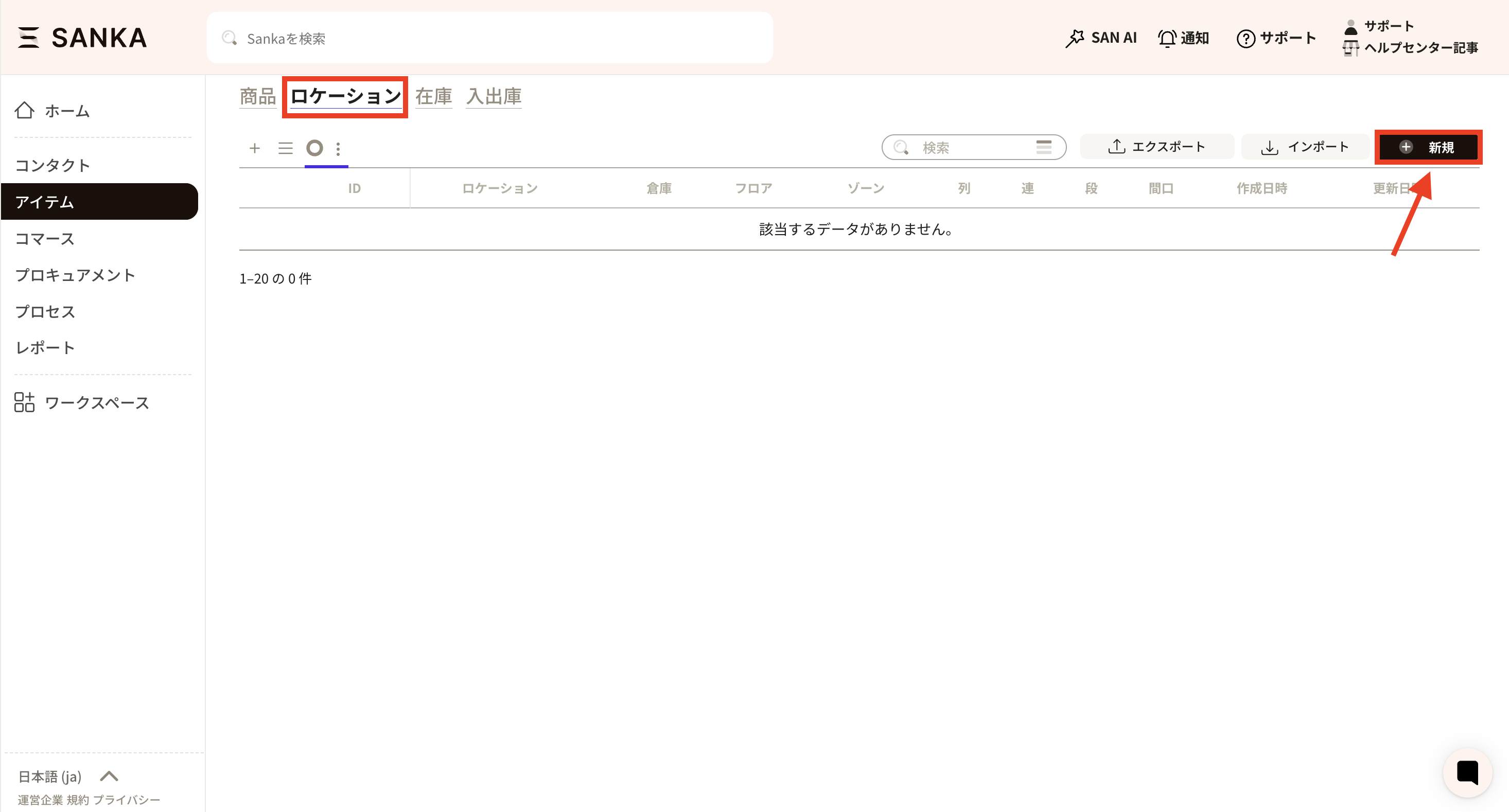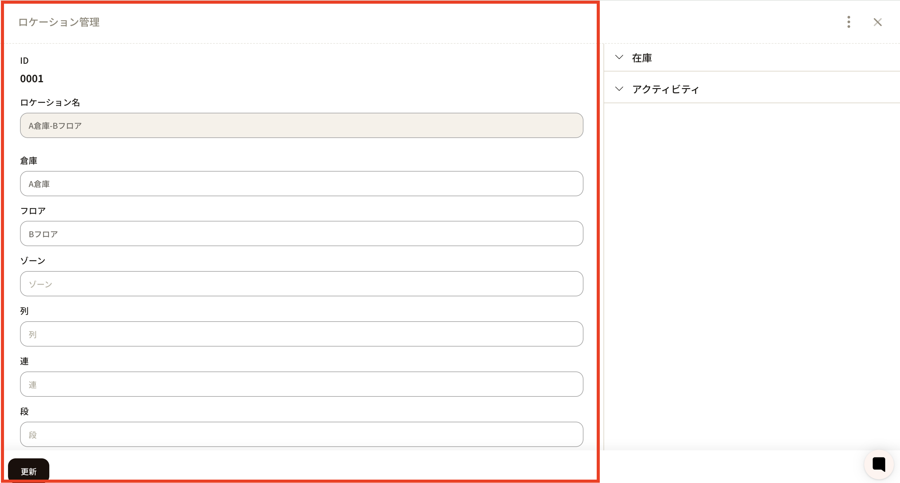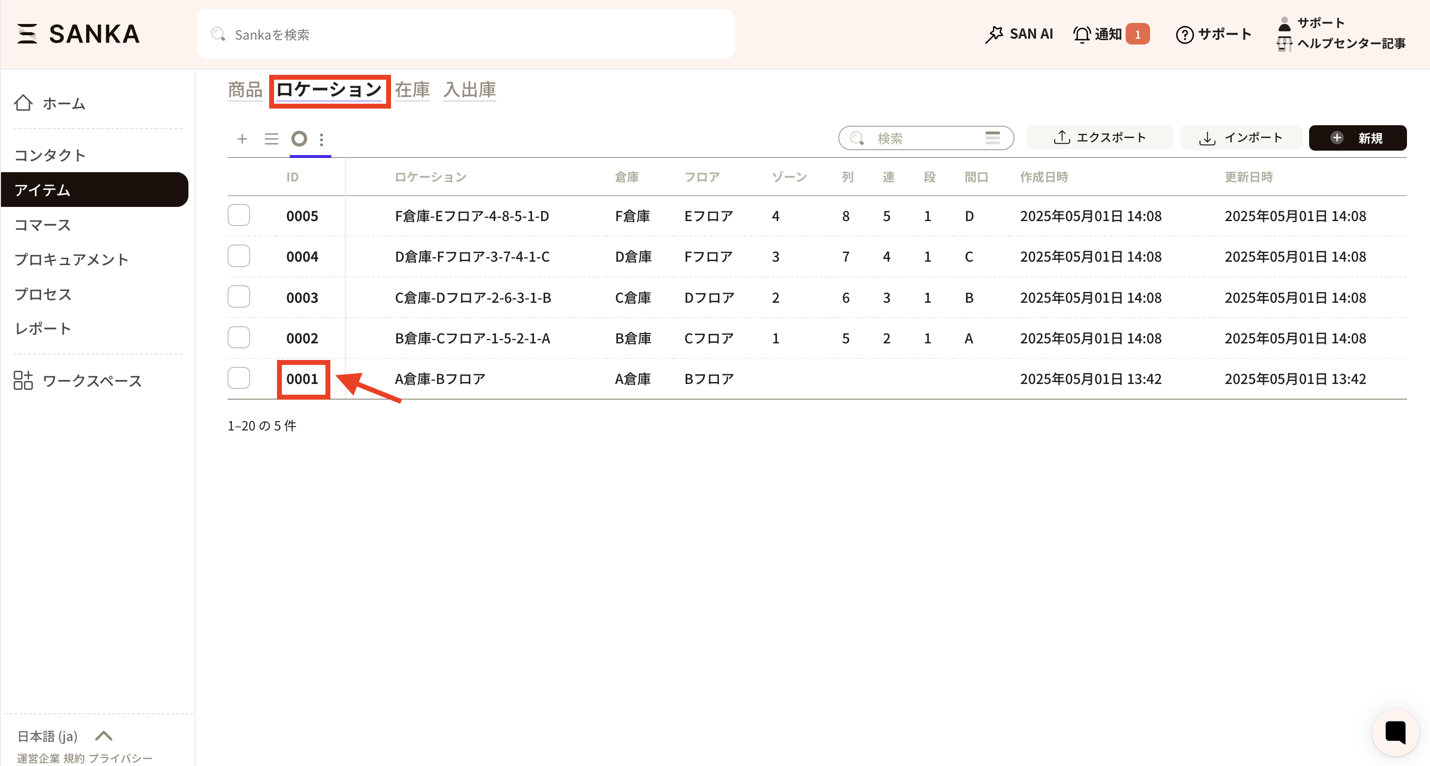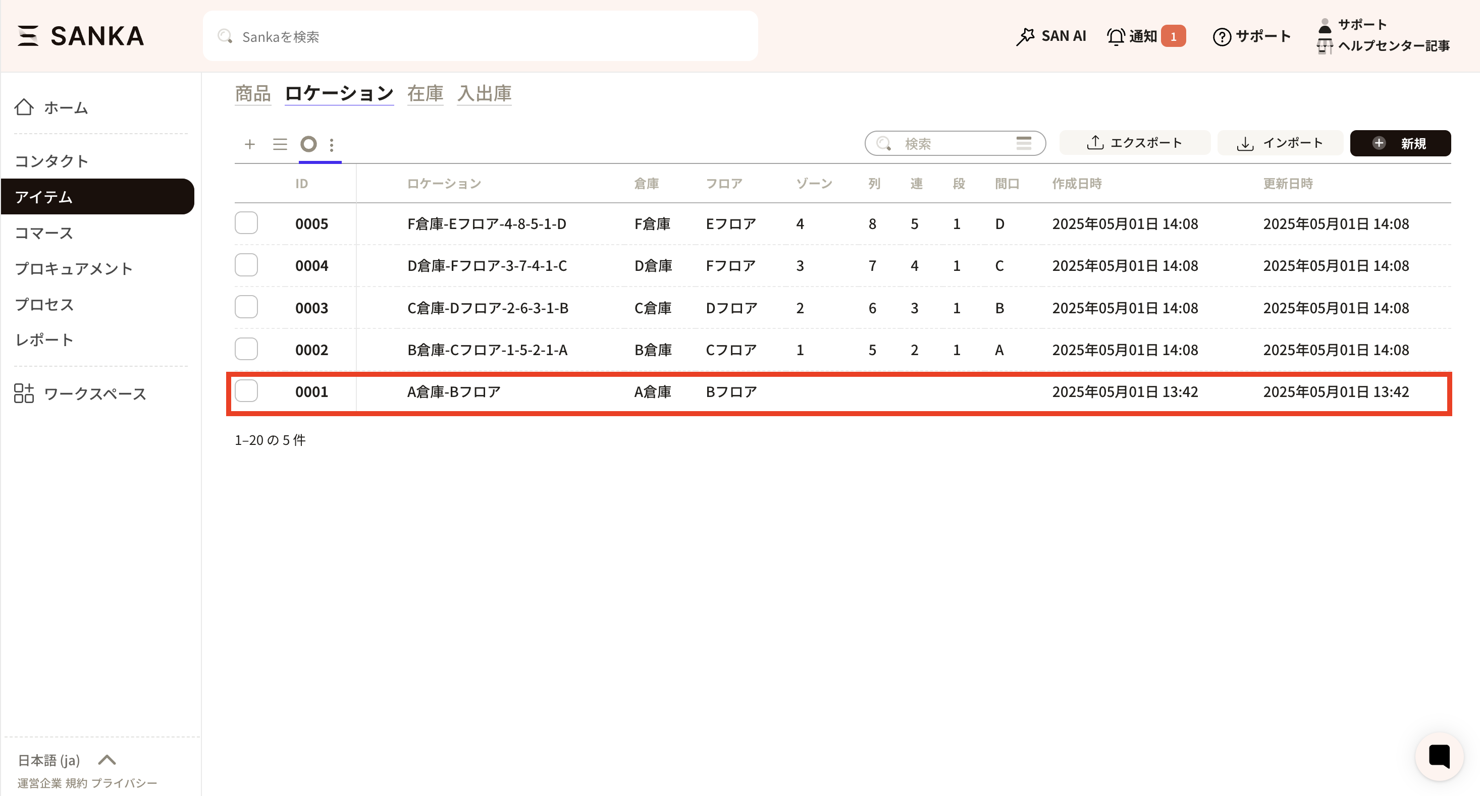 ③倉庫、フロア、ゾーン、列、連、段、間口の登録ができますが、不要な欄は空白で問題ありません。 ここでは、例として「A倉庫、Bフロア」を入力しました。入力が終わったら、「作成」をクリックしてください。
