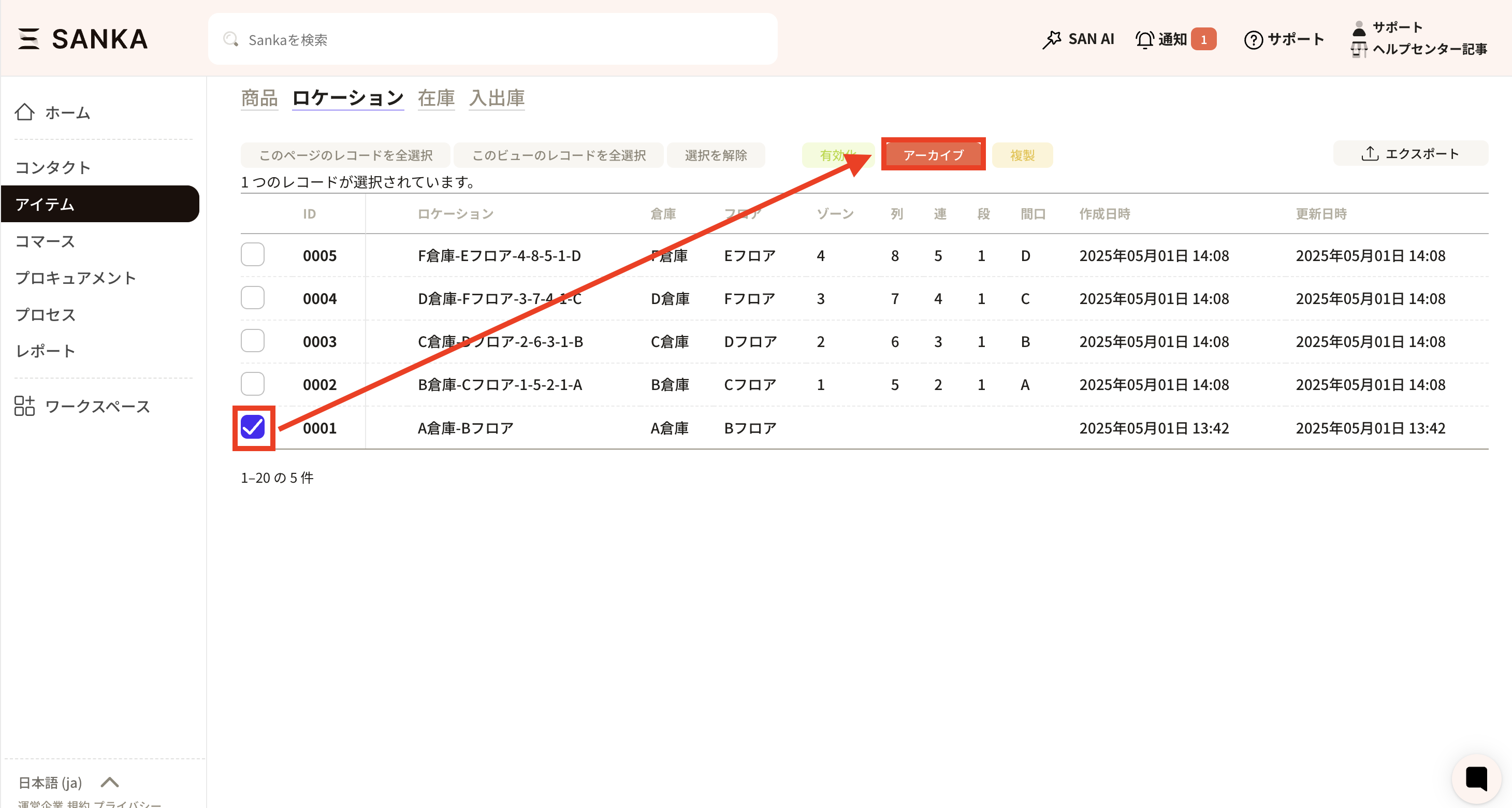 ②アーカイブを選択するといままでにアーカイブしたレコードを見ることができます。