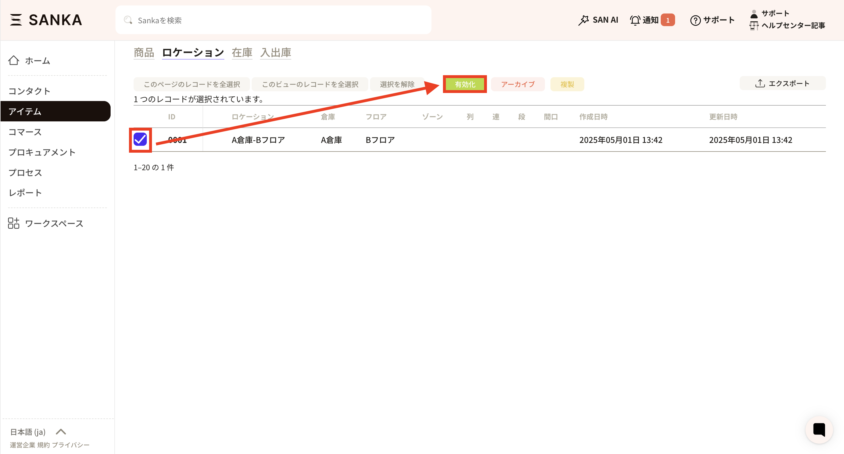 ③アーカイブしたレコード一覧から元に戻したいレコードのチェックボックスをクリックし、「有効化」ボタンを選択します。