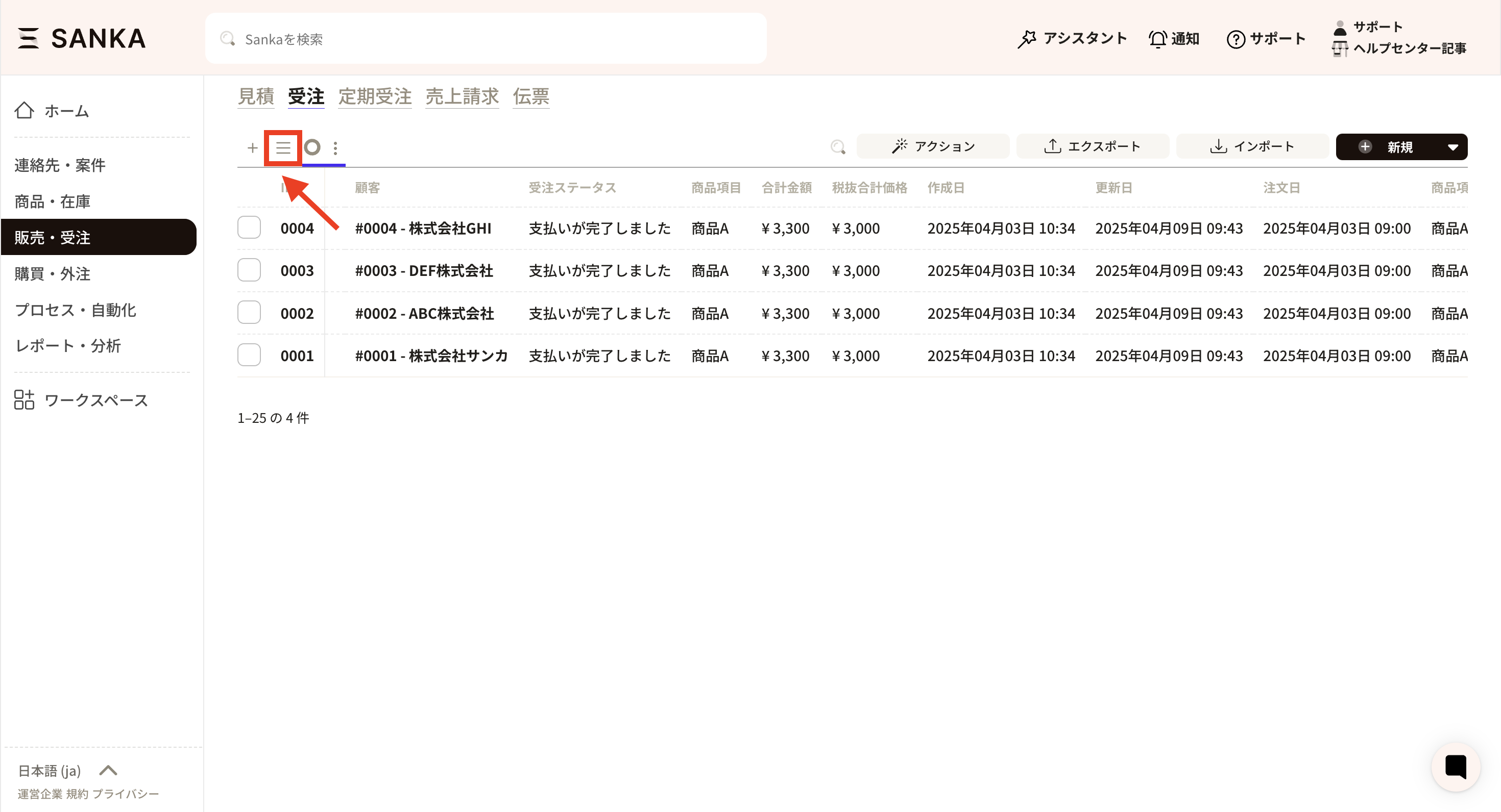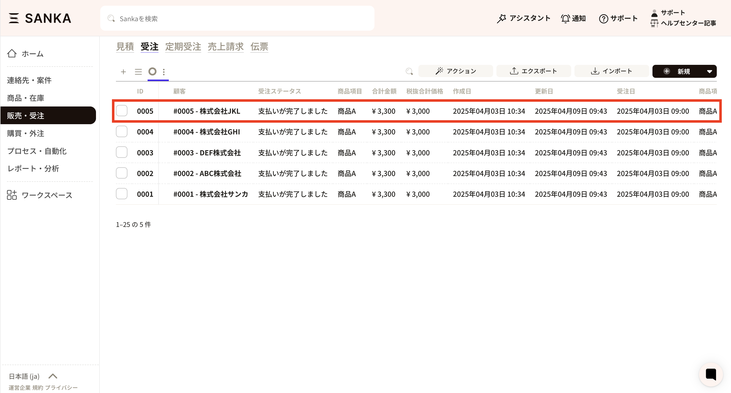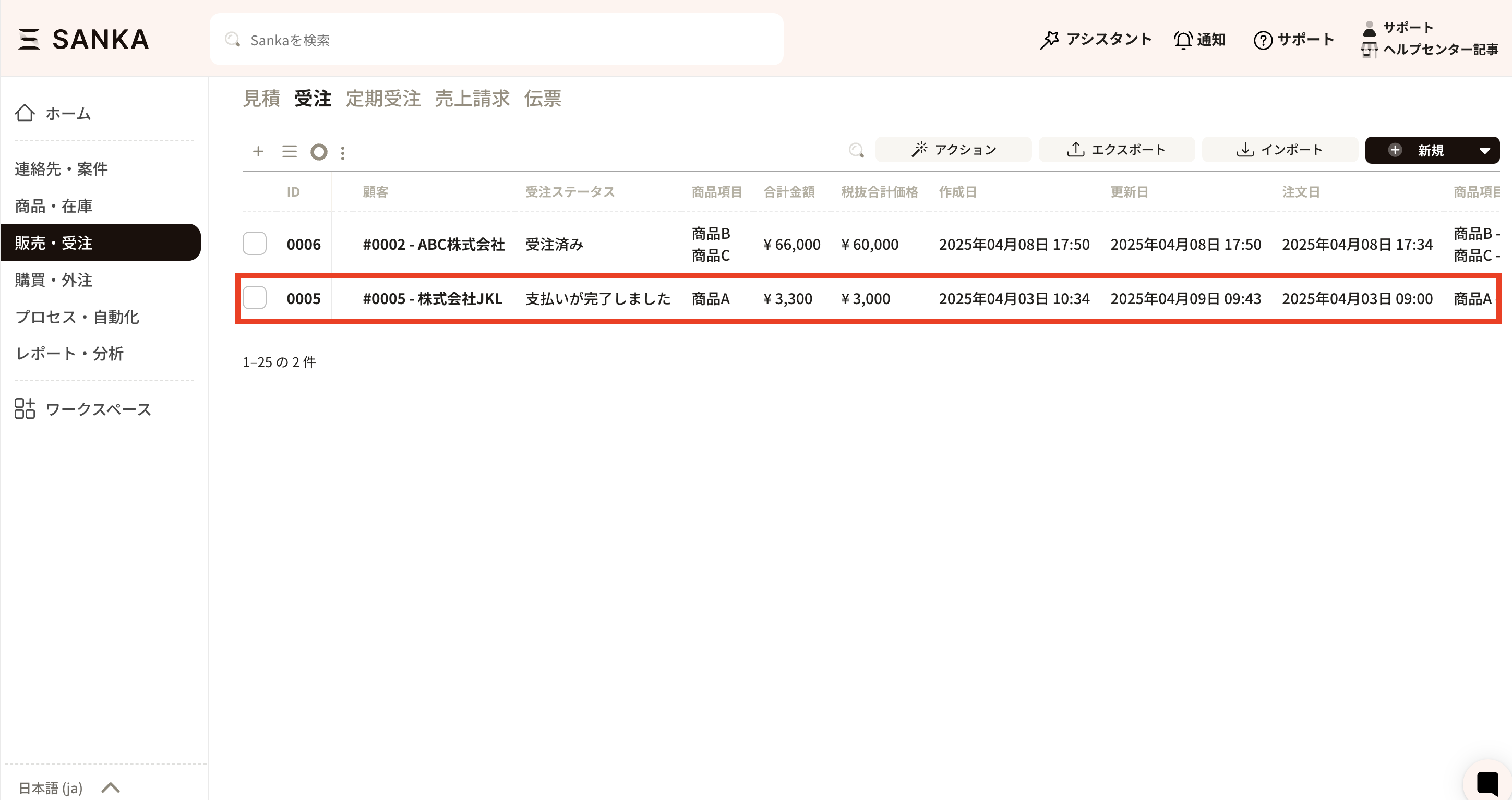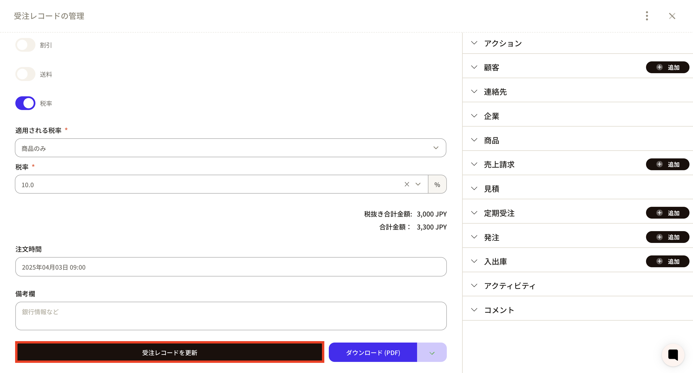 ③最後に下部にある「受注レコードを更新」をクリックすると更新されます。