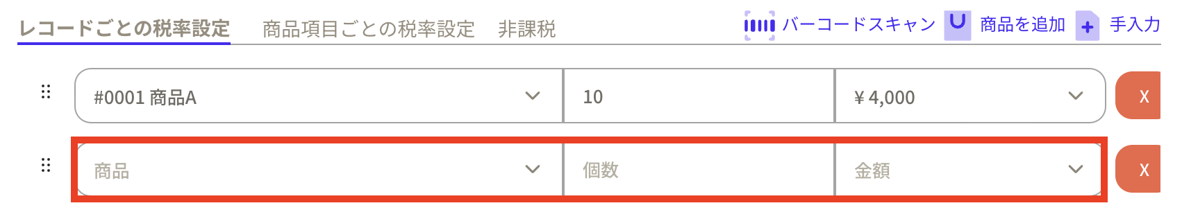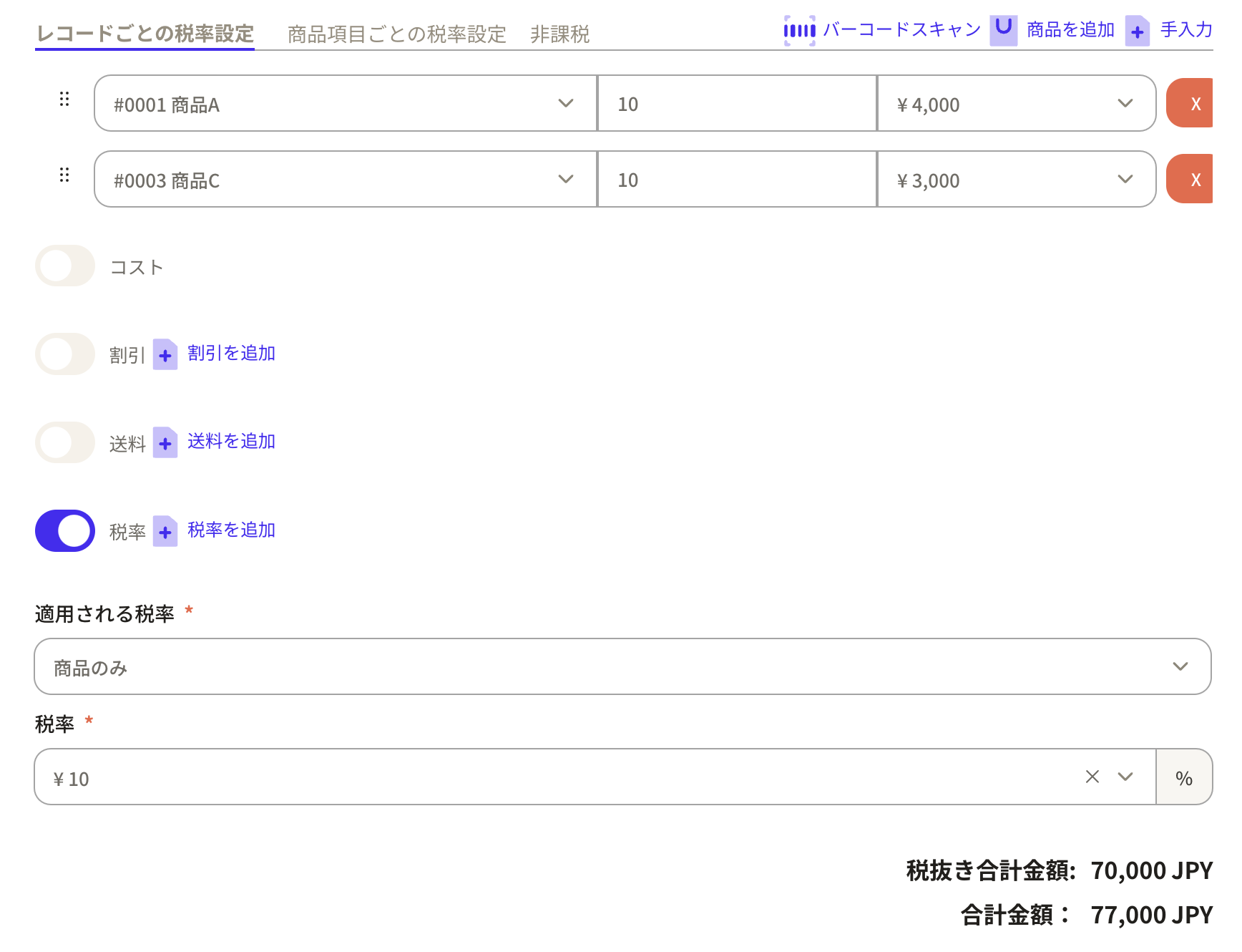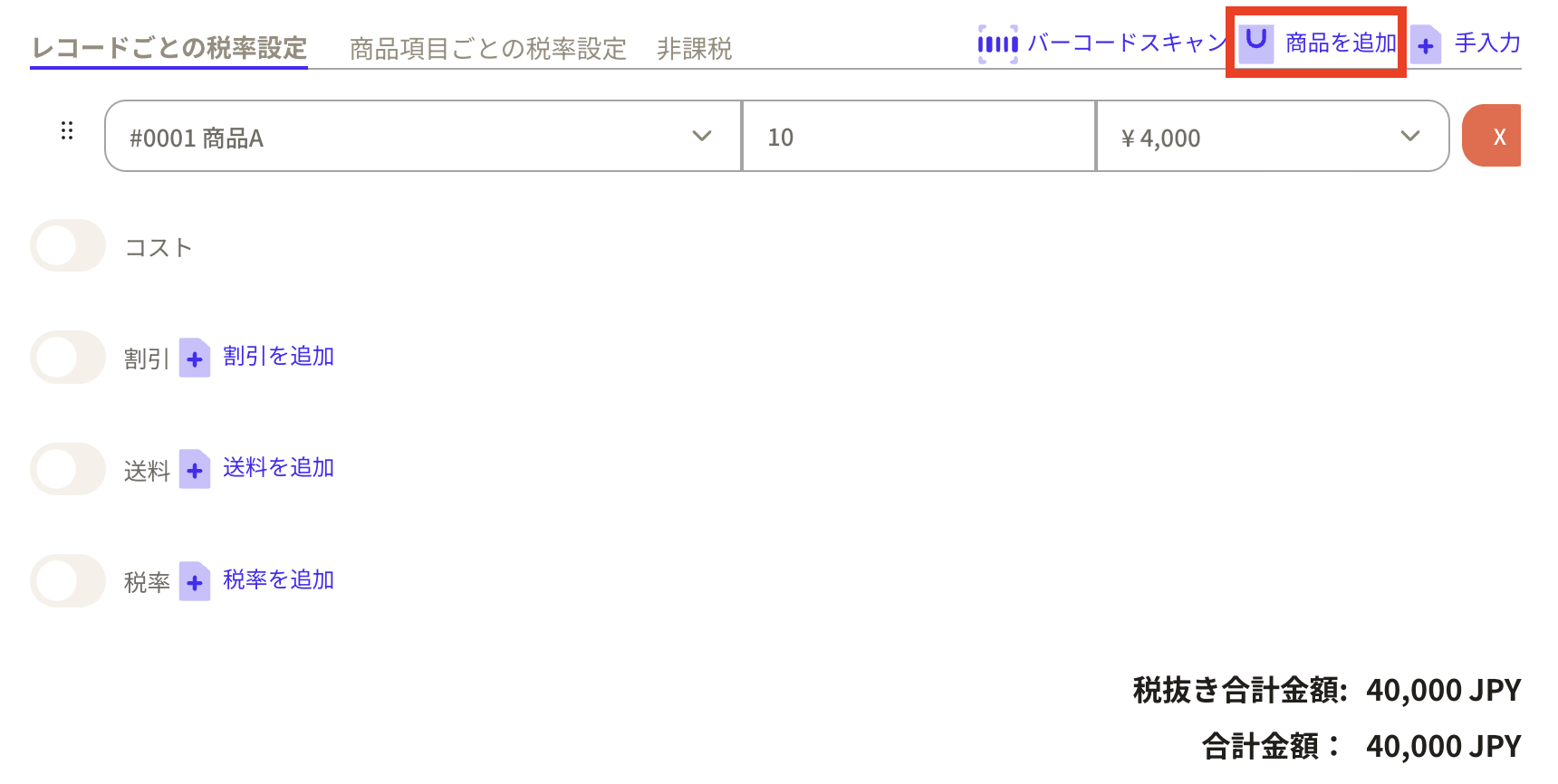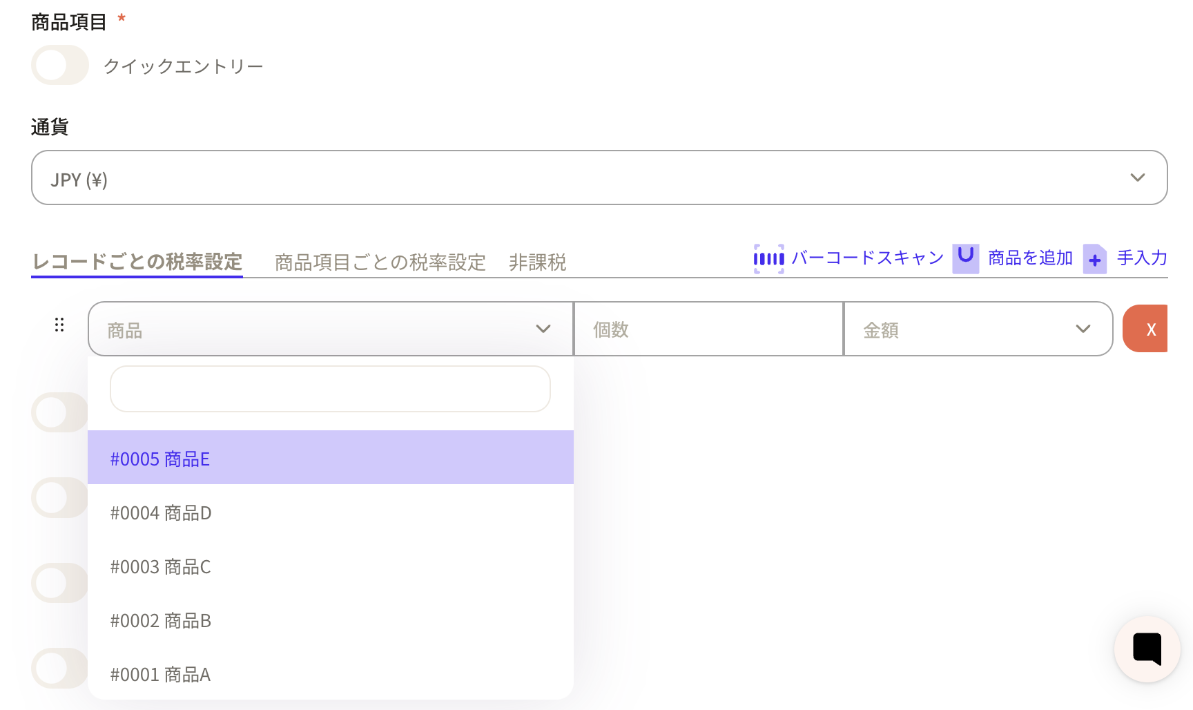 ⑧税率を設定したら商品入力枠に情報をいれていきます。「商品」部分を選択すると、すでに商品オブジェクトに登録済みの商品が選択肢に表示されます。商品を選択すると金額が自動で入ります。