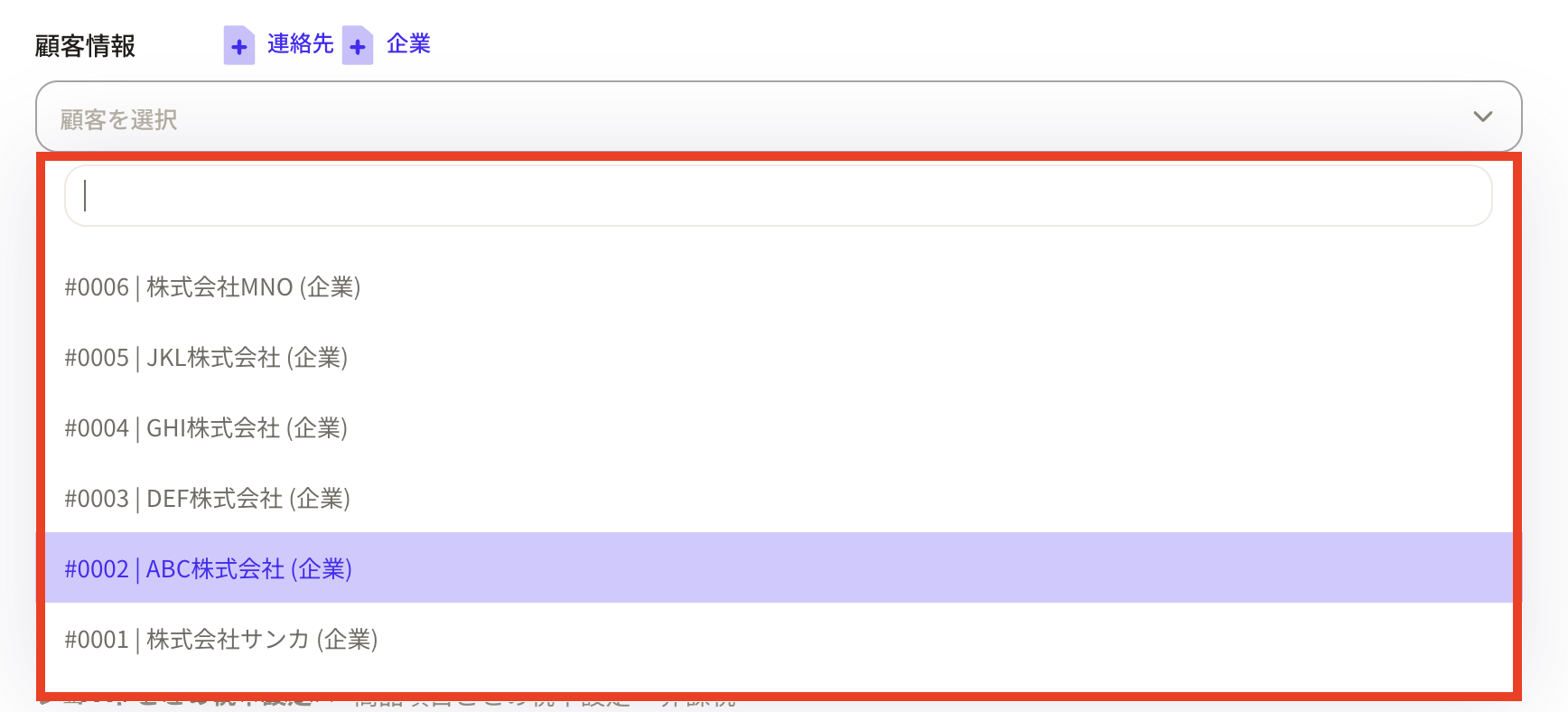 ③まずは「顧客情報」を登録します。顧客を選択の枠をクリックすると、企業オブジェクトと連絡先オブジェクトに登録されている取引先情報が表示されます。該当するものを選びます。