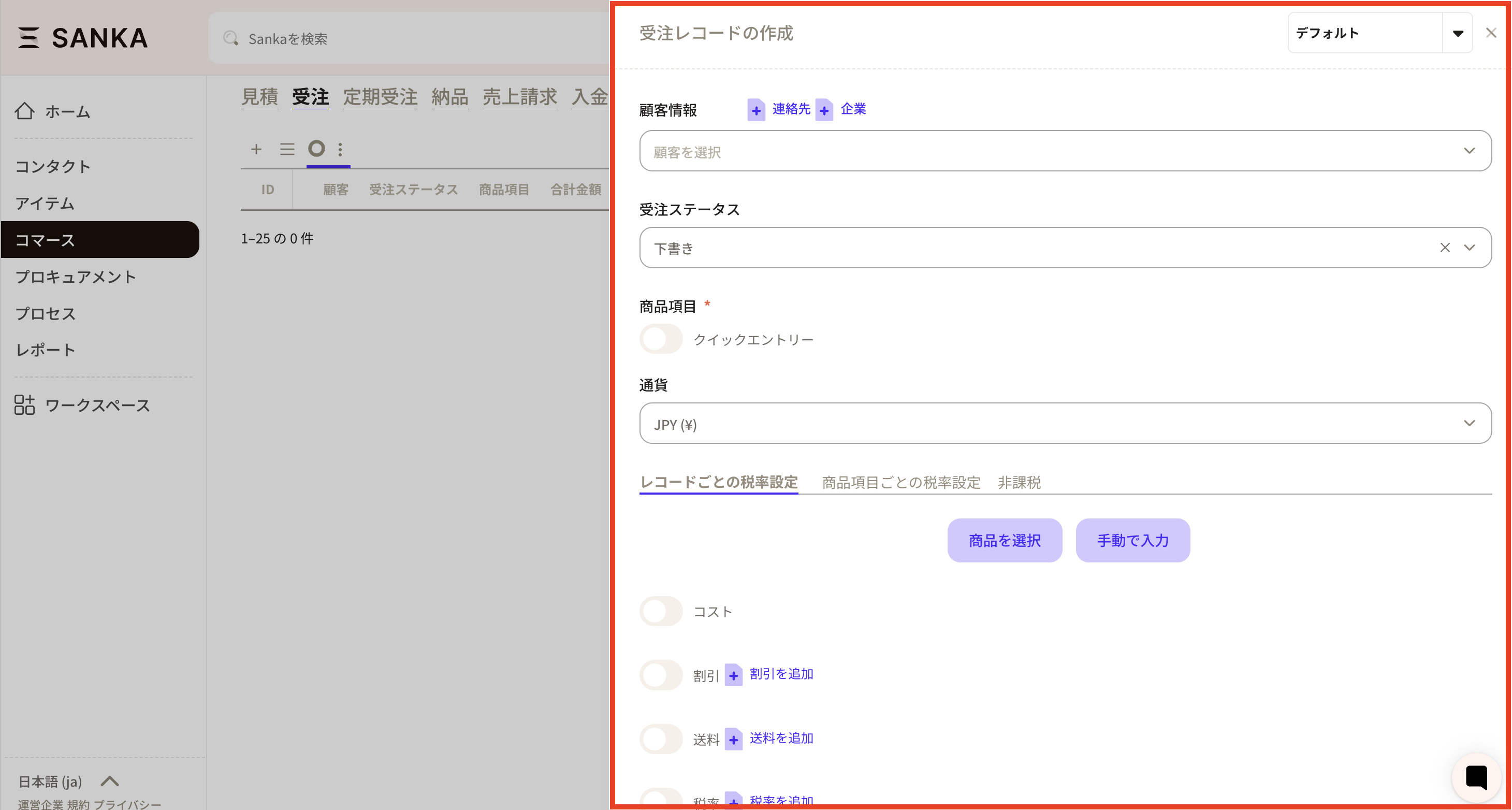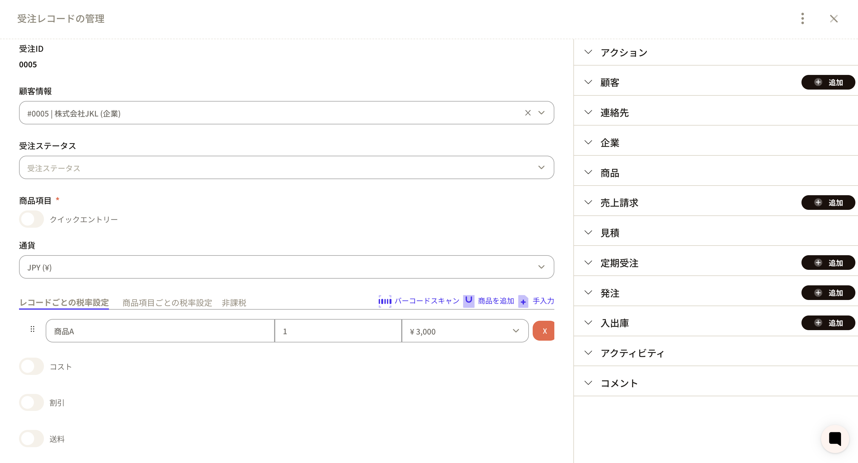 ②「受注レコードの作成」画面が表示されるので、必要事項を入力していきます**。**