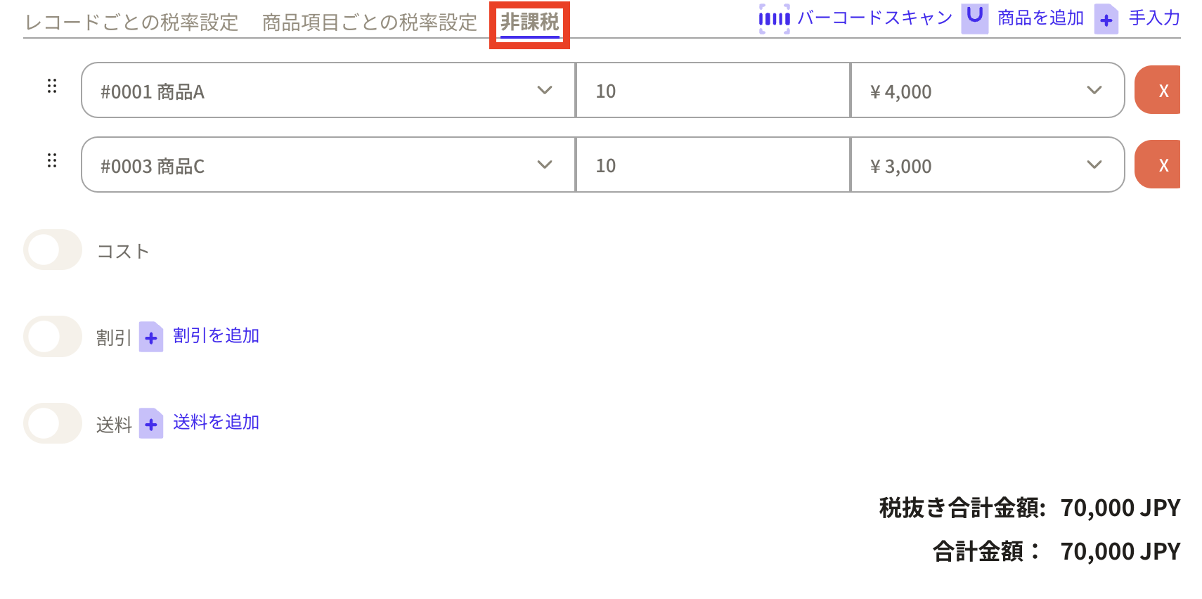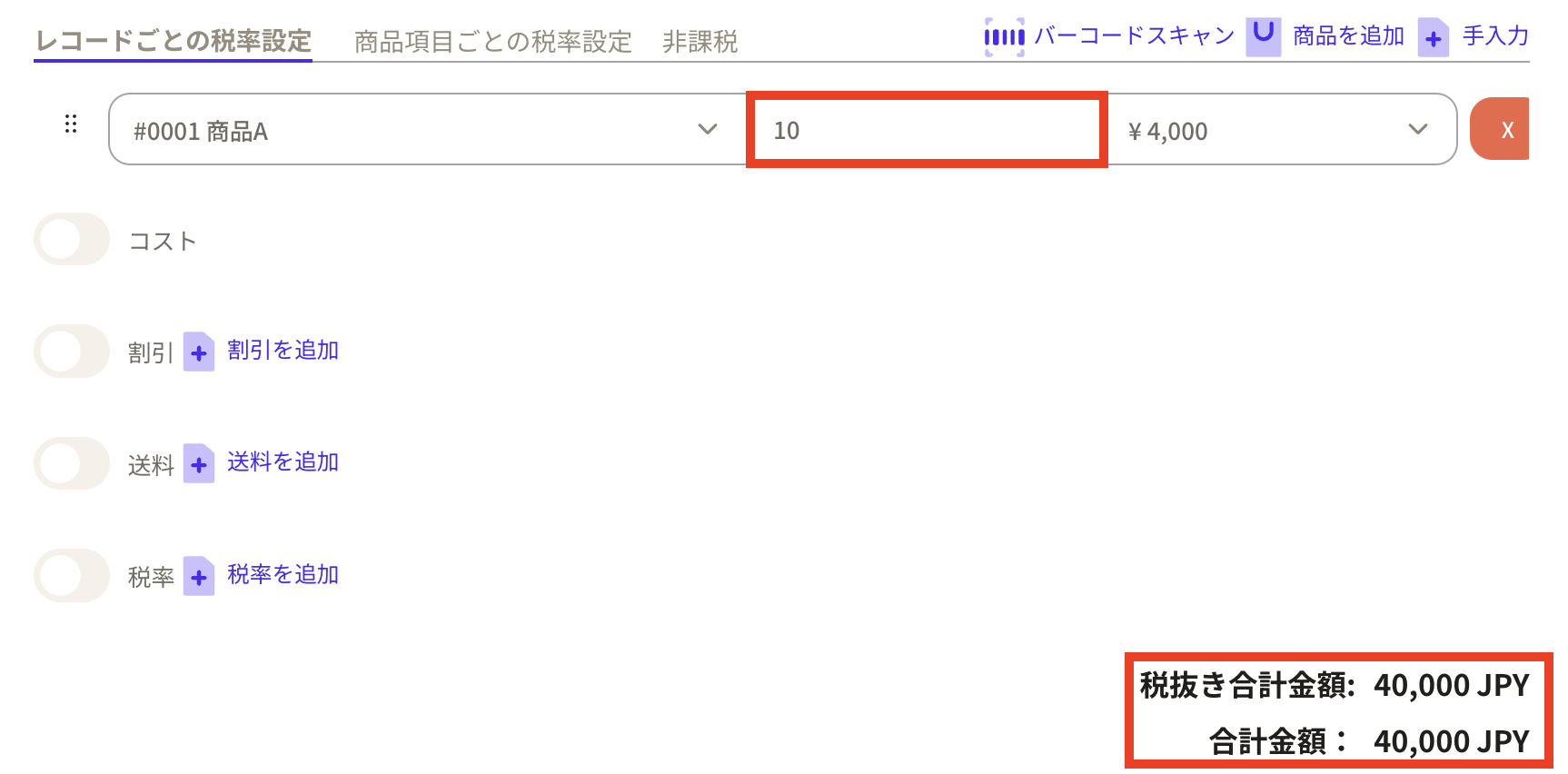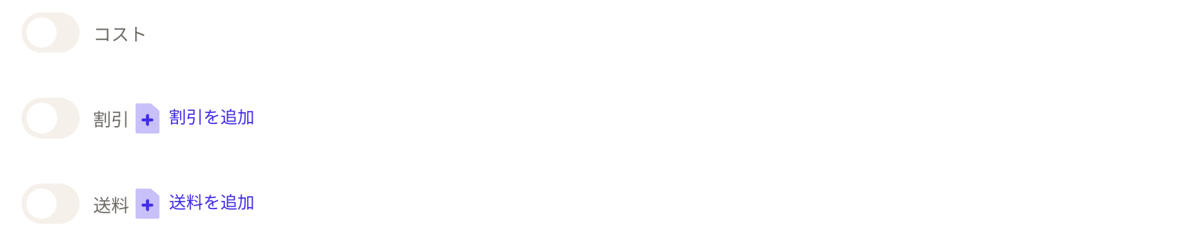 ⑩コスト、割引、送料を入力したい場合は、オンにすると枠が表示されます。