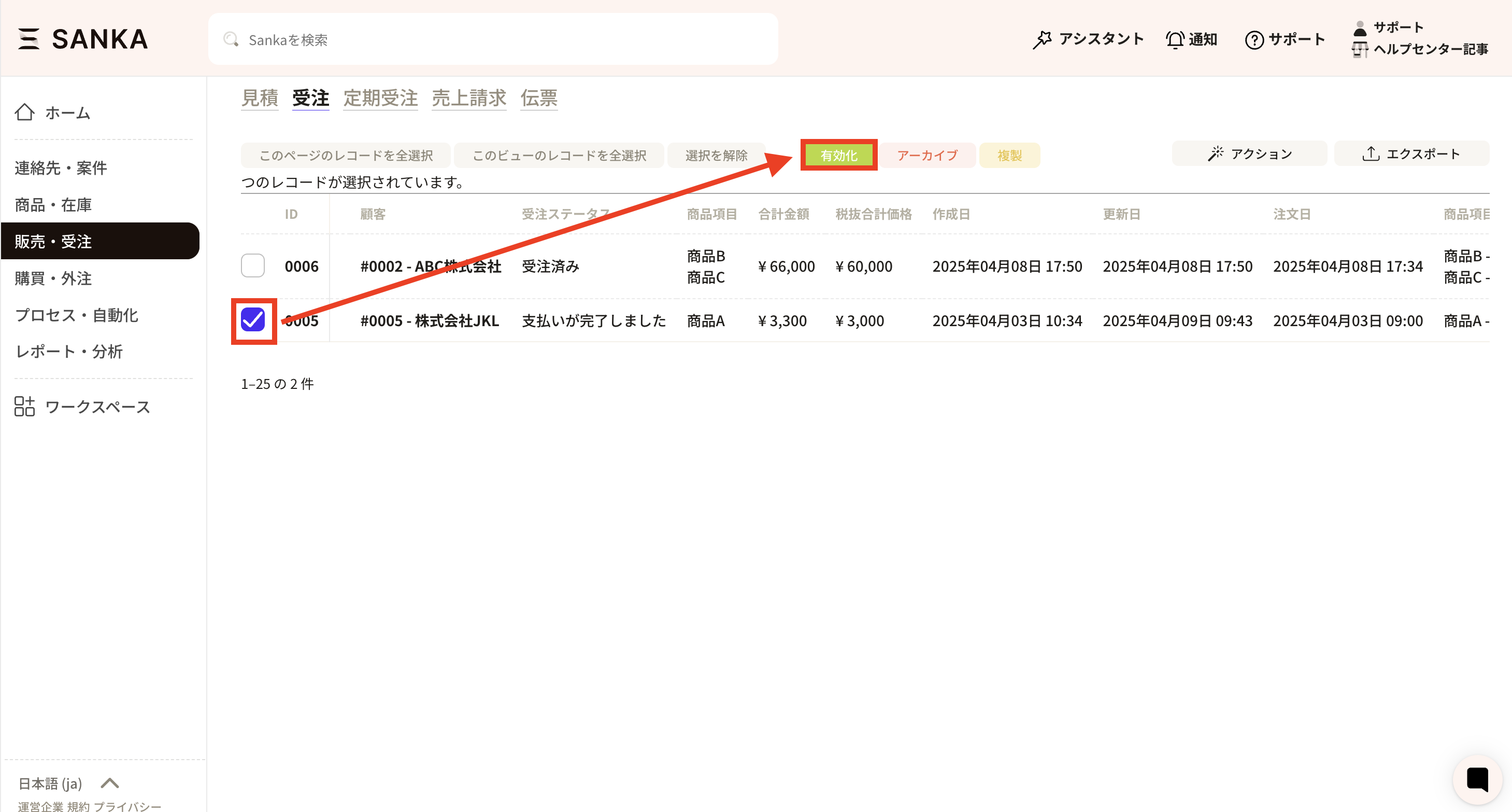 ⑨アーカイブされていたレコードが有効化されレコード一覧テーブルに表示されました。