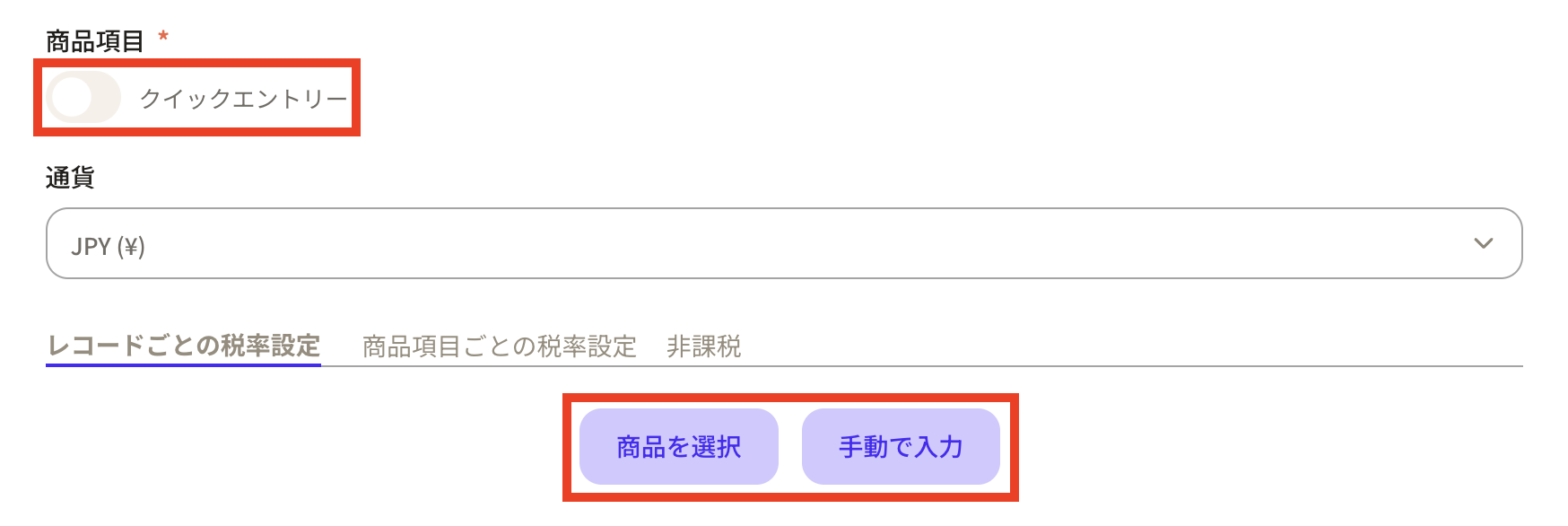 ⑤つぎに商品情報を登録していきます。商品項目登録には、金額情報だけをいれる「クイックエントリー」、登録済みデータを用いて商品情報を入力する「商品を選択」、手動で商品情報を入力する「手動で入力」があります。