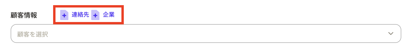 ※取引先の情報がない場合は、「+連絡先」「+企業」ボタンから直接追加することも可能です。ここで登録したものは該当オブジェクトに登録されます。