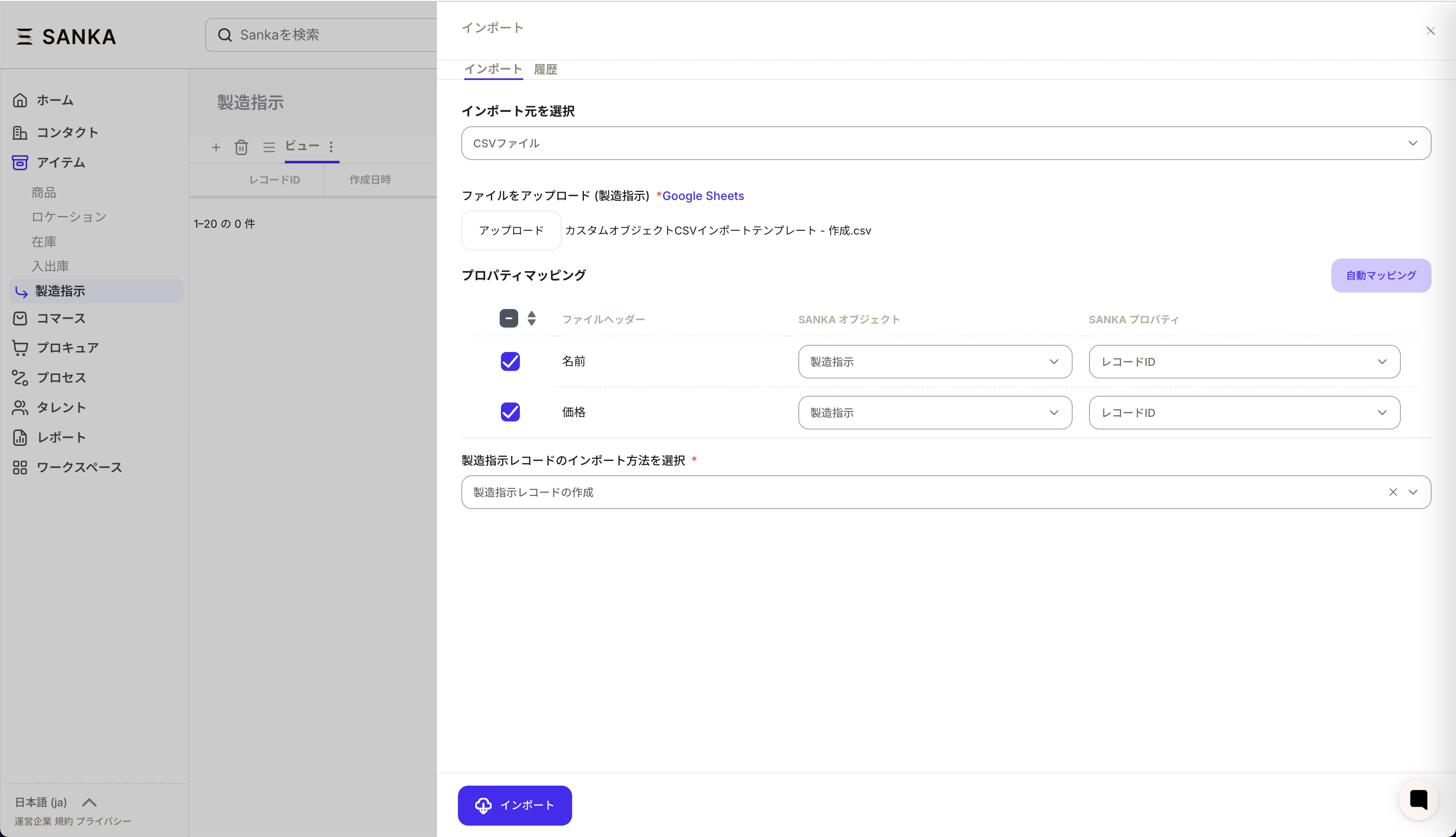 - マッピングテーブルで、CSVの列(ヘッダー)とSankaのプロパティを対応付けます。
