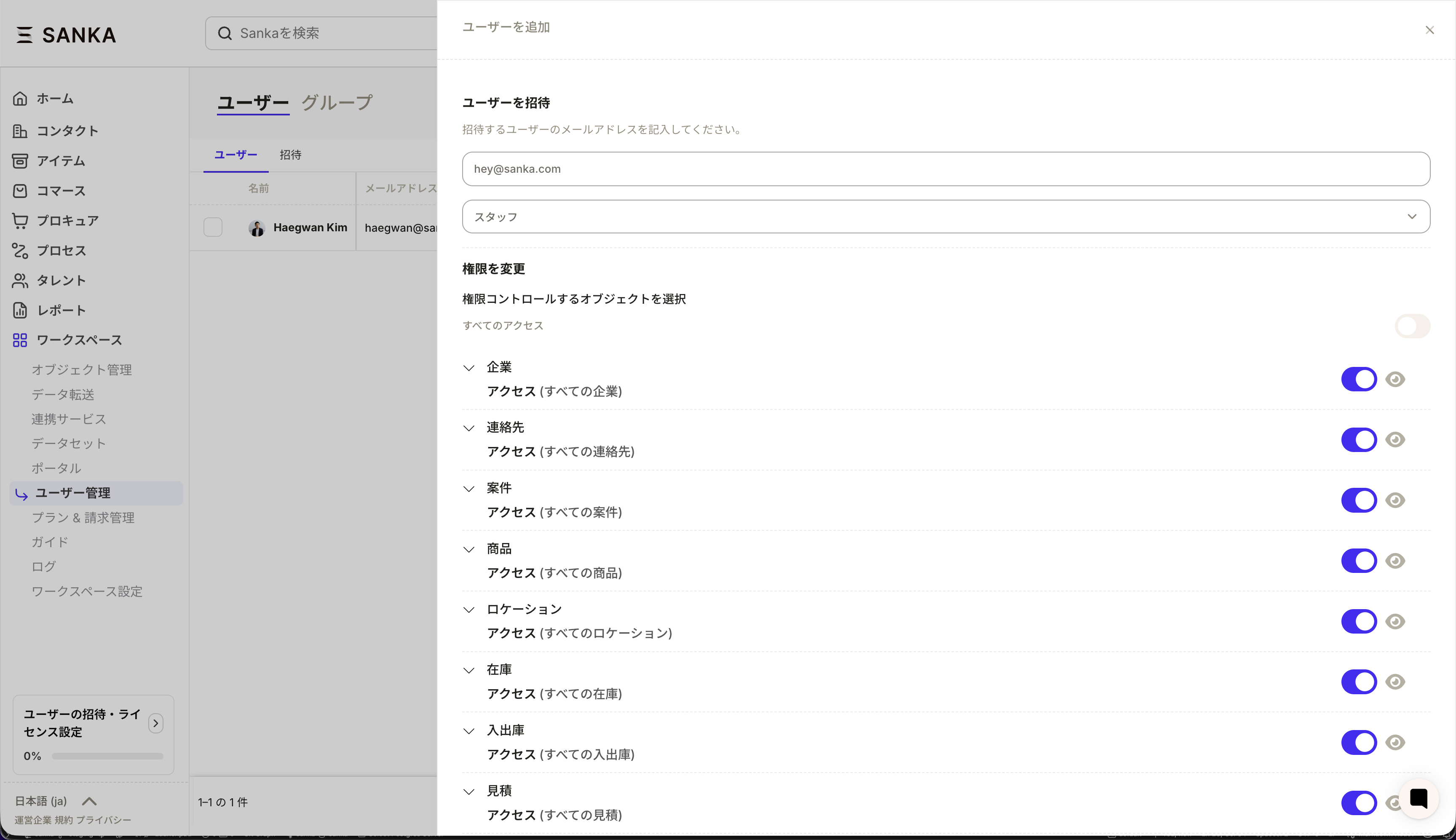 Sankaの左側にあるメニューから「ワークスペース」>「ユーザー管理」をクリックして、ユーザー管理画面に移動します。※ユーザー追加はアドミン権限者しかできません