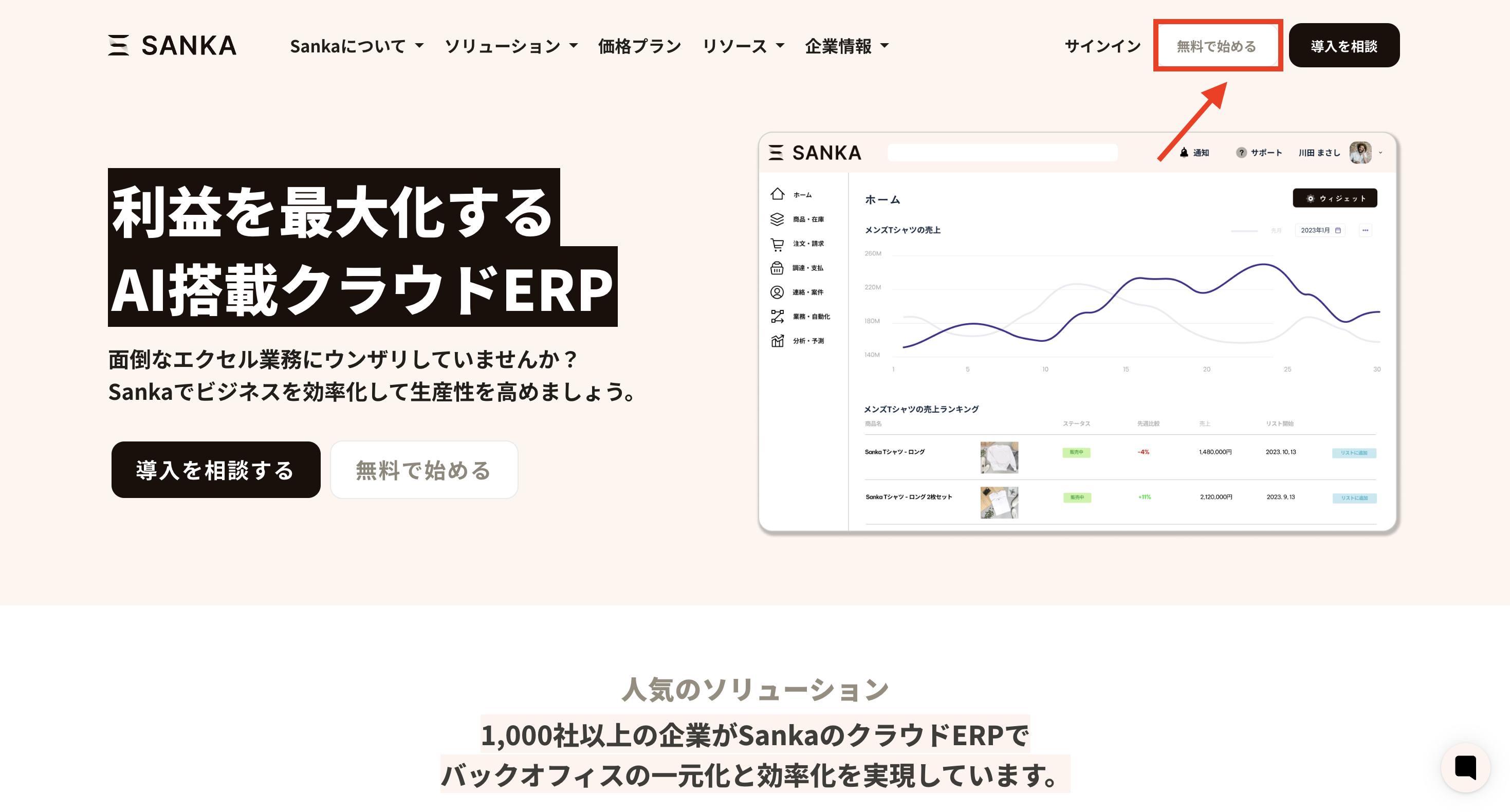 スタータープランをクリックすると、すぐにアカウントが作成されます。 Sankaのアカウント作成後すぐに在庫管理、受注管理、請求管理、発注管理、といった業務を無料でお試ししていただくことができます。 これらの機能の詳細については、別途記事を用意しておりますので、そちらをご確認ください。 実際に業務を始める前にSankaの基本コンセプトを理解しておくことでよりスムーズに操作することが可能です! アカウントについてご質問や不明点がございましたら、弊社のサポートへお問い合わせください。