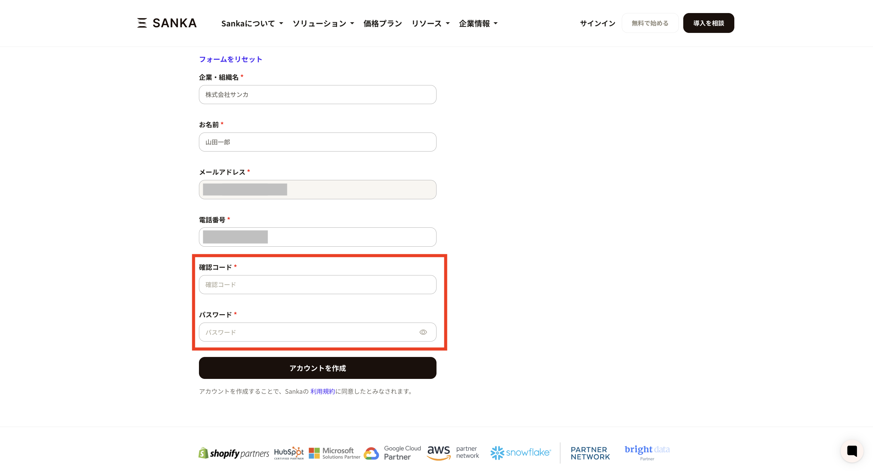 入力後、メールアドレスに認証コードが送られてきますので、そのコードをフォームに入力します。